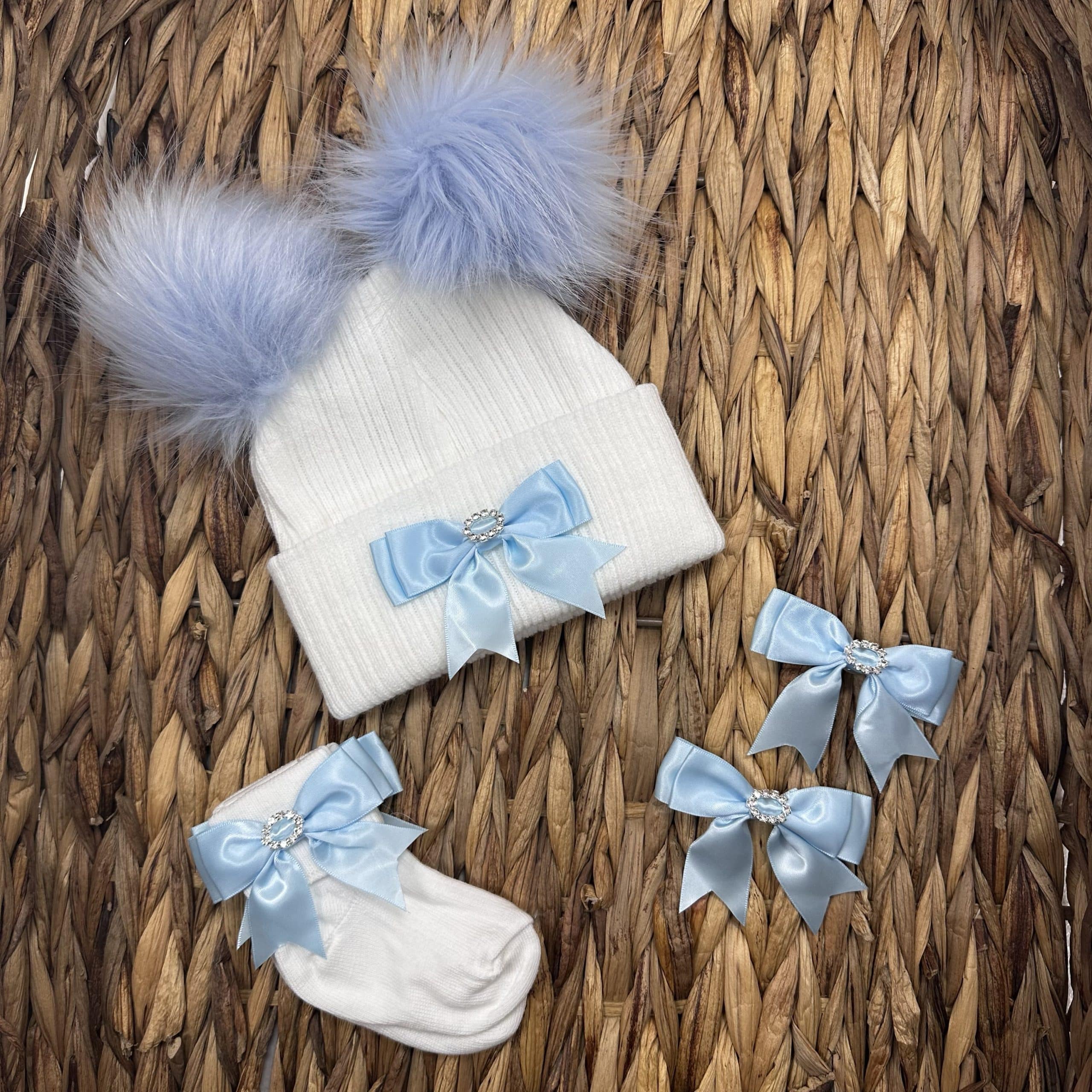 These beautiful pom pom hats are sure to keep your little one warm this winter comes with matching bow socks & Hair clips. Perfect little set. Available in many other different colours.