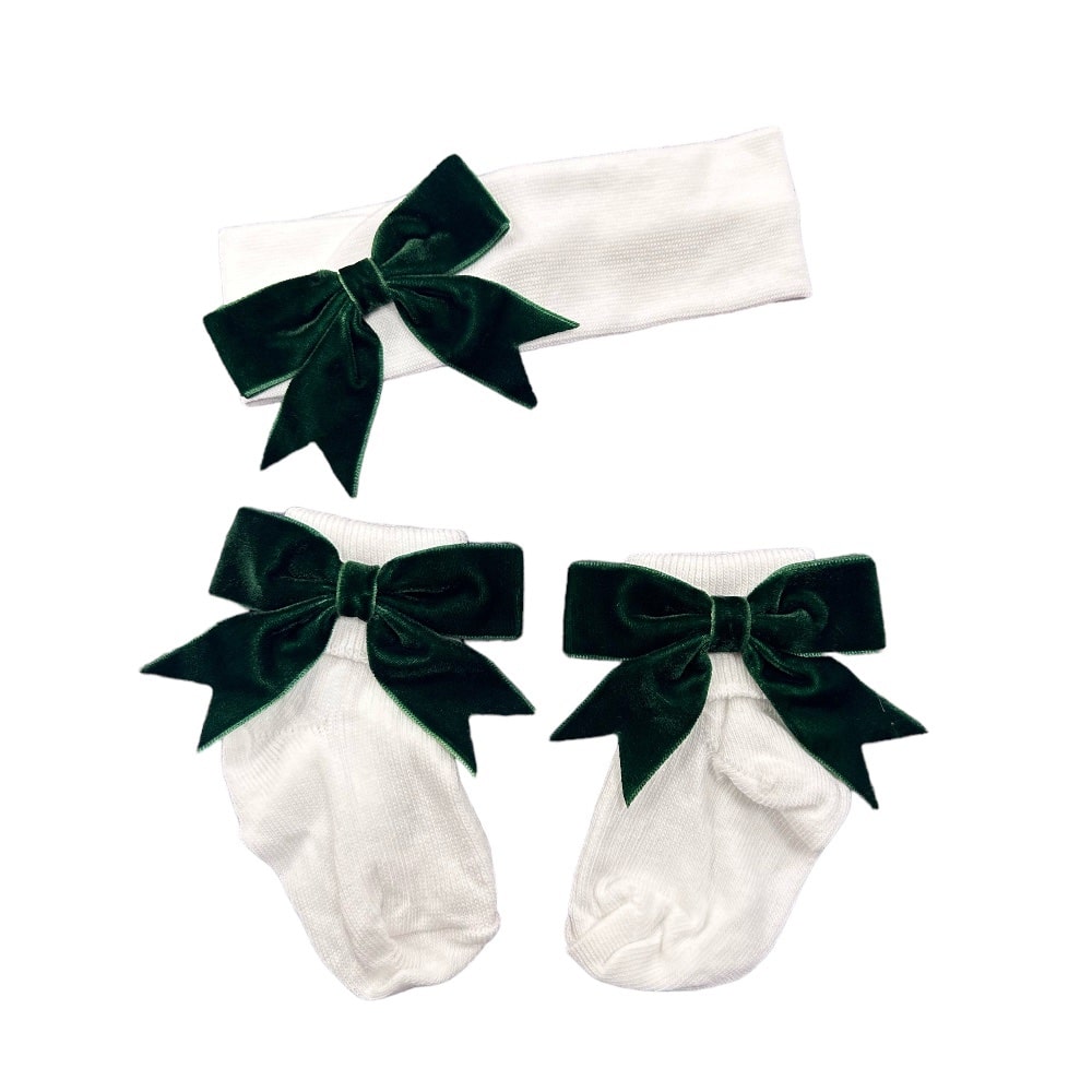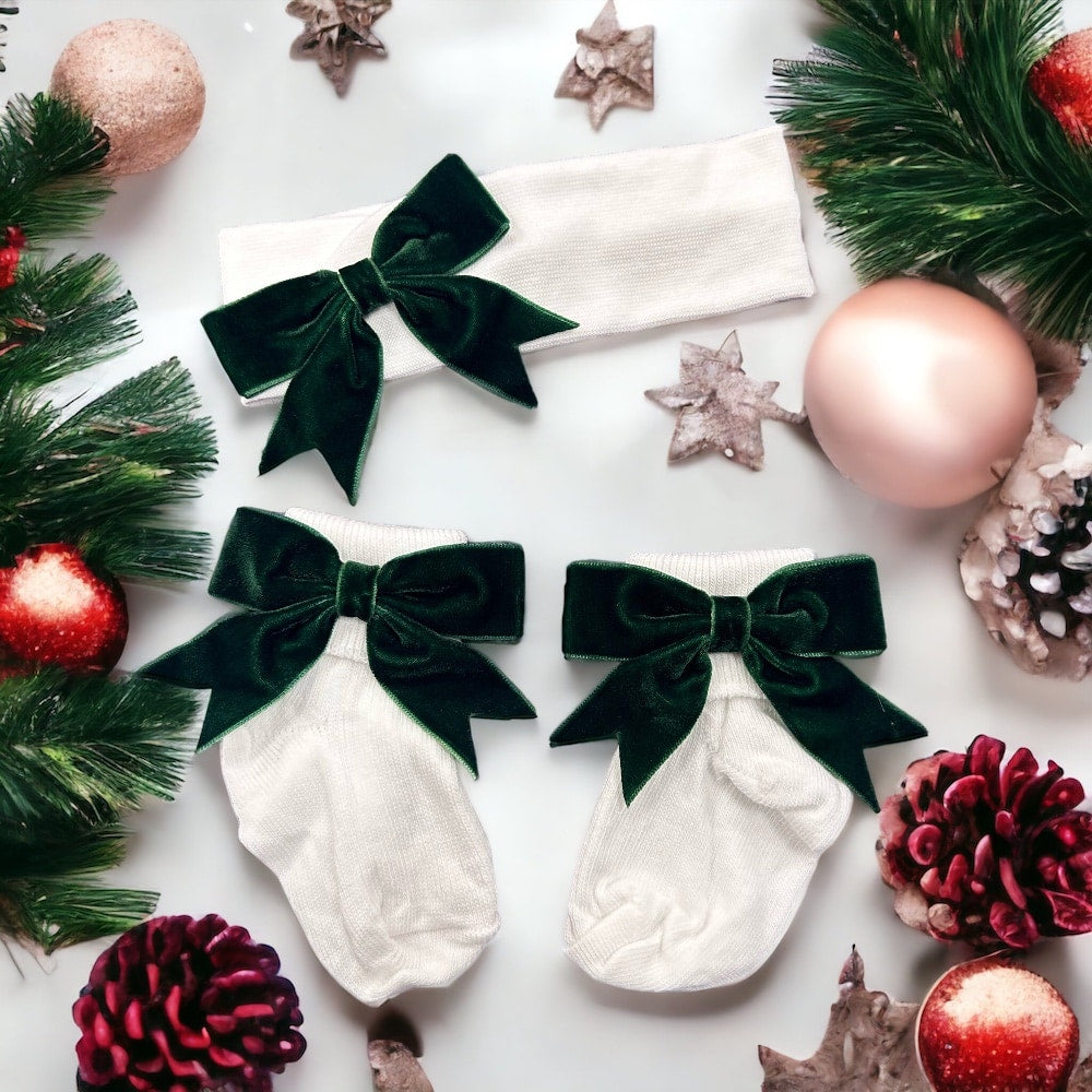 Soft Touch Girls White Ankle Socks & Headband Set - Christmas Green Velvet