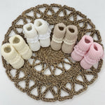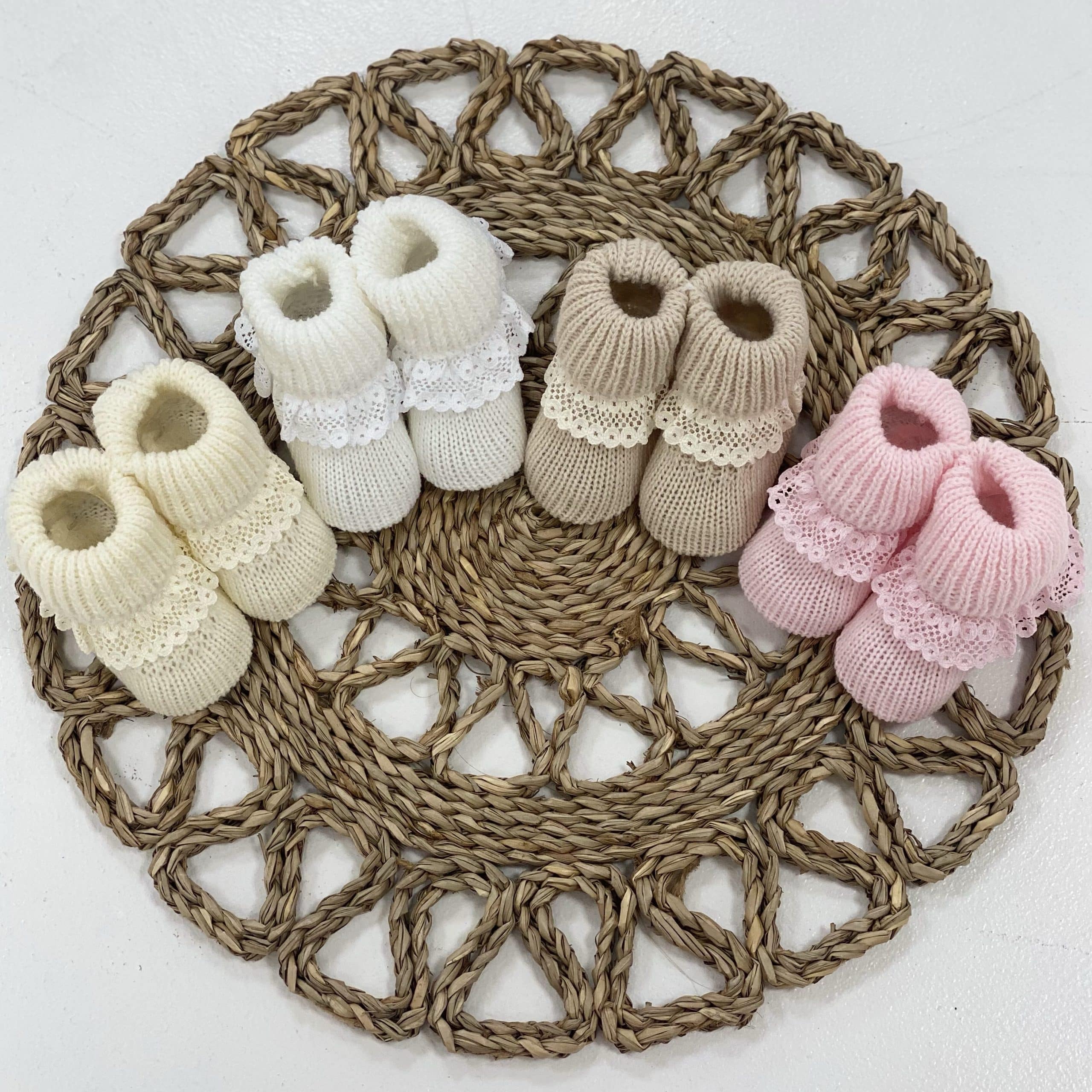 knitted lace booties from Soft Touch. The perfect gift for the new baby in your life. Also available in beige, ivory, white, and pink.