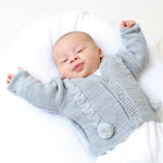 Button fastening cardigan with cable knitted trim down each side. Finished with fluffy poms at the end of the design.