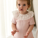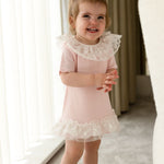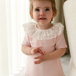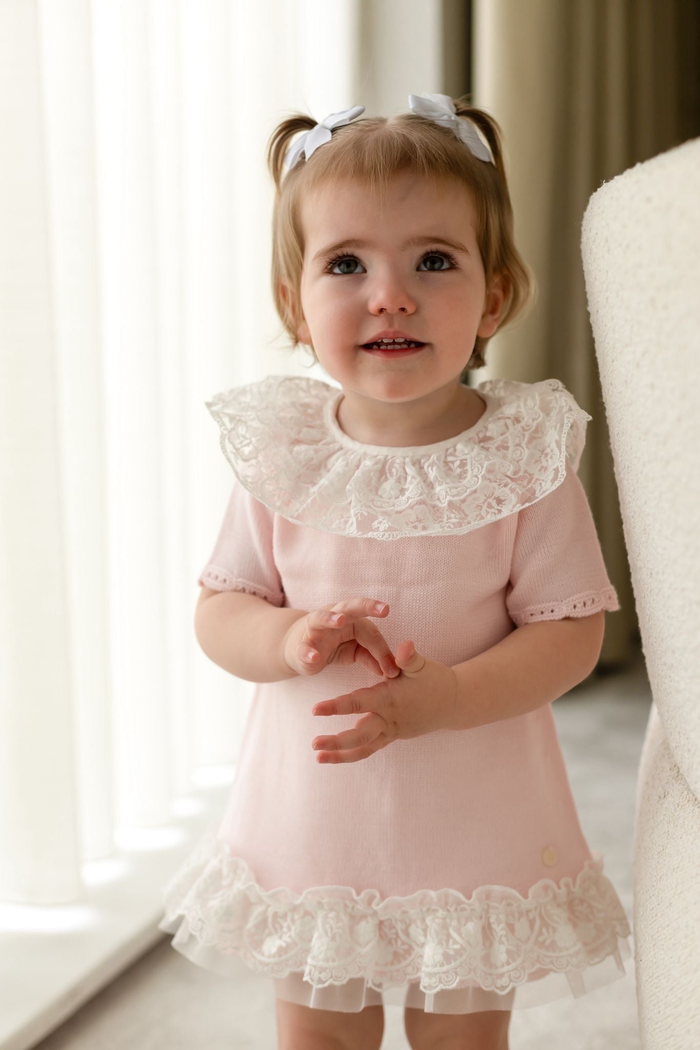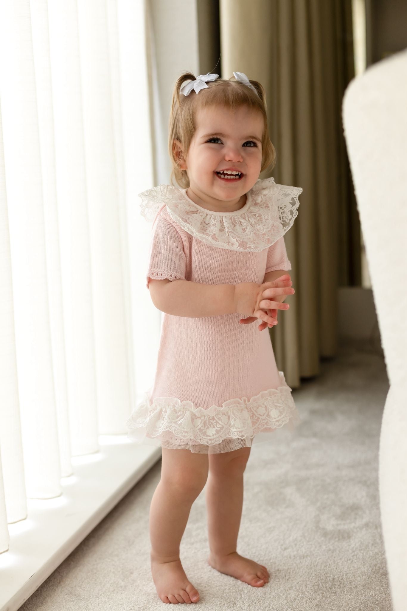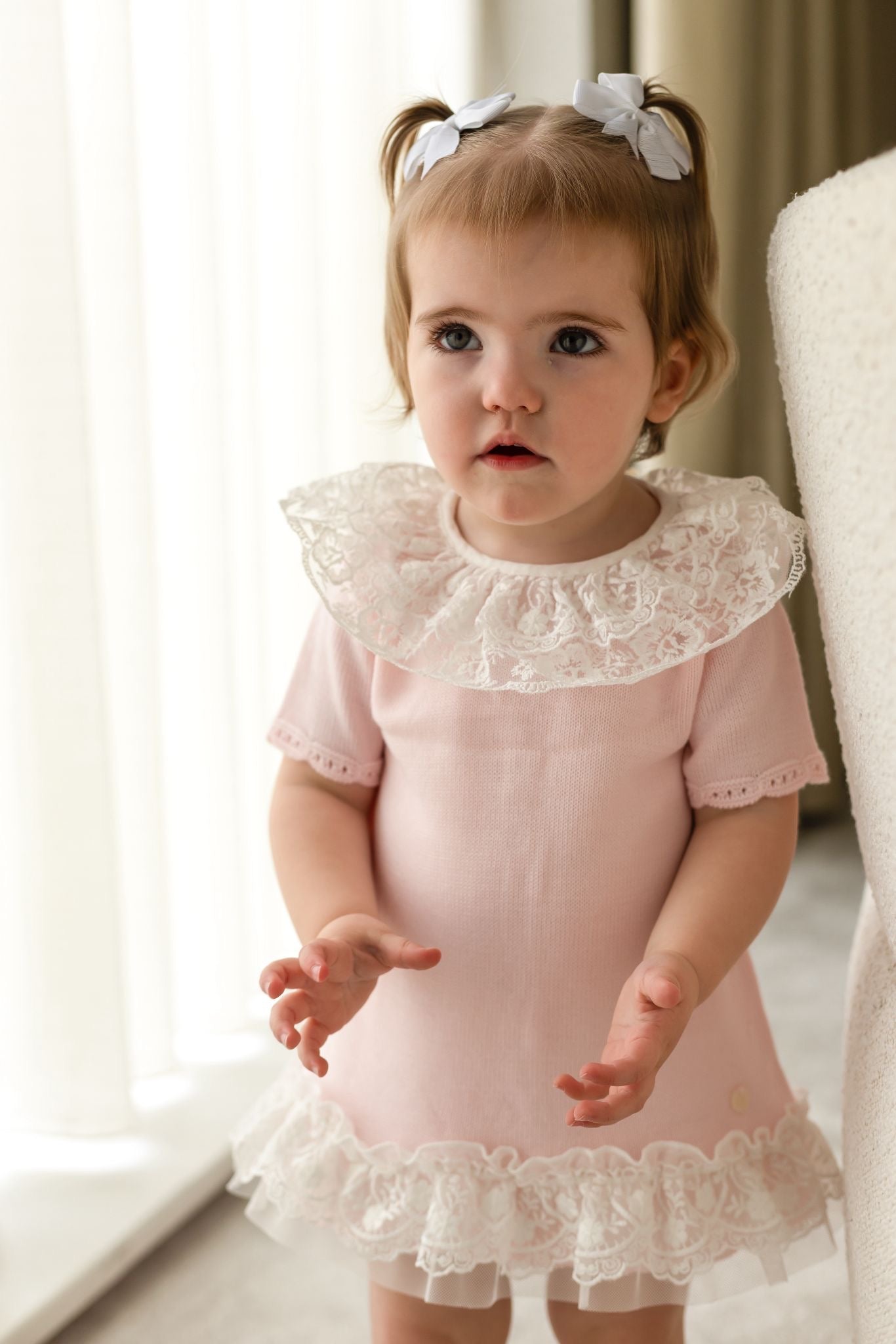 Our beautifully delicate pink Lace Knitted Dress is the perfect blend of timeless elegance and soft, comfortable design. Crafted from a fine knit fabric, this piece features a stunning oversized lace collar and a detailed lace hem, creating that classic, heirloom-inspired look every mum loves.