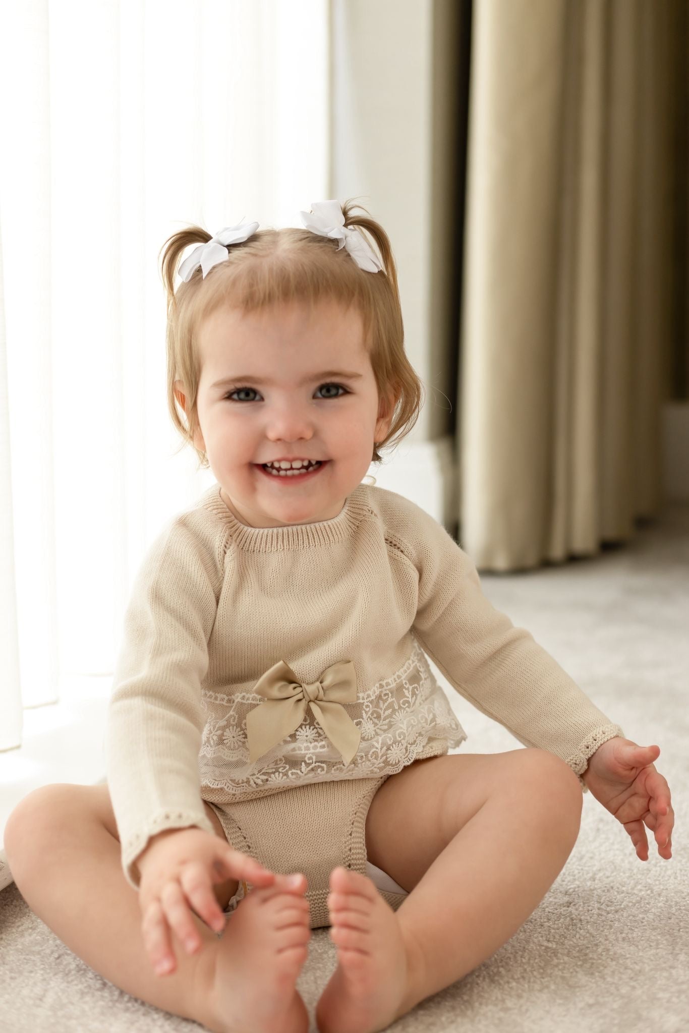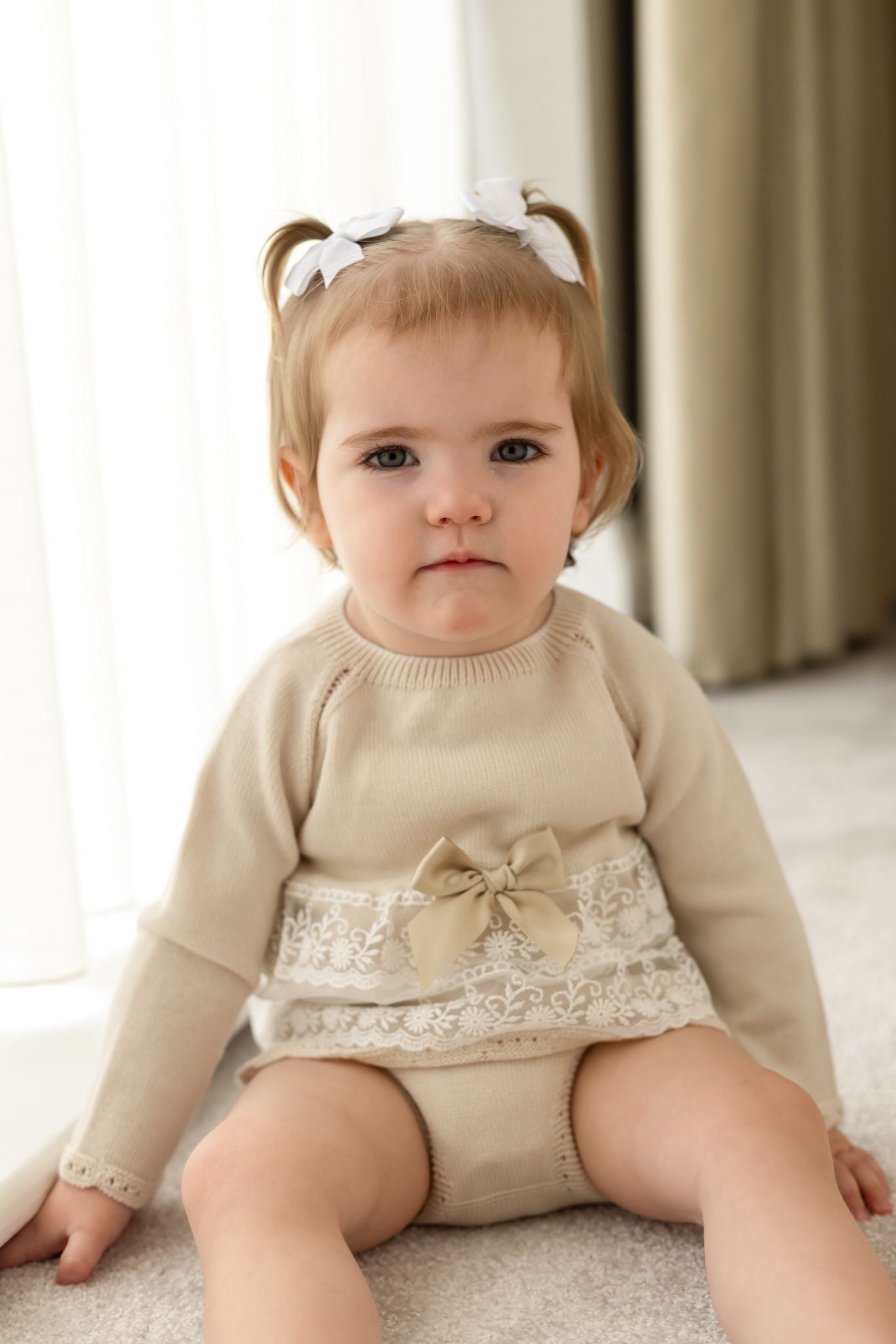 The soft pastel beige tone and heirloom-inspired lace make this set a truly special piece—ideal for those picture-perfect moments, special occasions, or simply dressing your little girl in something extra precious. The lightweight knit ensures comfort while maintaining that luxury boutique feel you love.
