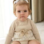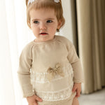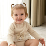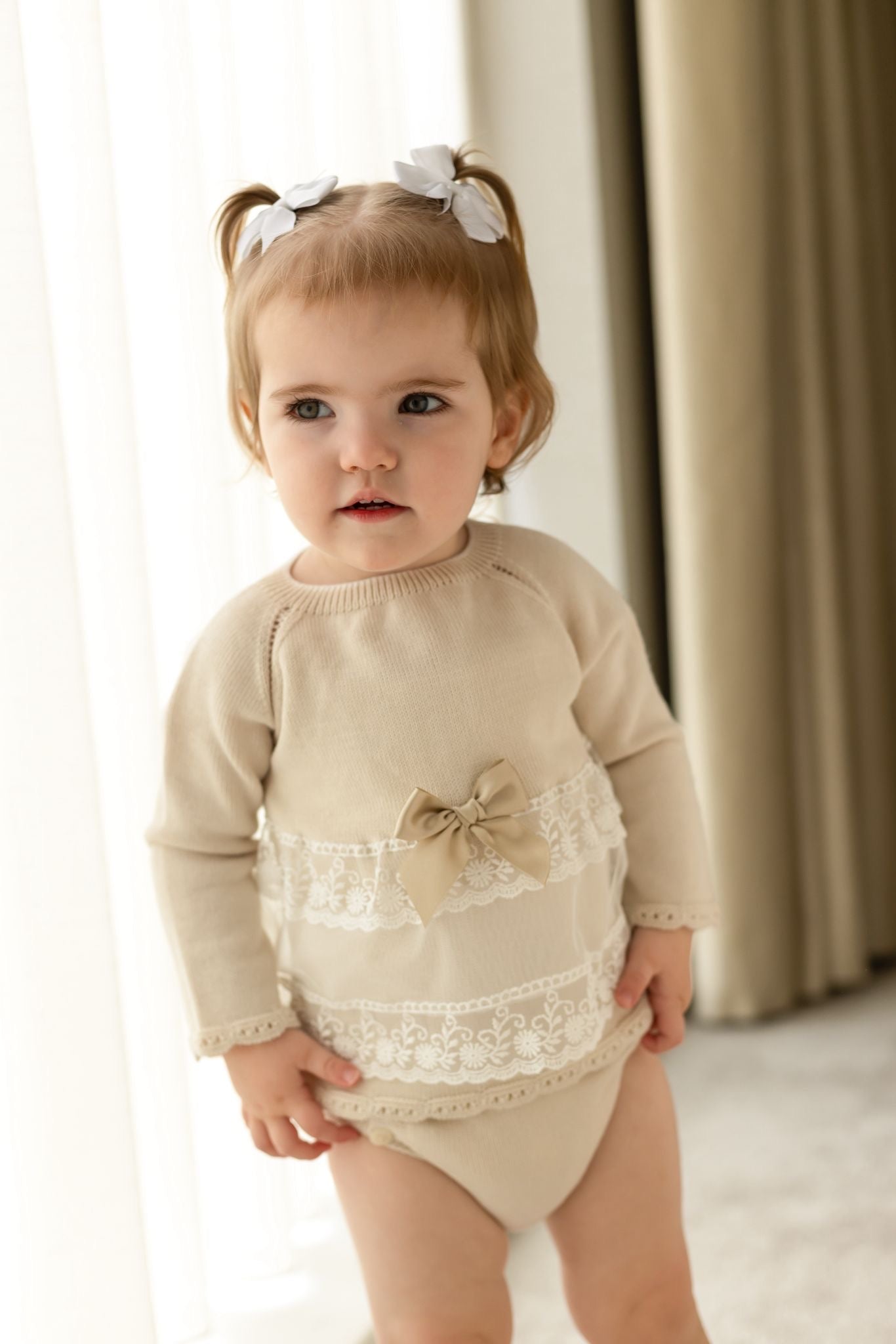 Wrap your little one in timeless elegance with our beautifully crafted baby beige knitted set. Designed with a soft, delicate touch, this two-piece outfit features a fine knit long-sleeve top adorned with intricate lace detailing and a dainty satin bow at the centre, perfectly paired with matching knitted bloomers.