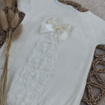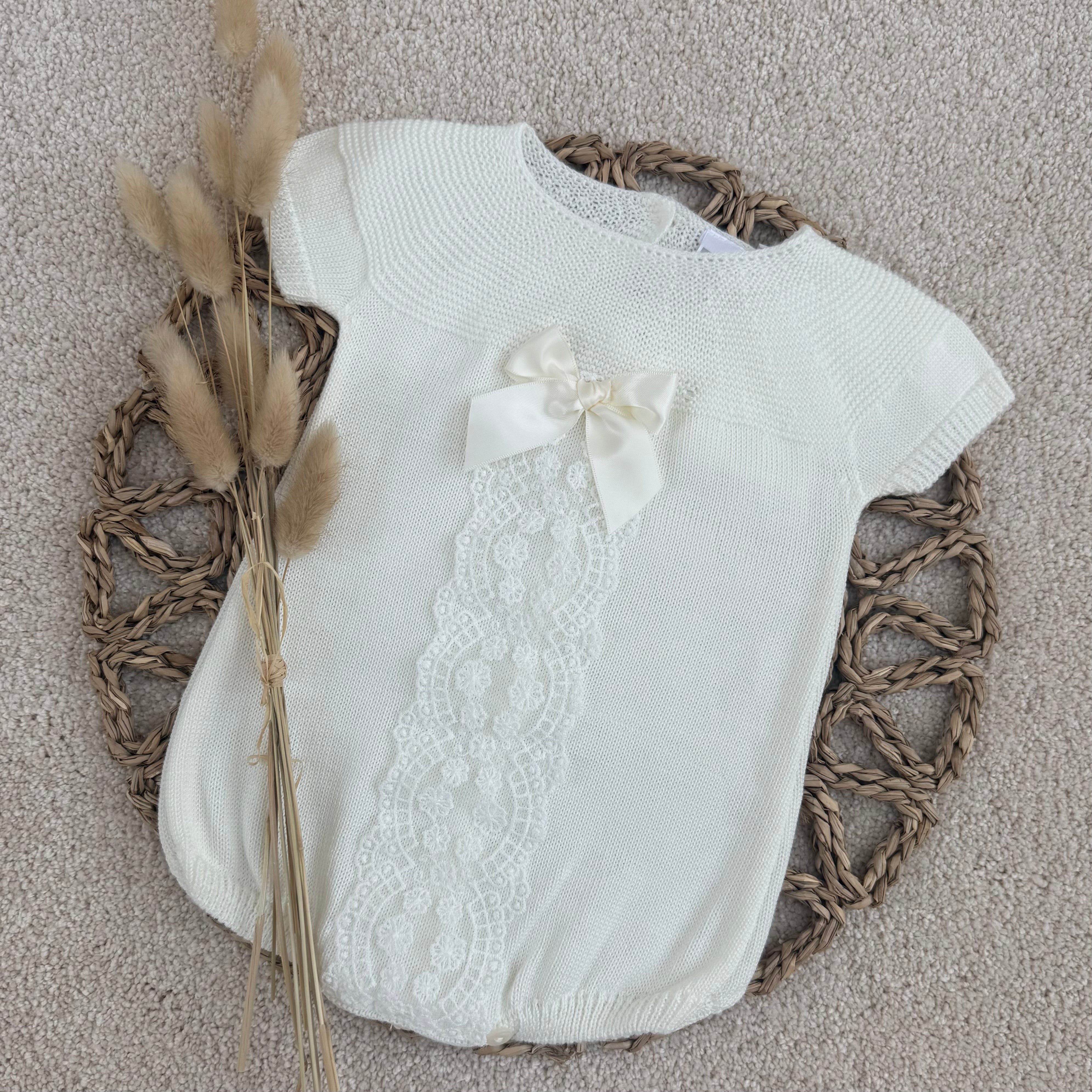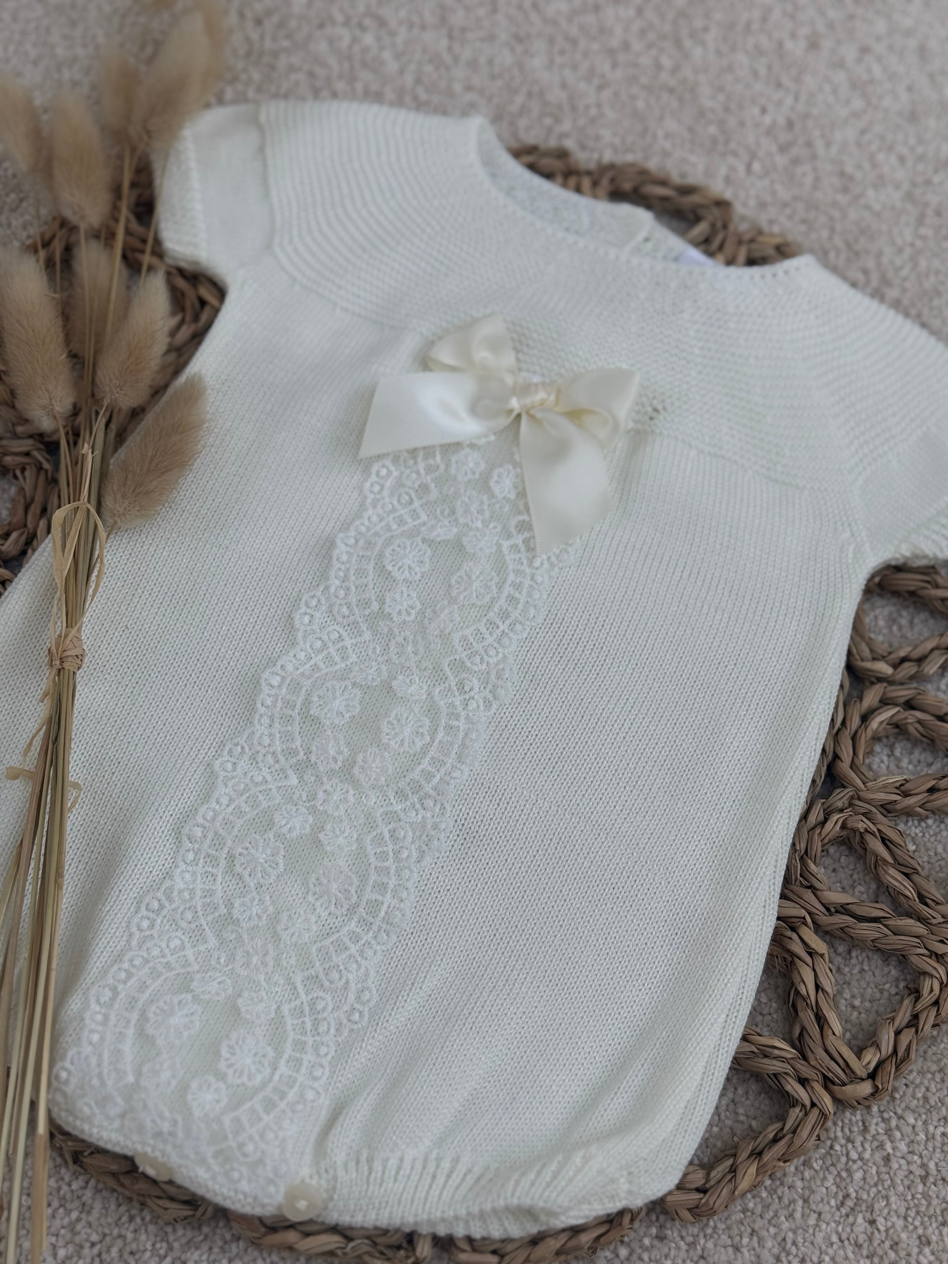 Luxury Ivory Lace Knit Baby Romper with Bow