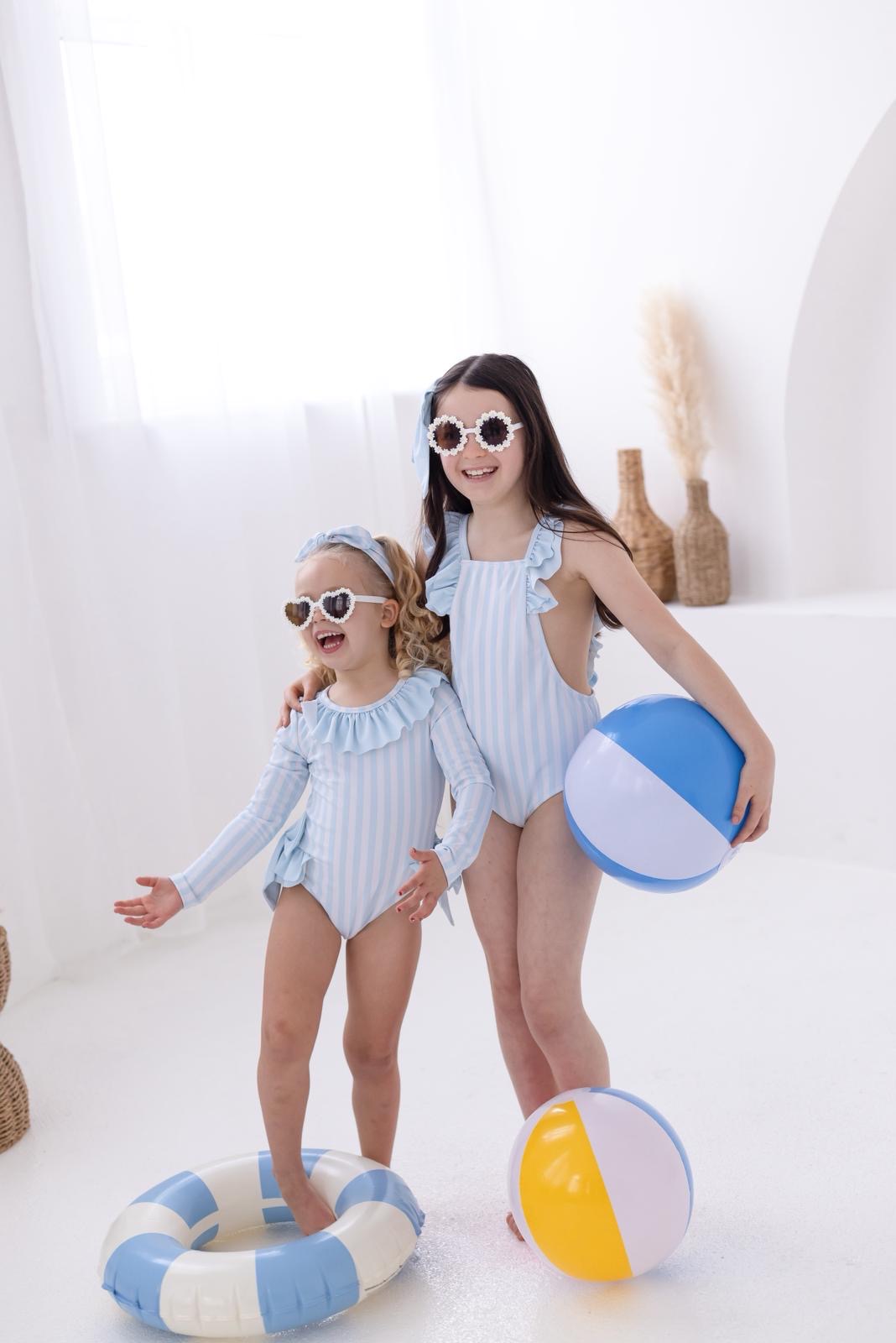 girls luxury swimsuit, mint stripe girls swimwear, long sleeve girls swimsuit, UV protection kids swimwear, designer girls swimming costume, frill girls swimsuit, pastel girls swimwear, boutique girls swimsuit