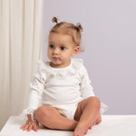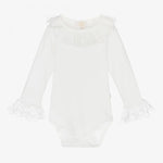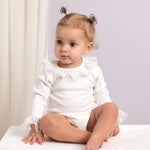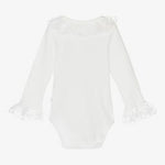 Pale ivory bodysuit for baby girls by Caramelo Kids, made in soft cotton jersey. It has a beautiful ivory lace ruffle collar, with matching lace trim on the cuffs. There are popper fastenings between the legs.