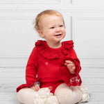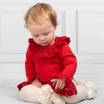 Red bodysuit for baby girls by Caramelo Kids, made in soft cotton jersey. It has a beautiful red lace ruffle collar, with matching lace trim on the cuffs. There are popper fastenings between the legs.