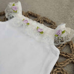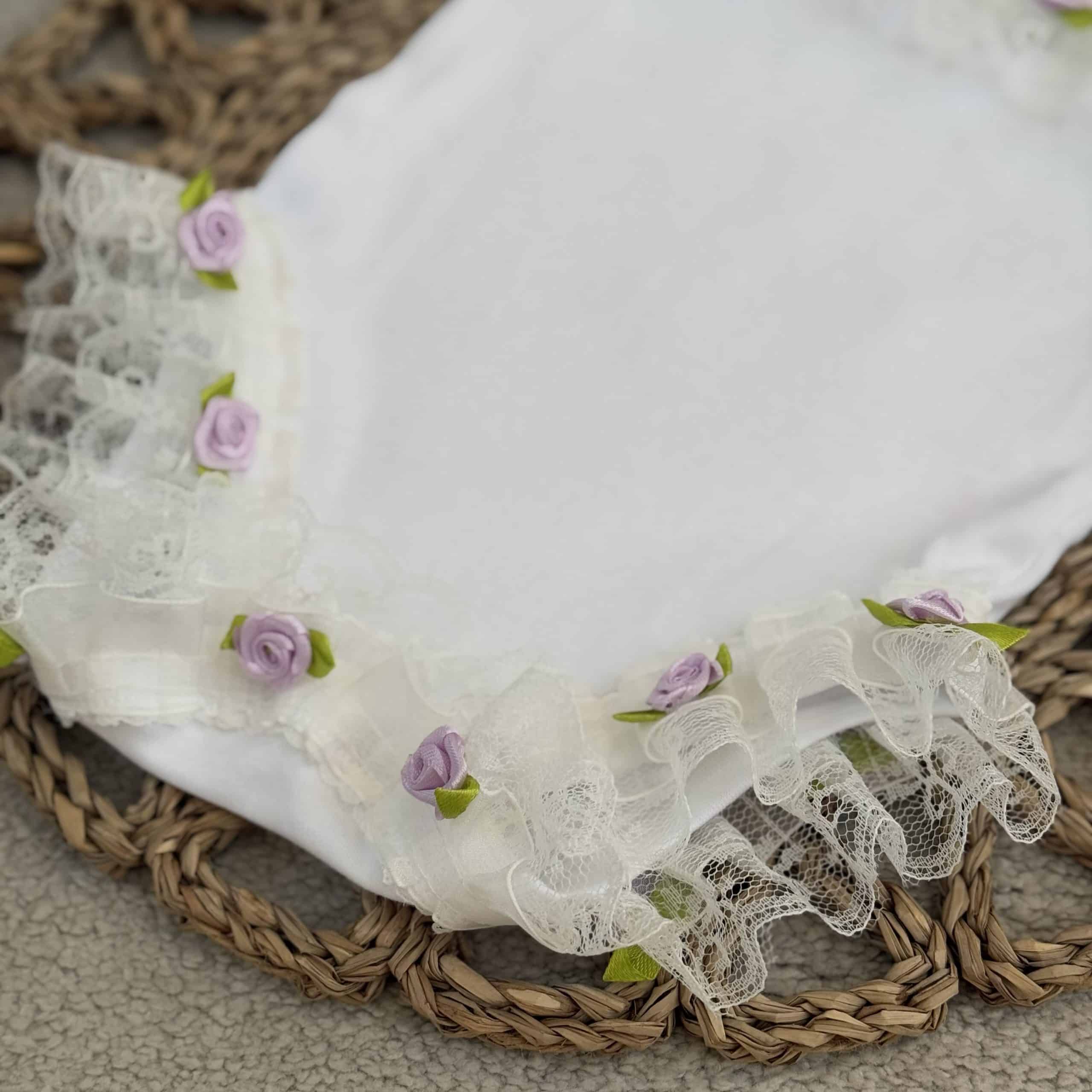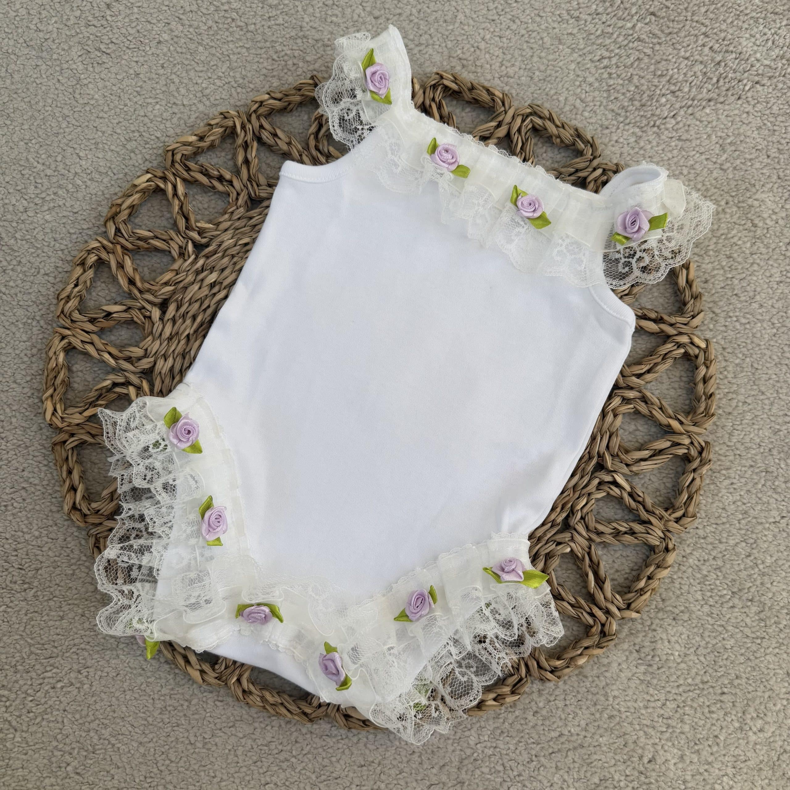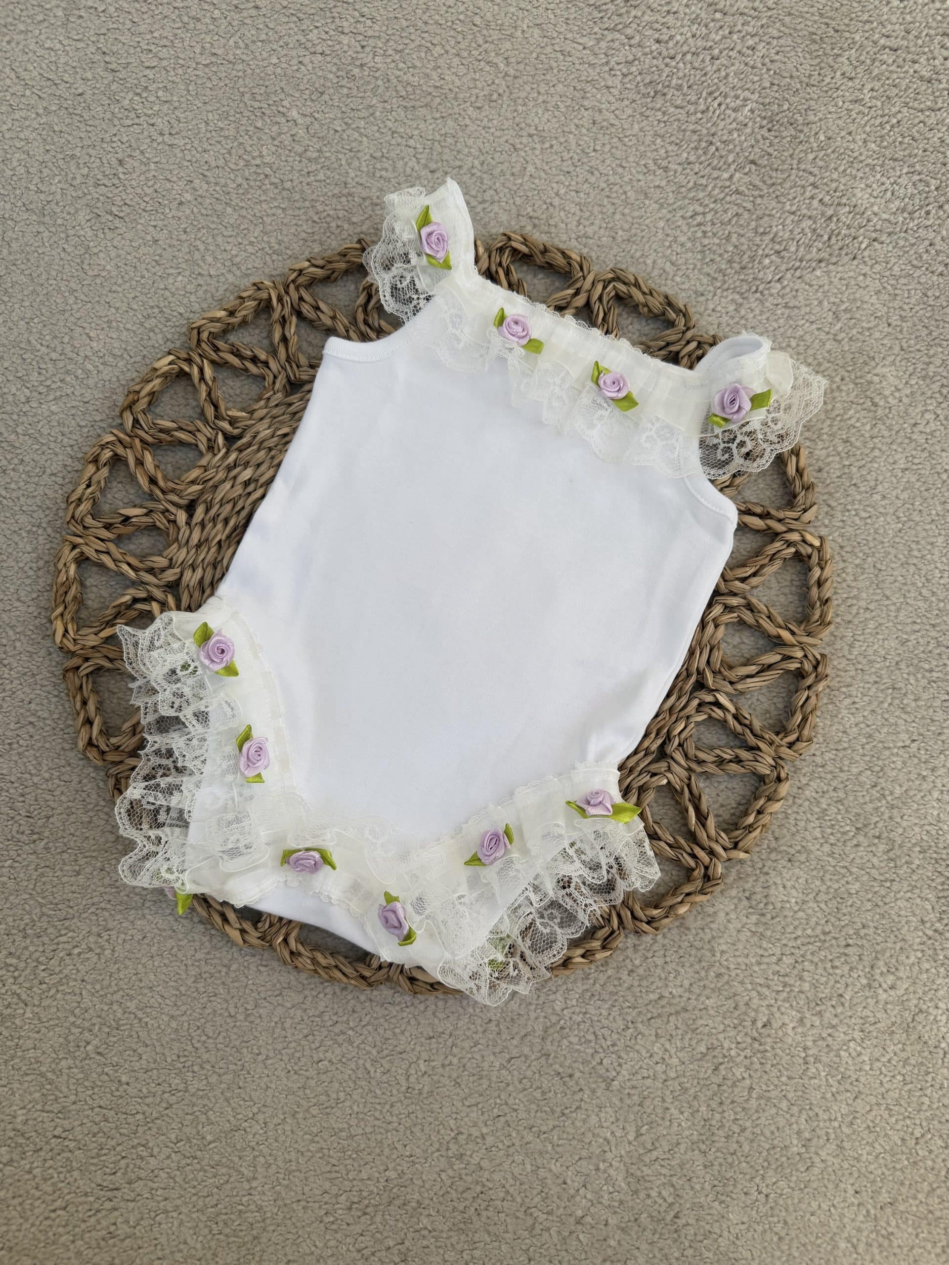 This is a one off unique item. the vest is unbelievably cute with lace and rosebuds sewn around the edges.