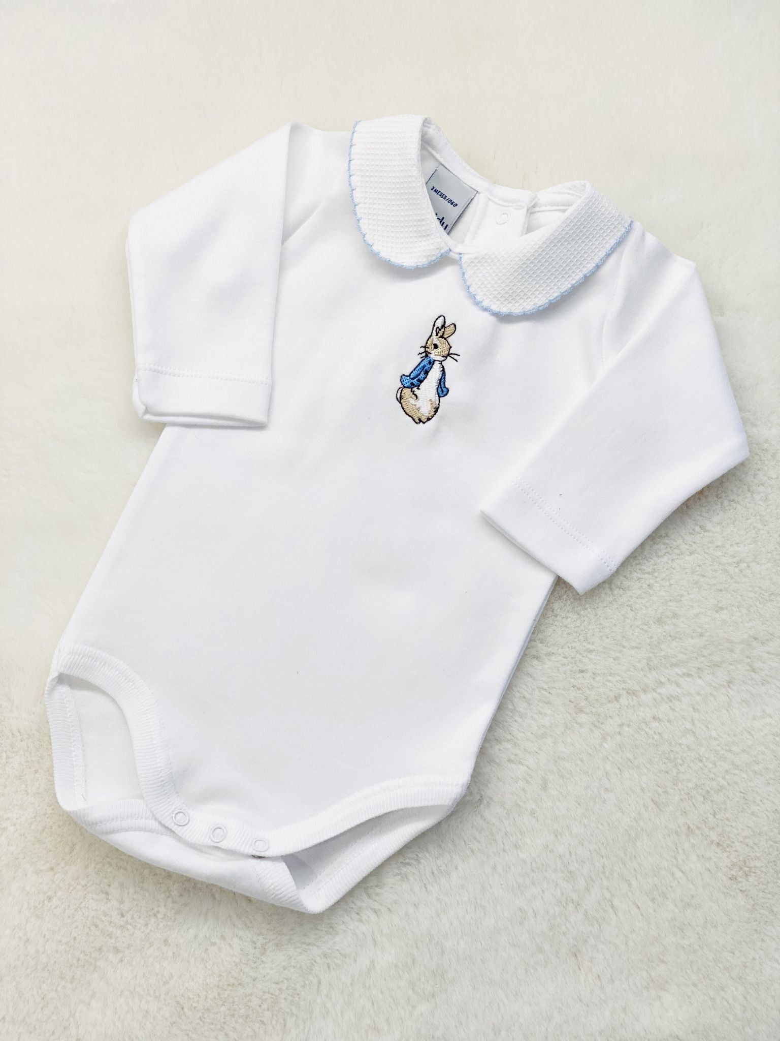 Dress your little one in timeless charm with this Peter Rabbit White Cotton Long-Sleeve Bodysuit, crafted from 100% soft cotton for ultimate comfort. Designed by Babidu, a renowned Spanish brand, this high-quality vest features: