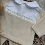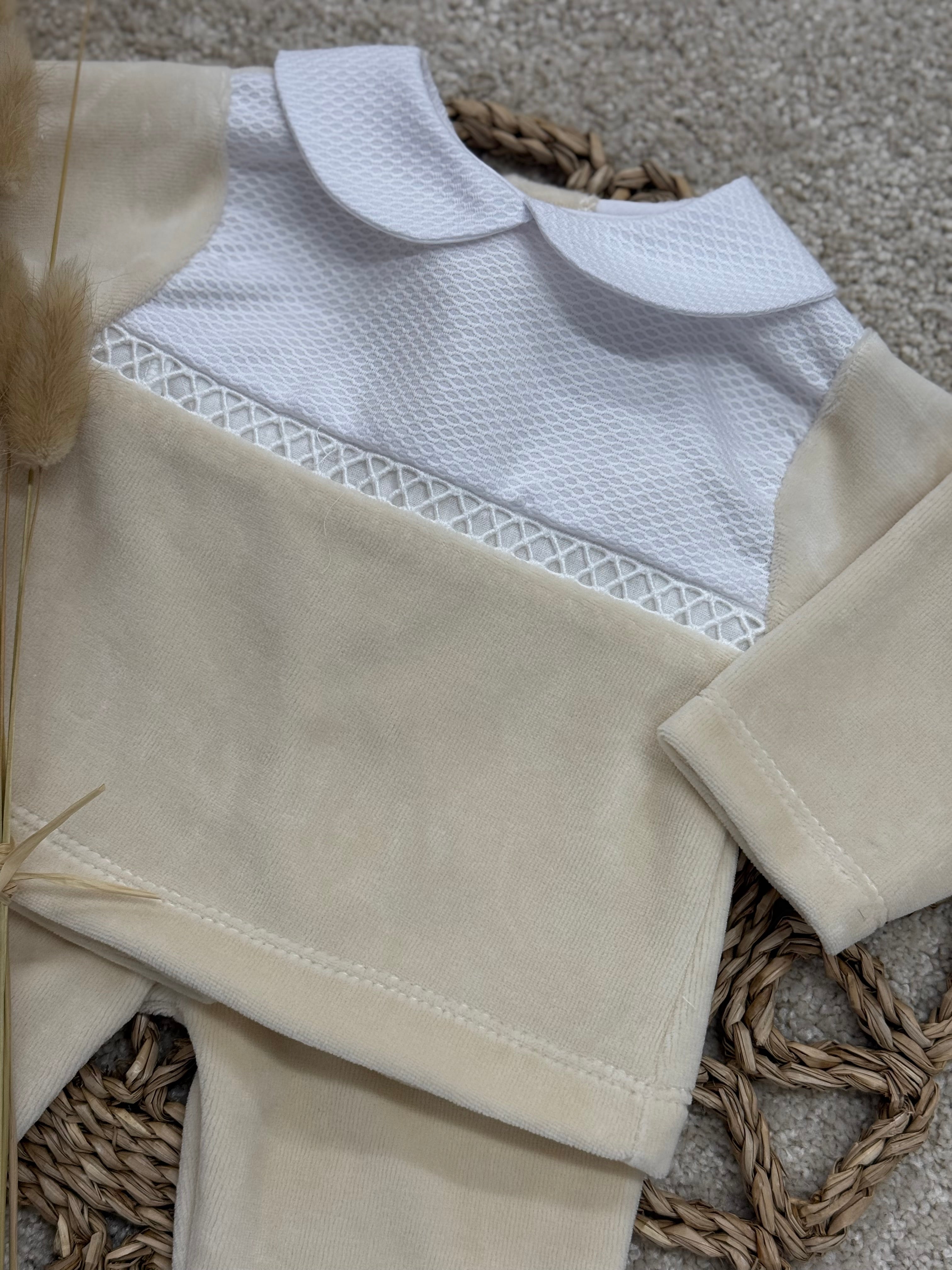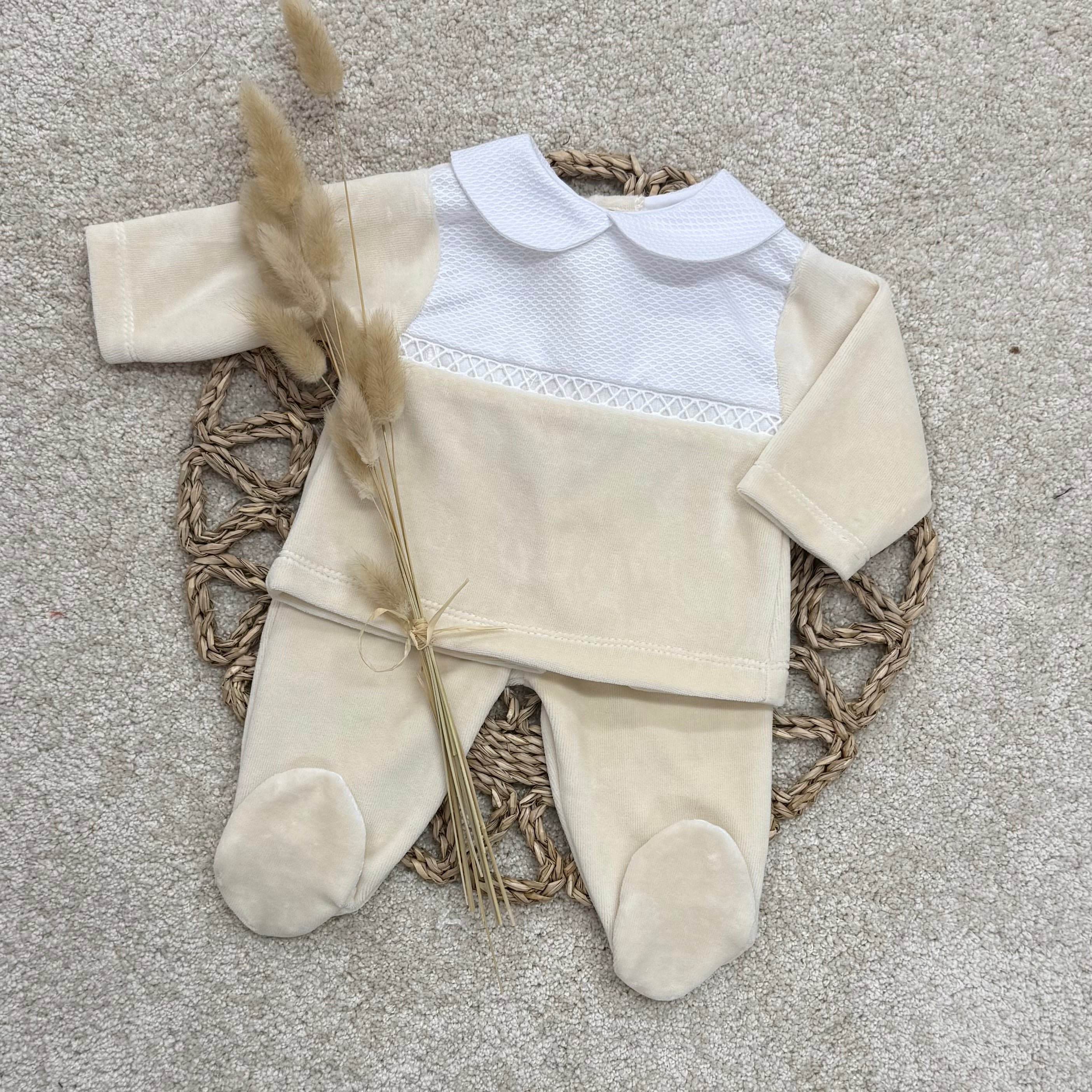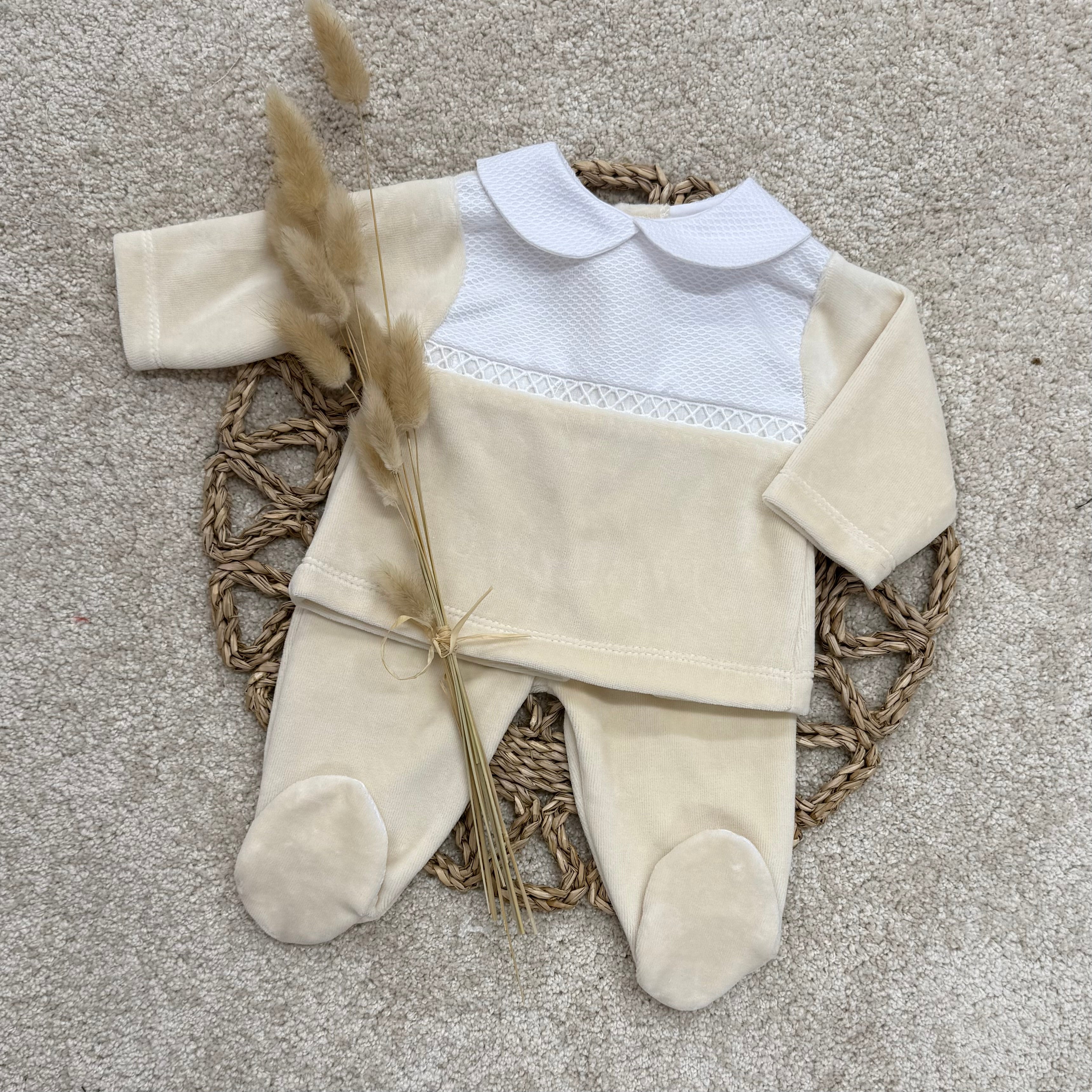 Dress your little one in timeless elegance with this beautiful cream velour baby outfit. This two-piece set includes a soft long-sleeve top and matching footed bottoms, designed in a luxurious velour fabric that’s gentle on delicate skin. The top features a crisp white textured panel, a classic Peter Pan collar, and a delicate lattice trim for that traditional, luxury babywear look.