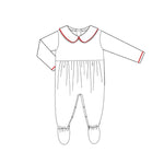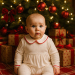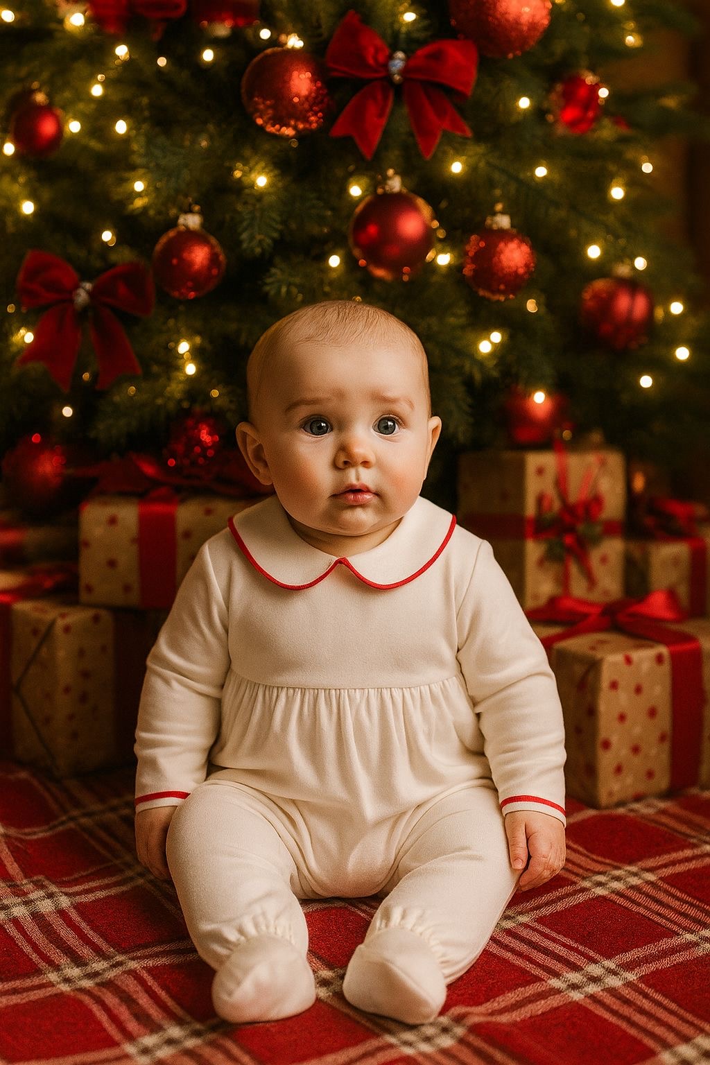 Our Luxury Baby boys Red Bow Sleepsuit is the perfect festive outfit to match our popular Polar Express PJs. Designed with elegance and comfort in mind, this beautiful sleepsuit features delicate red detailing on the collar and cuffs, that extra touch of Christmas charm.