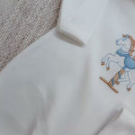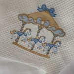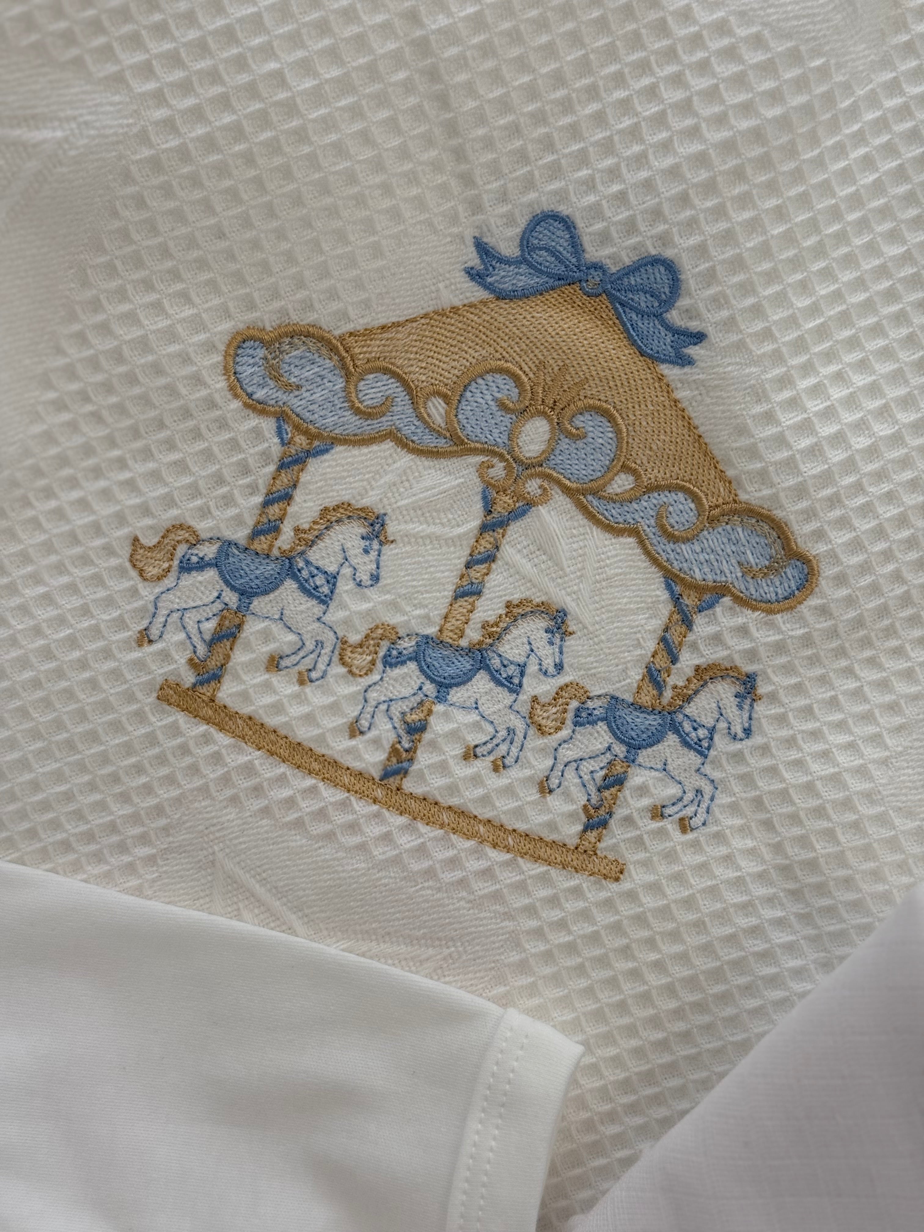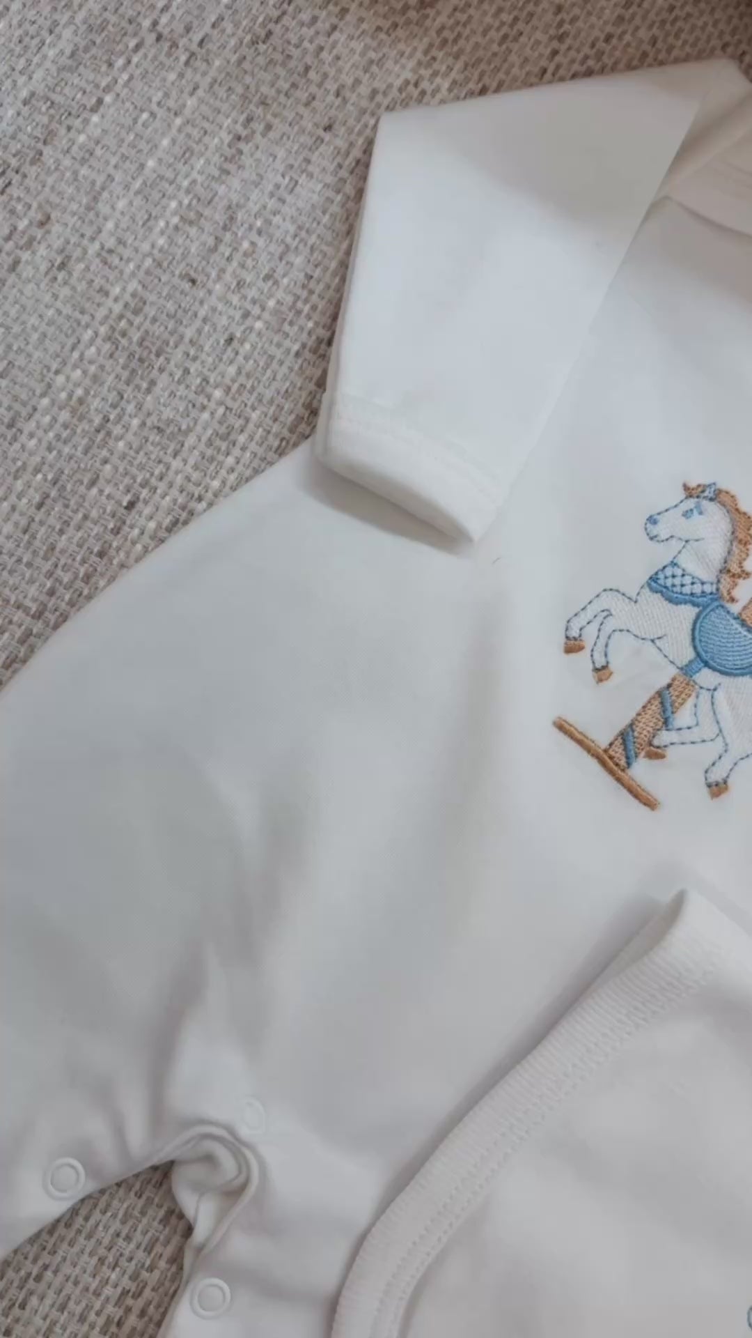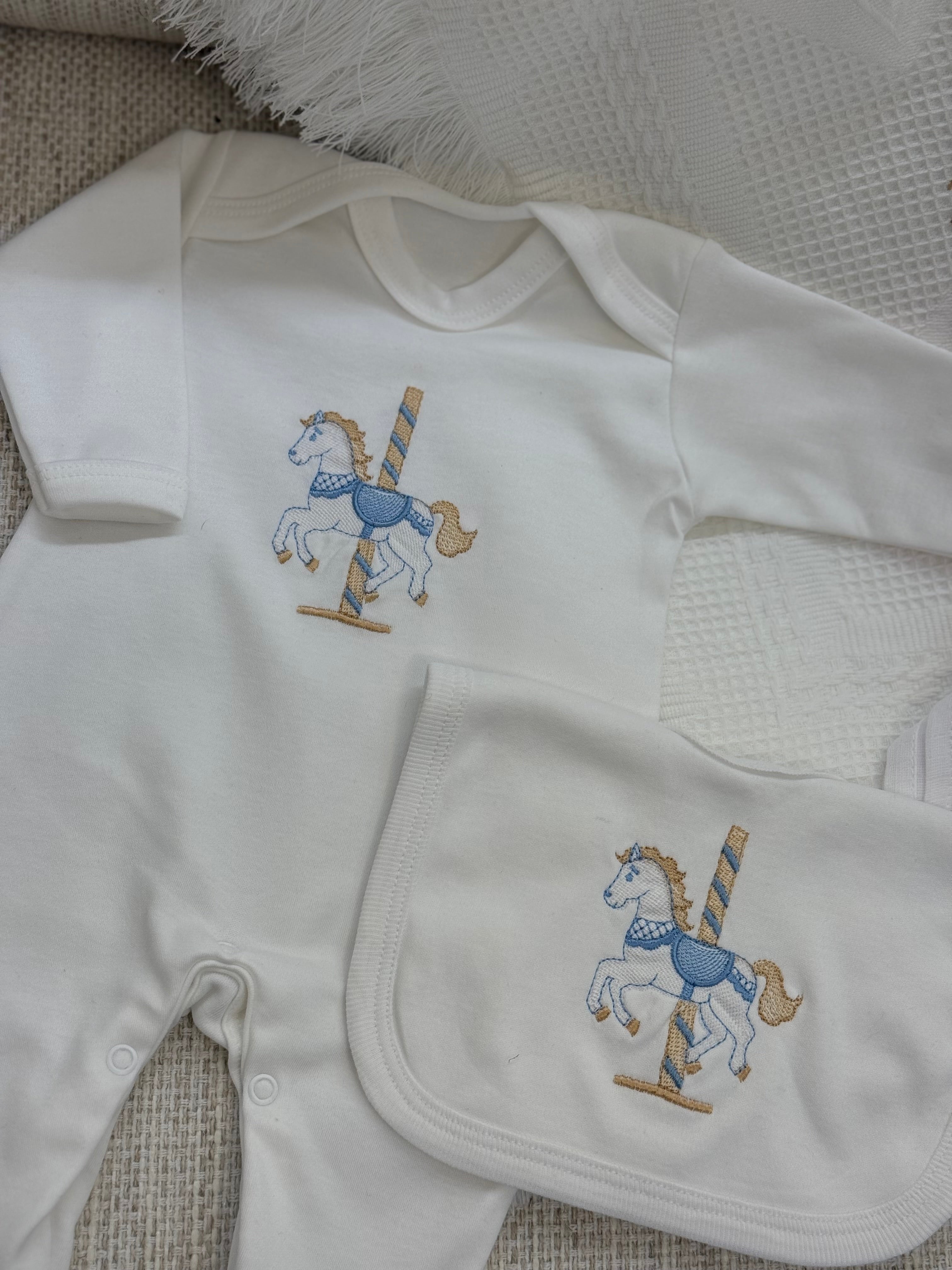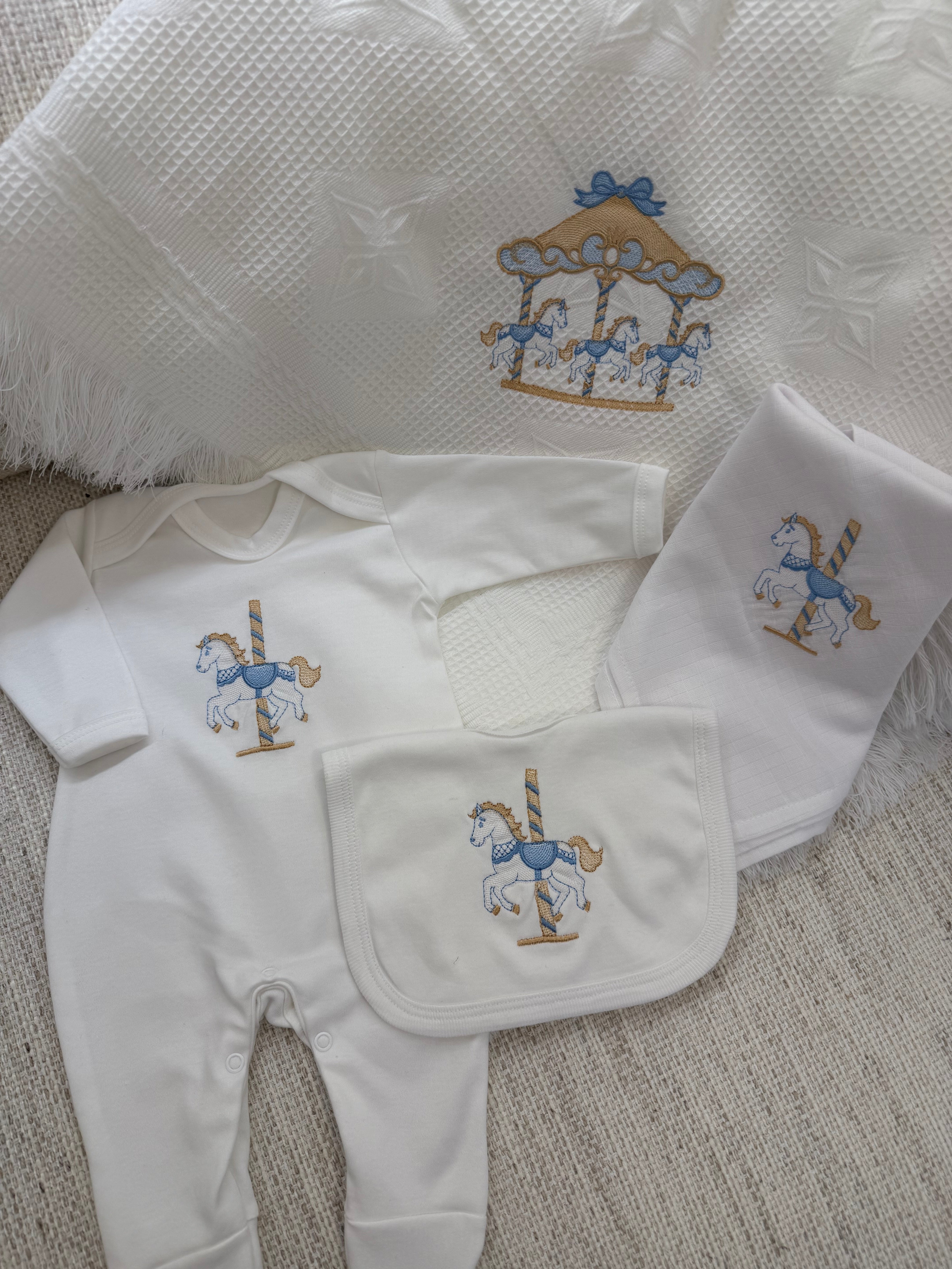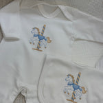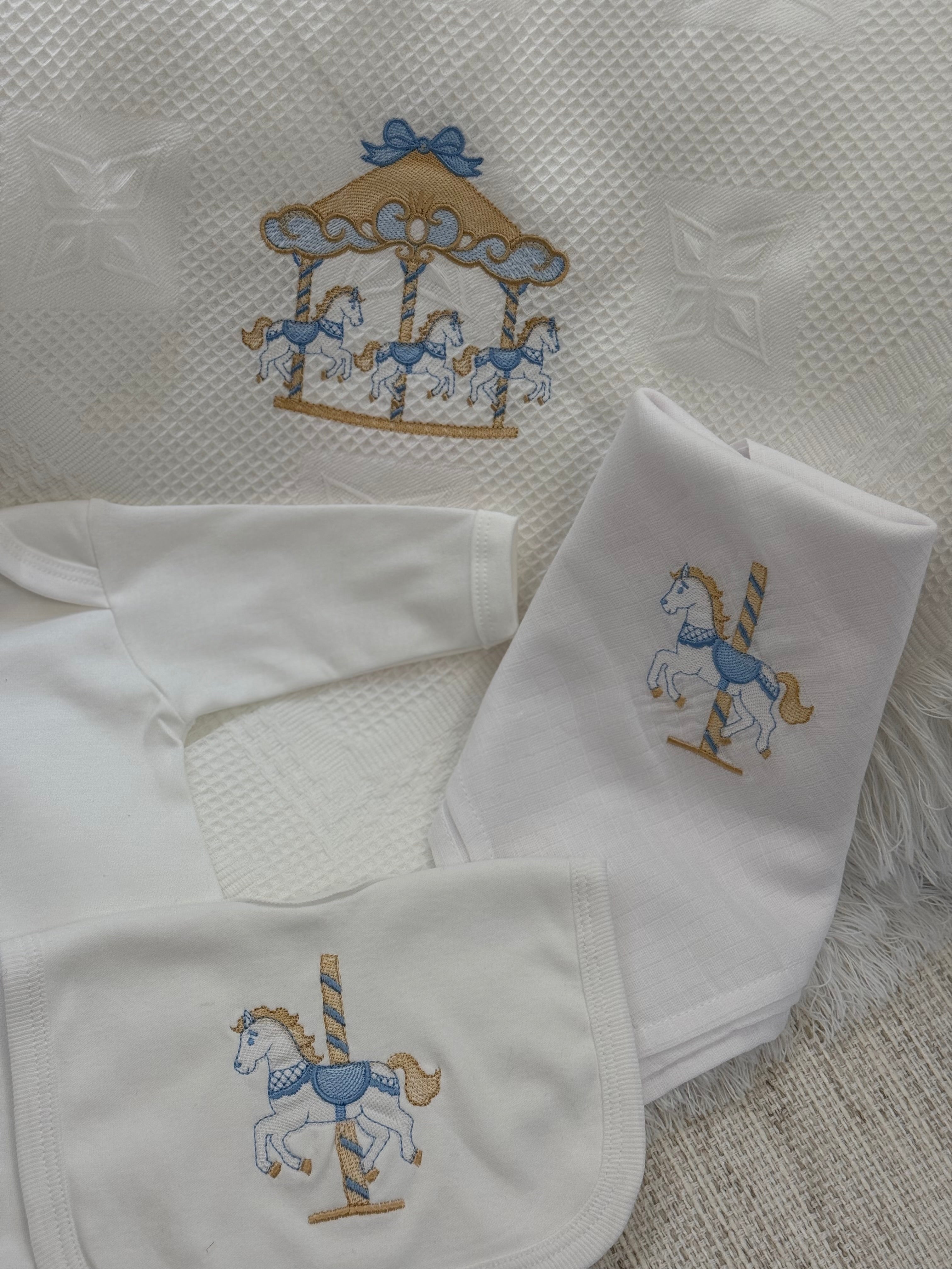 Each piece is delicately embroidered with a classic carousel horse design in soft blue and neutral tones, giving a timeless and traditional finish. Made from gentle, breathable fabrics, this set is kind to delicate newborn skin while offering comfort and practicality.