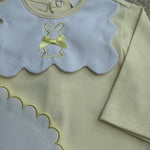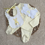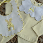 - Long-Sleeve Top: Made from soft pink cotton, the top is gentle against delicate skin. It features a white textured scalloped collar that matches the bib, and a coordinating bunny appliqué with a Lemon bow in the center, tying the whole outfit together beautifully.