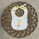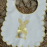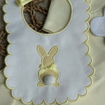 - Handmade Bib: Delicately crafted with a scalloped edge, the bib features a textured white fabric outlined in soft pink piping. A sweet Lemon bunny appliqué sits at the center, adorned with a soft pom-pom tail and a dainty Lemon bow — a whimsical, handmade touch that adds charm and character. The bib fastens with a satin ribbon tie, ensuring a snug and adjustable fit.