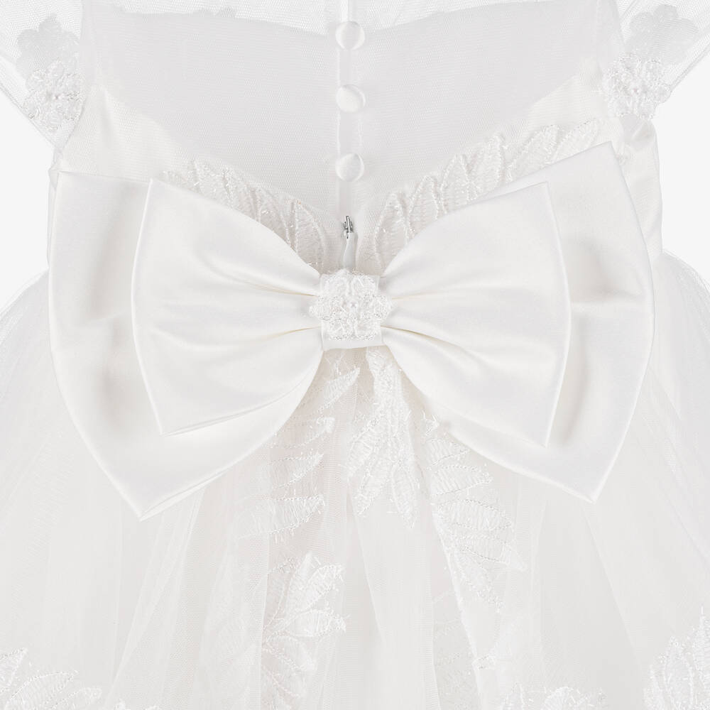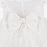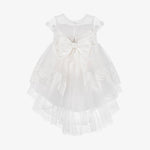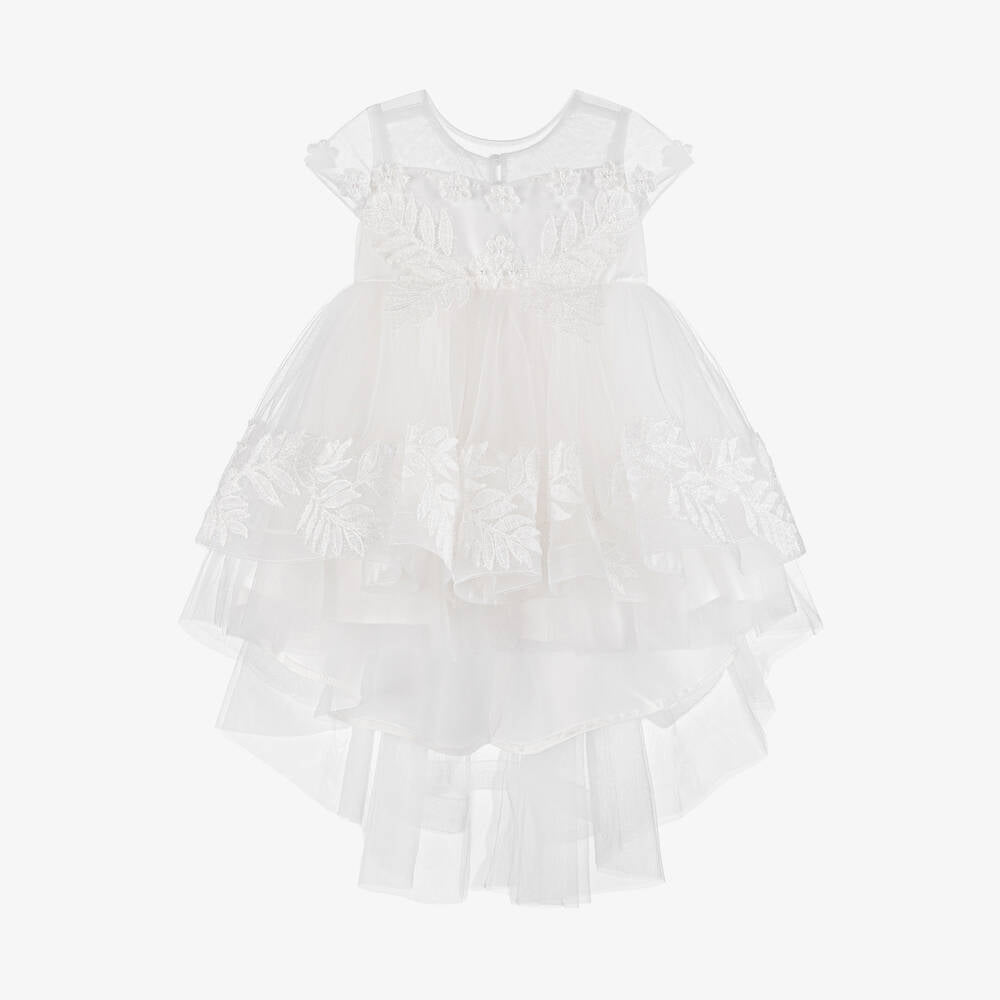 A lovely occasion dress for baby girls by Sevva, in pale ivory. Made and lined in delicate satin, it is overlayed with beautiful layers of cascading tulle, which falls lower on the back for a pretty effect. This sweet look has sparkling leaf and flower embroidery, with little faux pearl and bead detailing. The shoulders, upper back and capped sleeves are sheer for added femininity. Fastening on the back, there are fabric-covered buttons, a hidden zip, and decorative bow with poppers to attach to the dress.