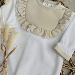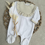 Soft and sweet, our baby girls cream velour babygrow features a delicate beige panel adorned with a charming frill on the front. Designed for both comfort and style, this babygrow is perfect for keeping your little one cozy while looking adorable. Made from luxuriously soft velour, it ensures gentle warmth and is easy to care for. Ideal for special occasions or everyday wear, this piece adds a touch of elegance to babys wardrobe.