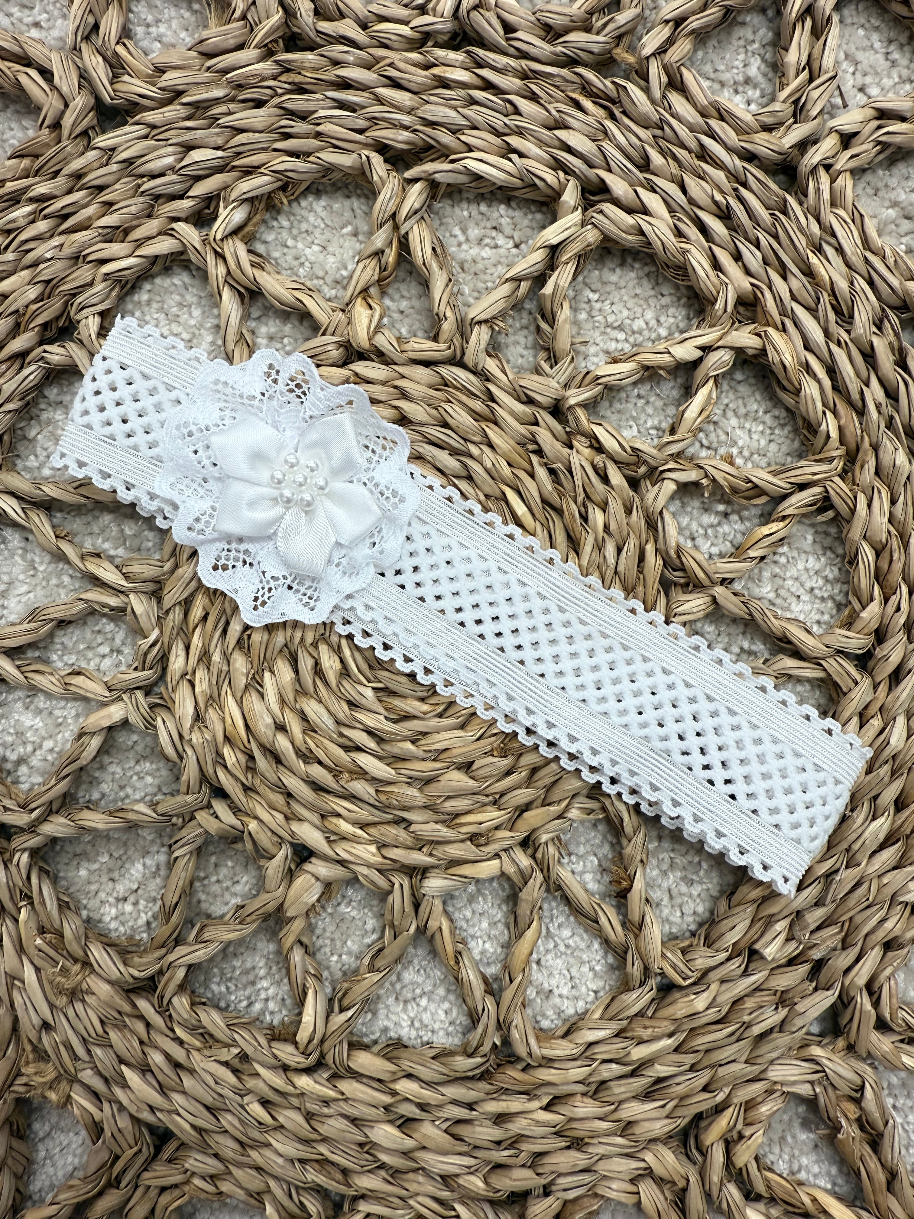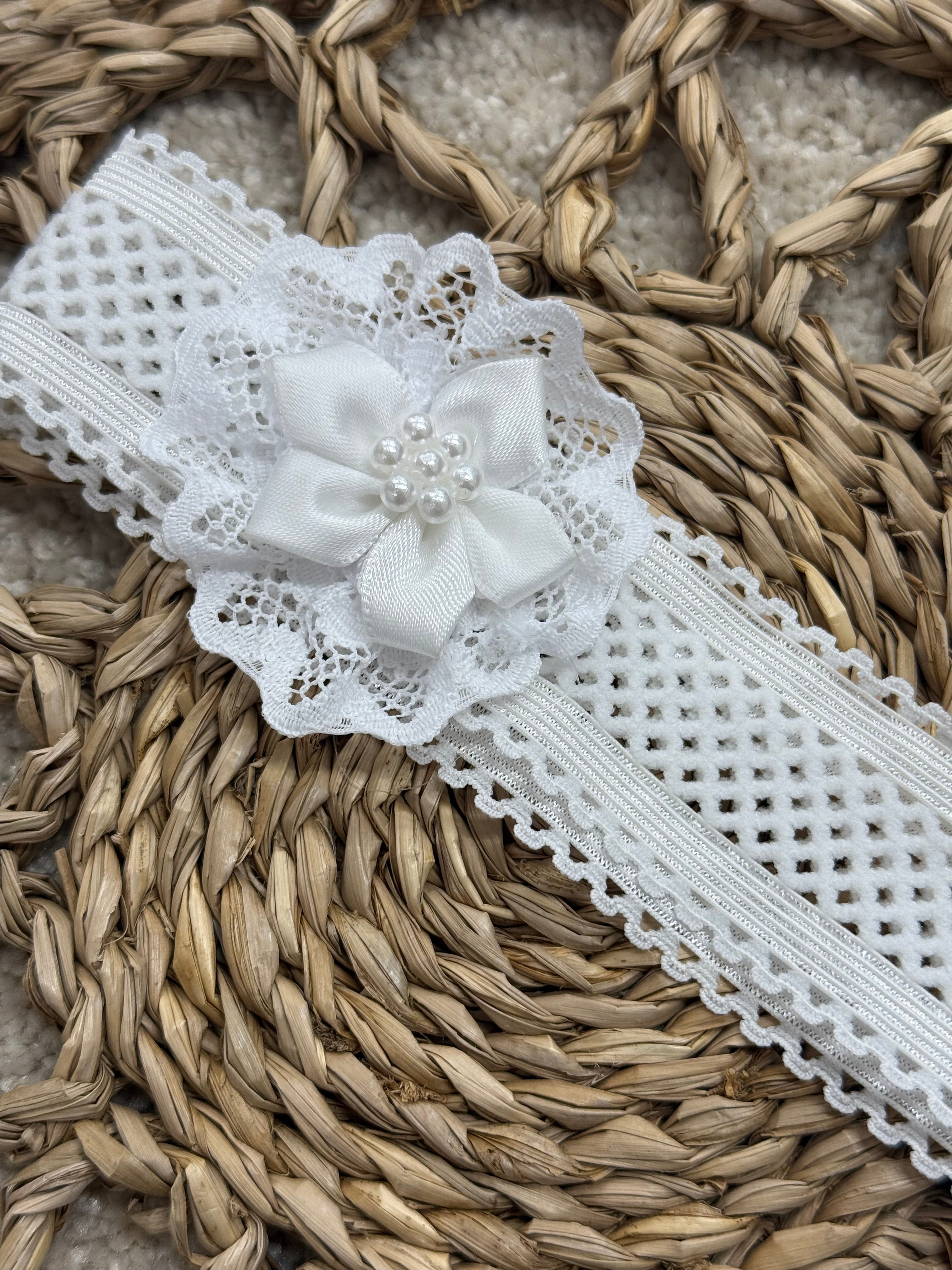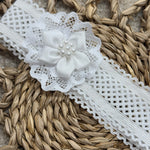 This is a beautifully crafted lace baby headband featuring an elegant, vintage-inspired design. The band itself is made from delicate cream with intricate floral and swirl patterns. At the center, there’s a standout embroidered flower applique with layered lace petals and a pearl-like bead in the middle, adding a touch of timeless charm.