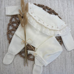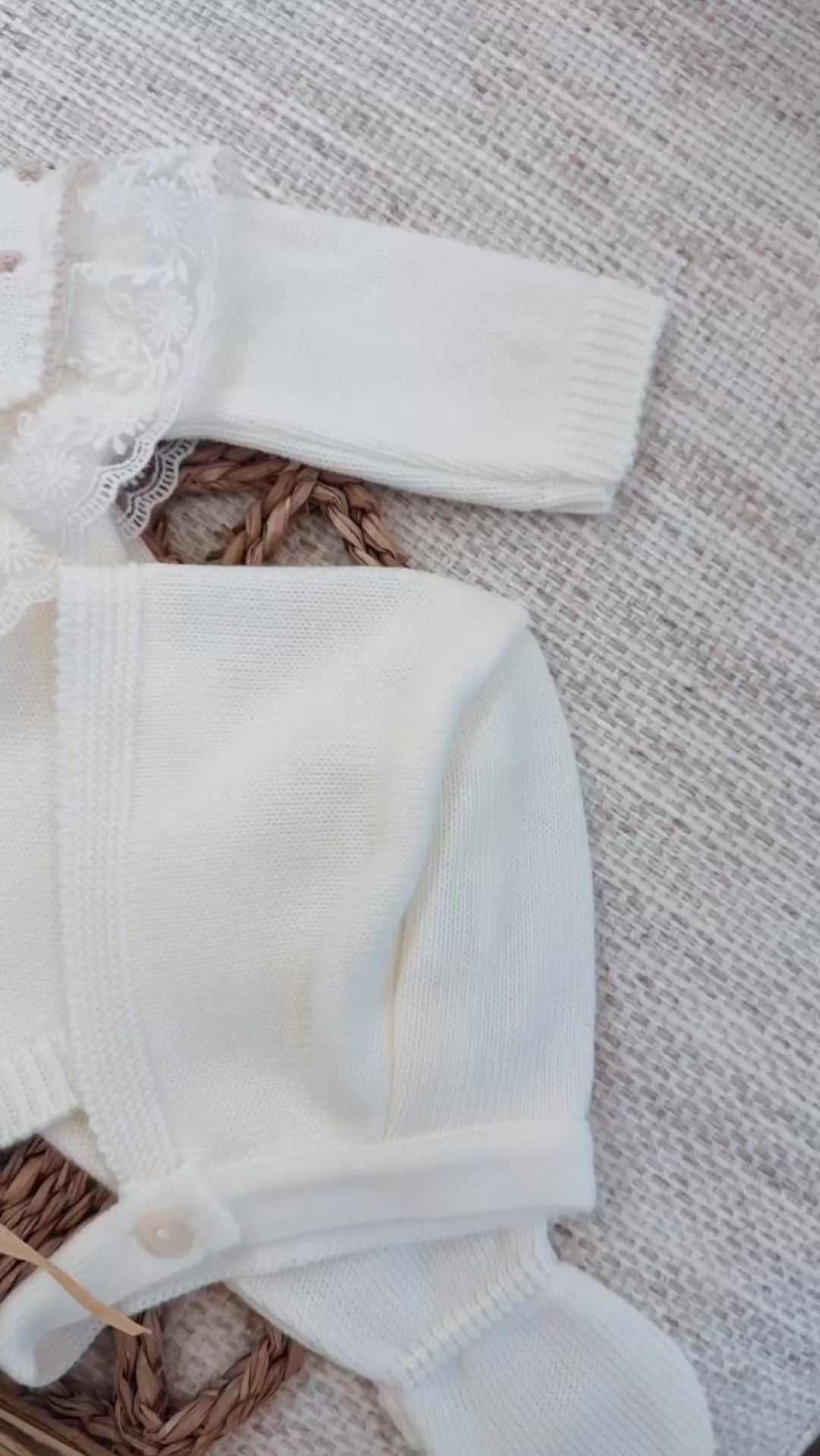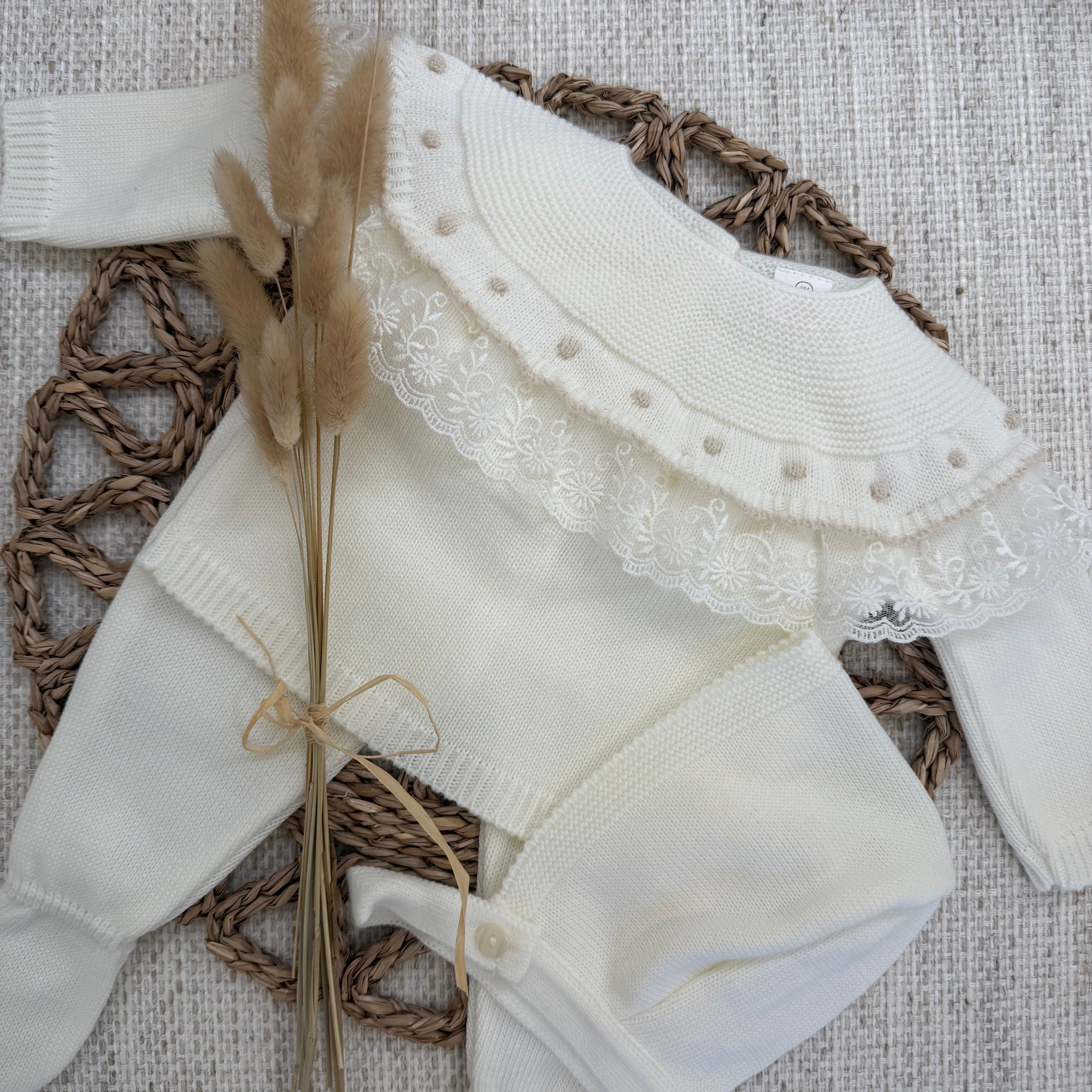 Dress your little one in timeless elegance with this beautiful Spanish baby outfit featuring delicate lace detailing for a truly luxurious look. This two-piece set includes a long-sleeved knitted top adorned with a statement lace collar and matching lace trim on the coordinated shorts. Perfect for special occasions, christenings, or simply adding charm to everyday wear.