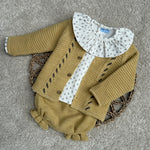 Keywords included: Mac Ilusion baby outfit, baby girl 3 piece set, mustard cardigan baby, frill collar baby shirt, knitted baby knickers, baby girl autumn outfit, Spanish baby clothes