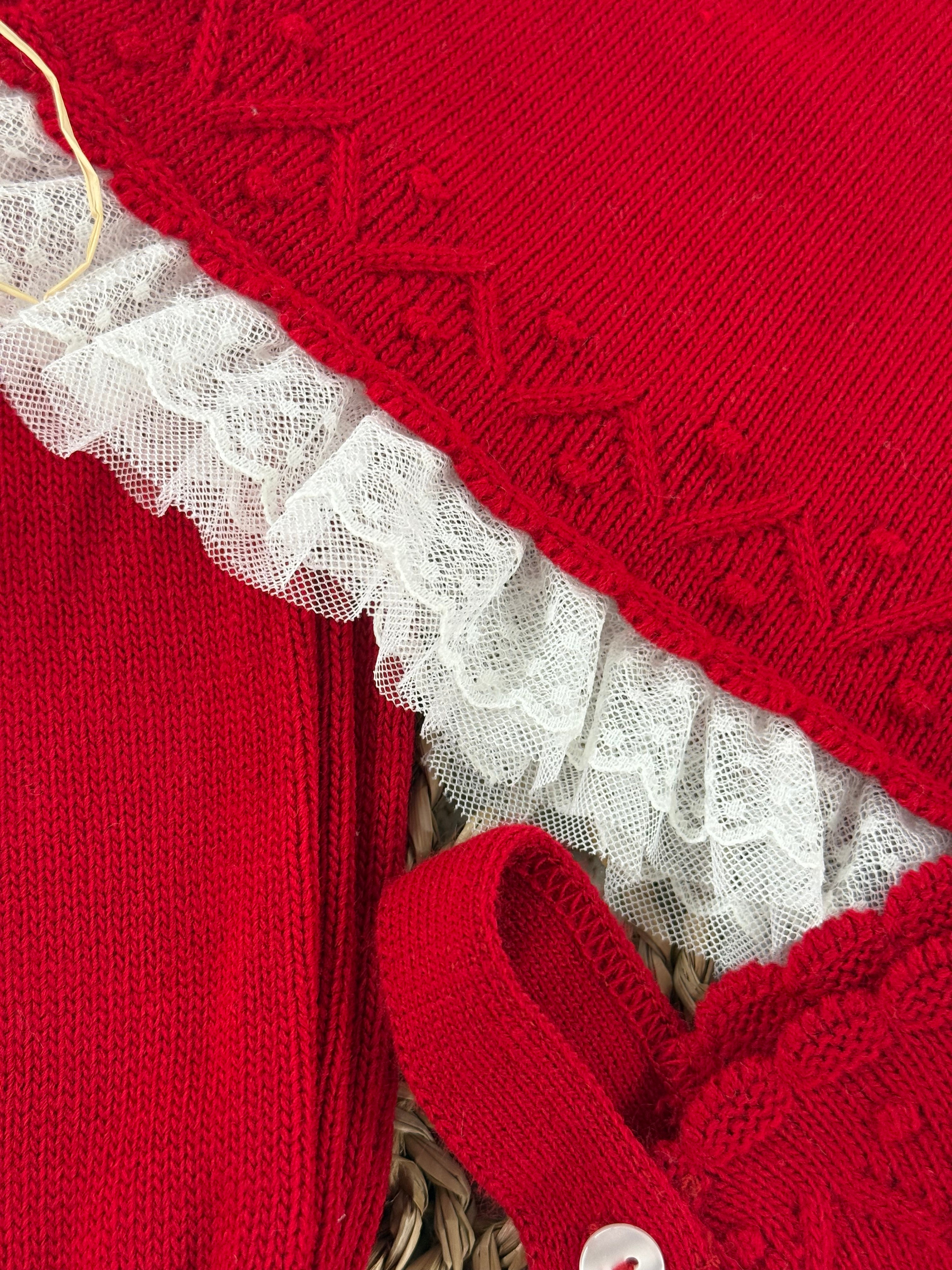 Dress your little one in timeless elegance with our Baby Girls Spanish Knitted 3 Piece Set. Beautifully crafted in a traditional Spanish style, this charming outfit includes a matching bonnet, knitted top, and pants, all made from soft, breathable yarn for your baby’s comfort. The delicate lace trim at the bottom of the top adds a touch of classic sophistication, perfect for special occasions or everyday wear.