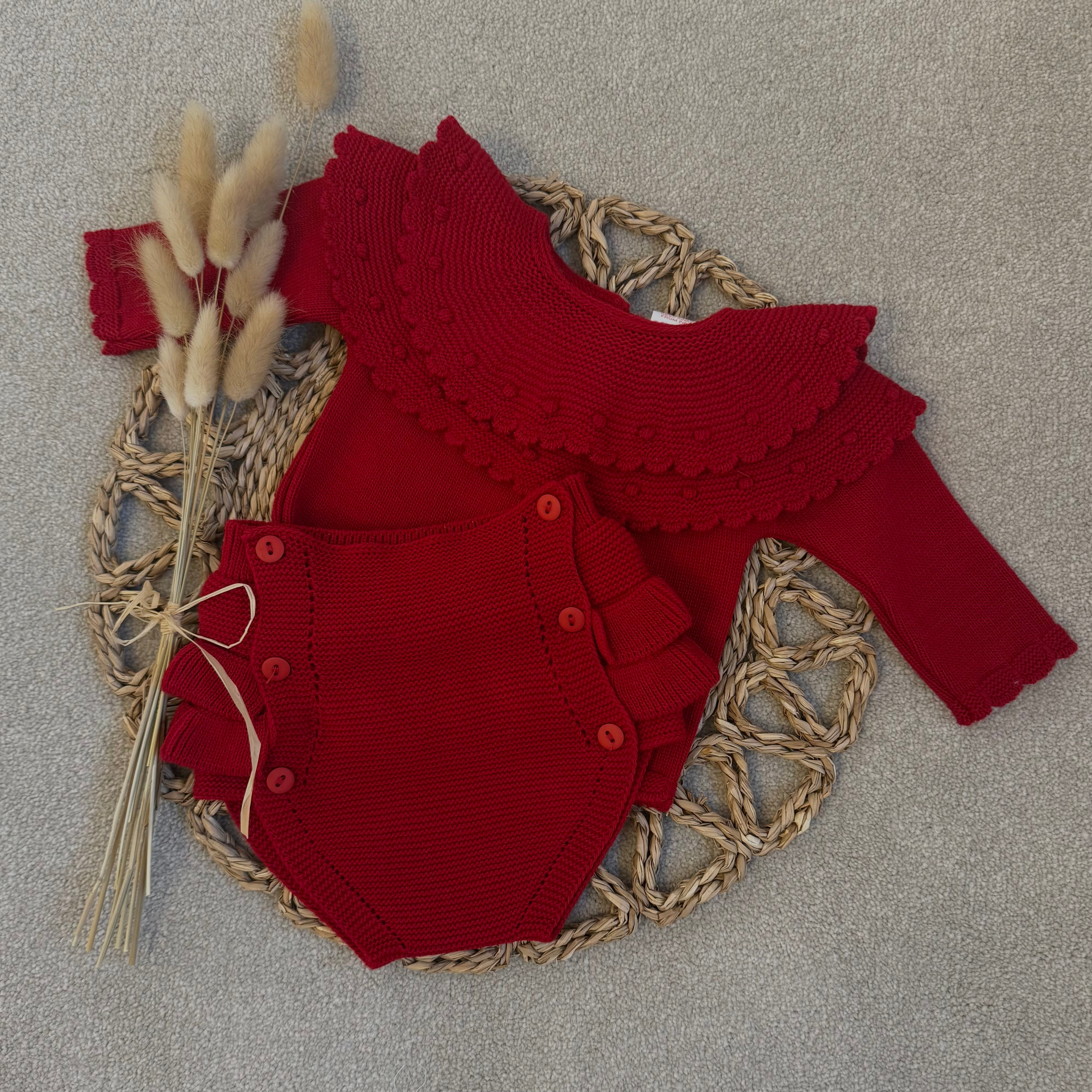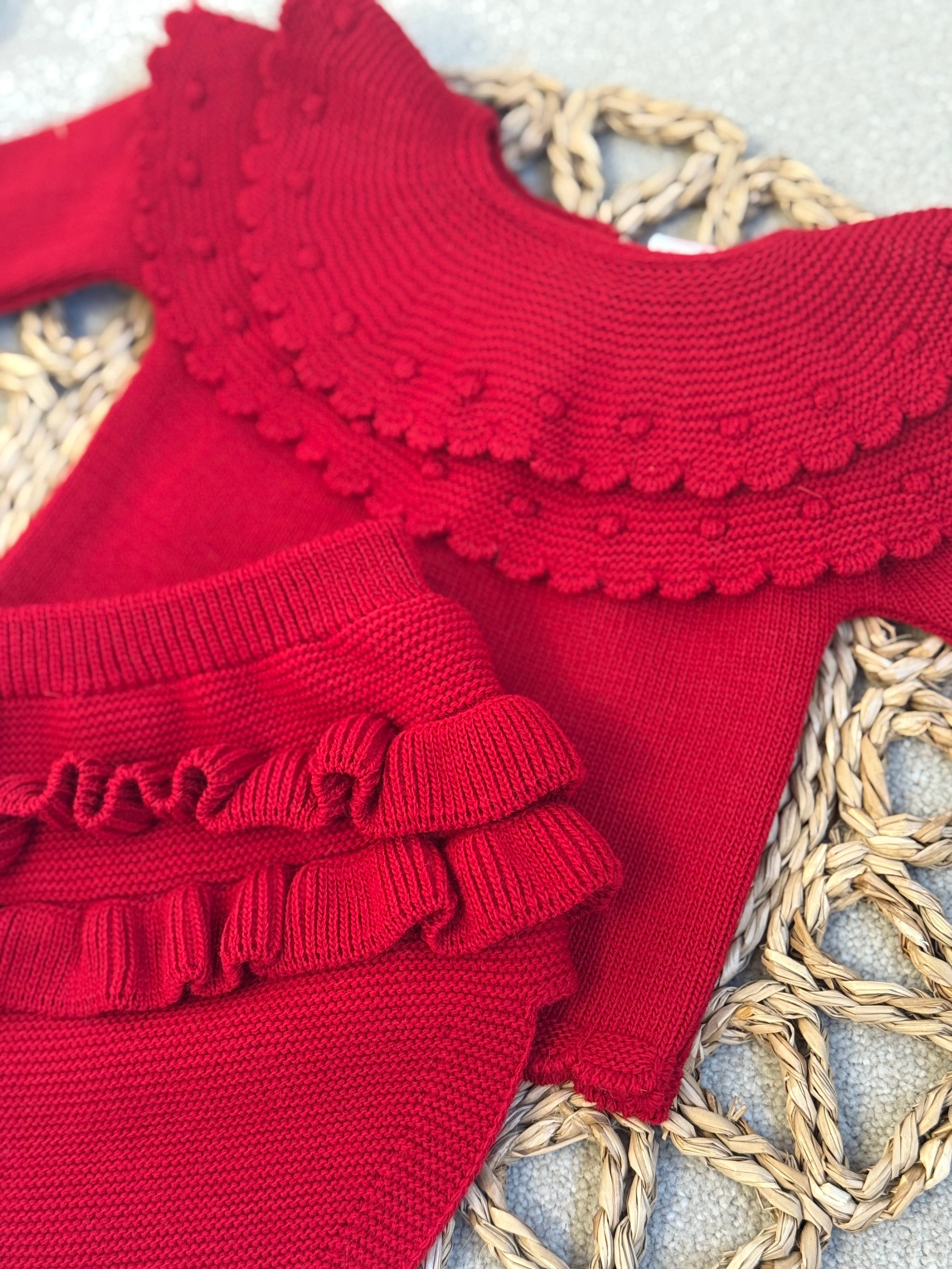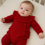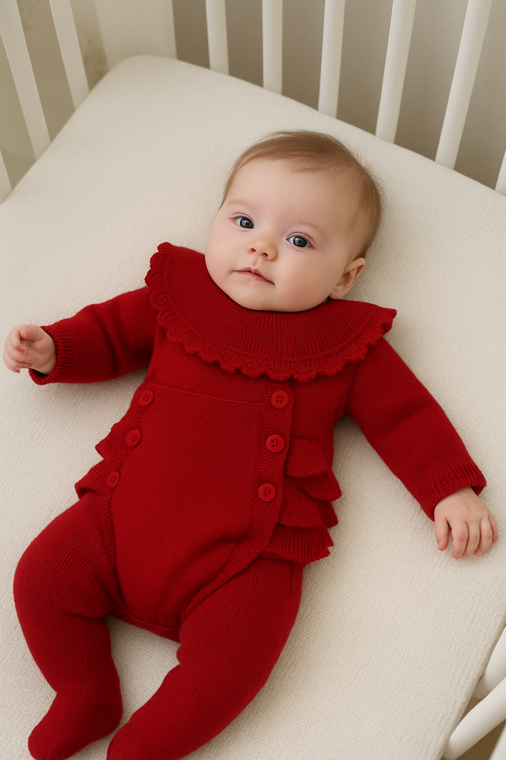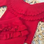 Dress your little one in timeless elegance with this beautiful Spanish baby outfit, crafted from soft acrylic wool for ultimate comfort and warmth. Designed with love and attention to detail, this two-piece set includes a long-sleeved top with a double-layered frill collar featuring delicate scalloped edging and textured bobble details, paired with matching button-front knitted shorts for a charming and traditional look.
