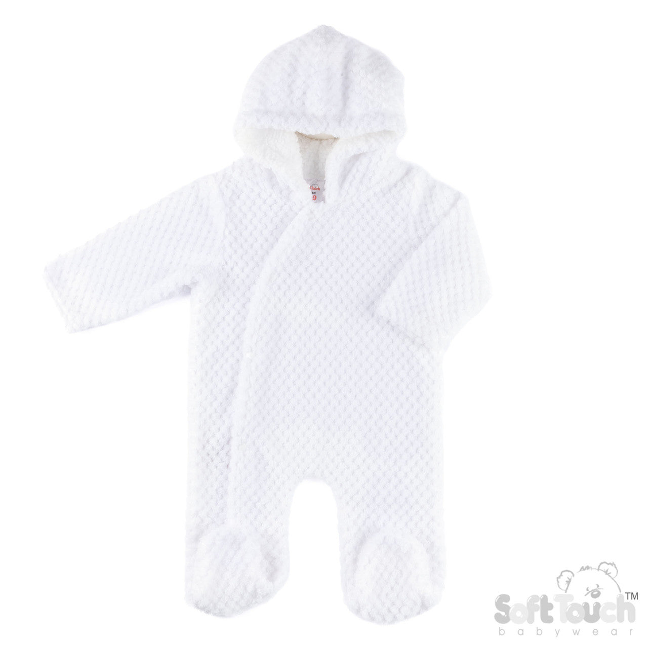 Keep your little one cozy and stylish with our Soft Touch white Textured Hooded Baby Pramsuit. Made from ultra-soft, plush fabric, this adorable all-in-one suit provides warmth and comfort for your baby during chilly days. The gentle pink color and delicate textured pattern add a touch of charm, while the fully lined hood and covered feet ensure extra snugness from head to toe.