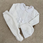 The top features a delicate textured knit design on the chest, complete with a smart white Peter Pan collar for a touch of classic charm. Softly knitted pants with enclosed feet ensure warmth and comfort, while the matching hat completes the look, making this set ideal for special occasions or everyday wear.