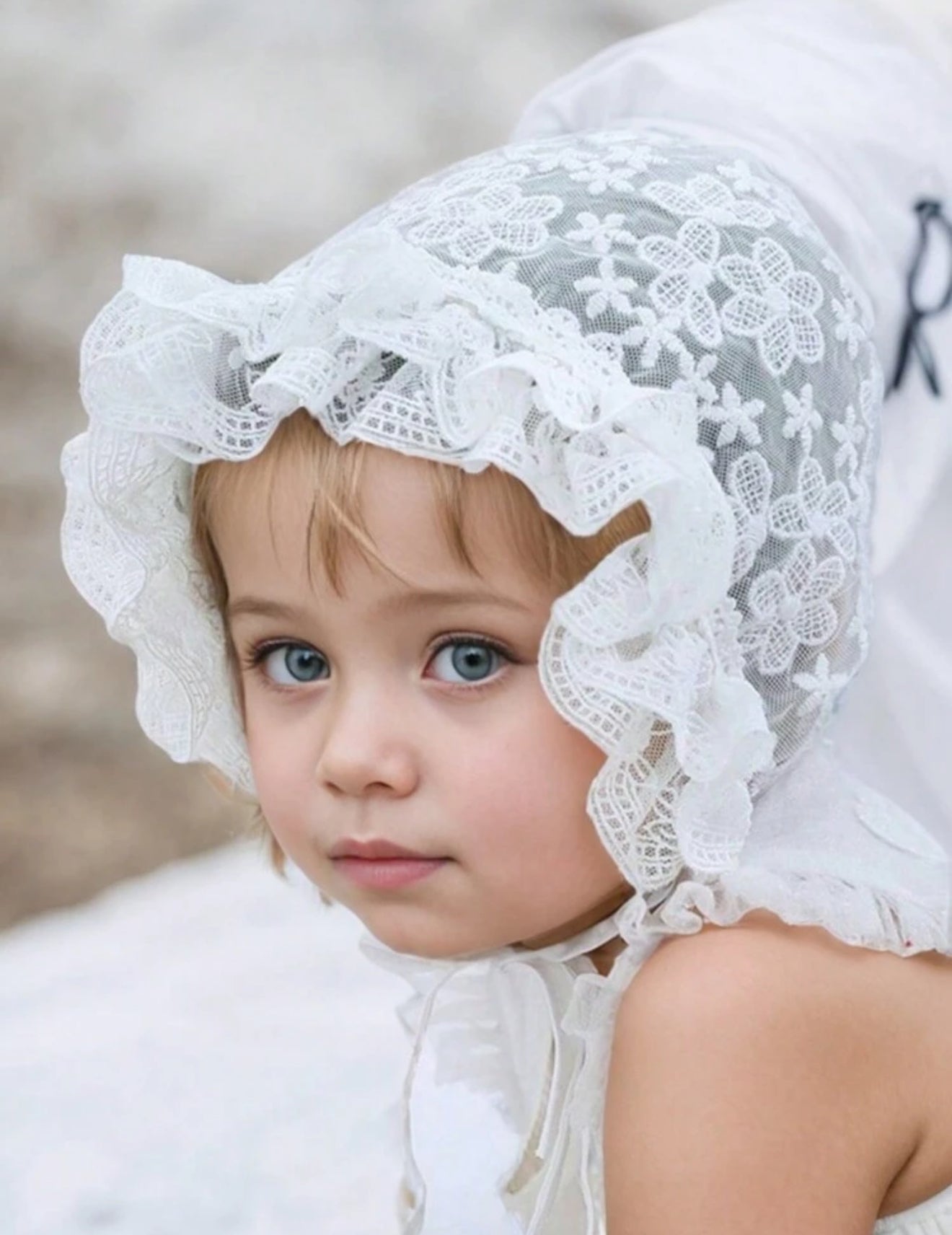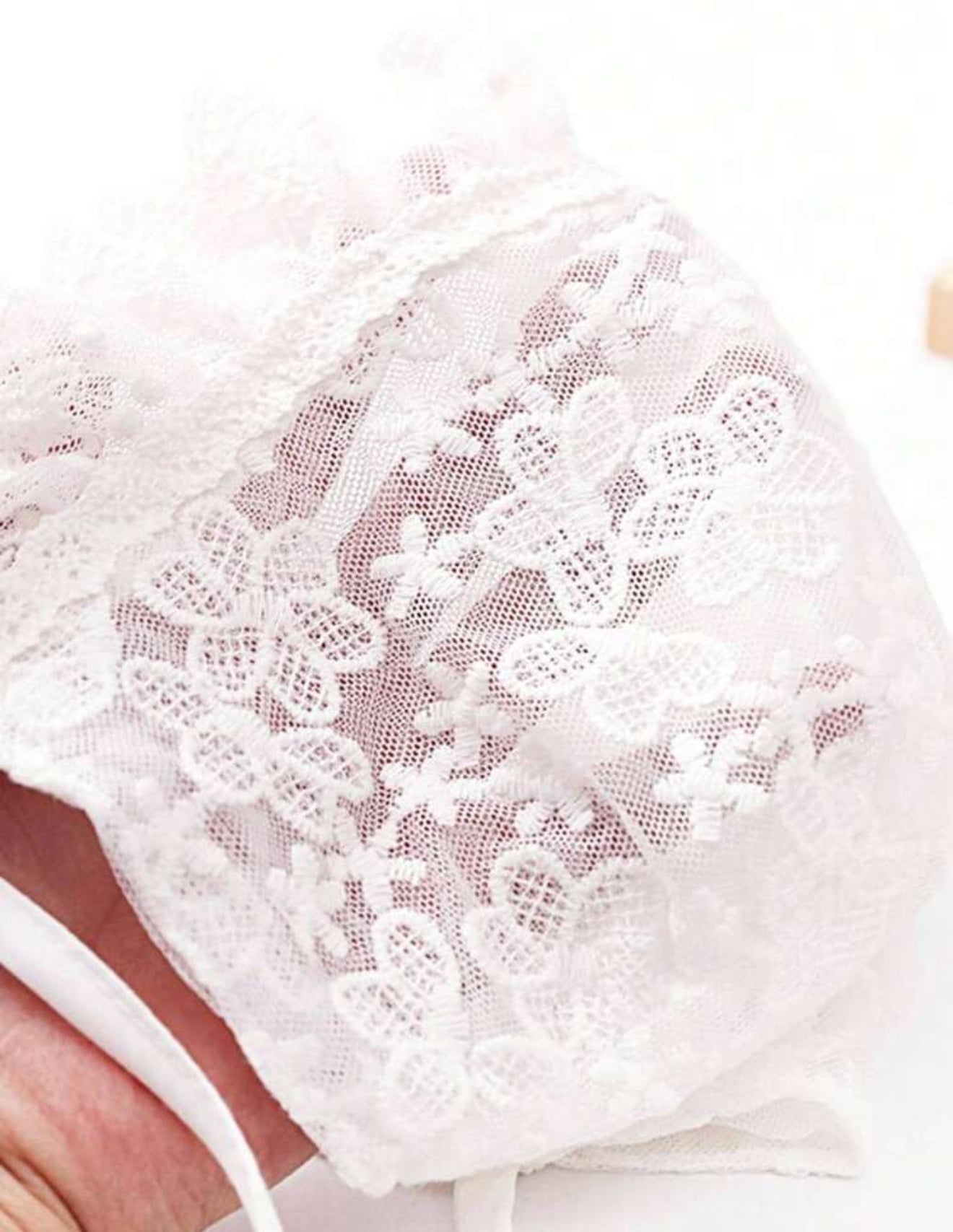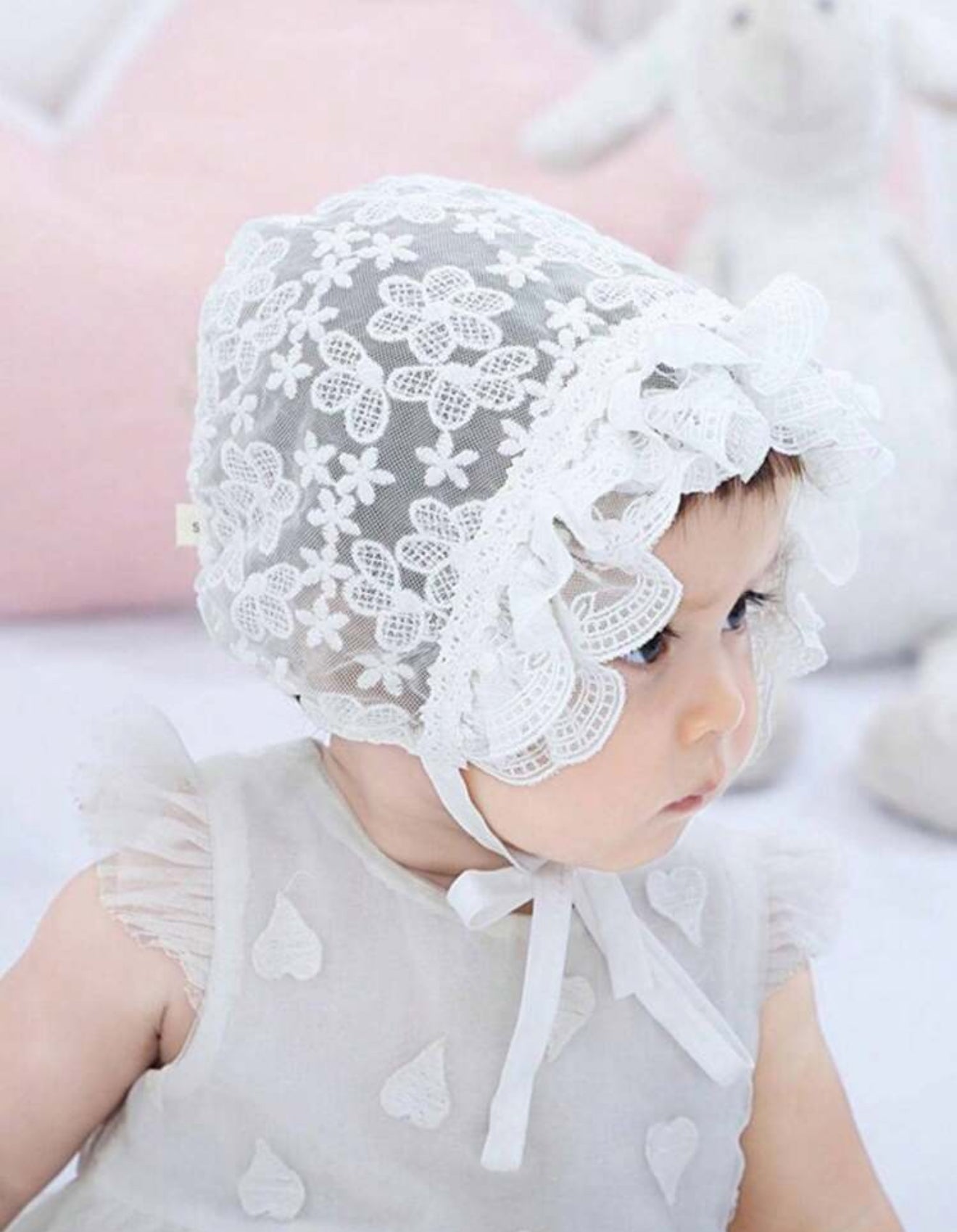 This charming baby girl’s vintage lace bonnet adds a delicate touch to any outfit. Crafted from soft, breathable fabric, it features intricate lace detailing that evokes timeless elegance. Perfect for special occasions, christenings , baptisms or everyday wear, this bonnet gently frames your baby’s face while offering comfort and warmth. With its adjustable tie closure, it ensures a snug fit, making it both stylish and practical. Ideal for keeping your little one cozy while adding a vintage-inspired flair to her wardrobe.