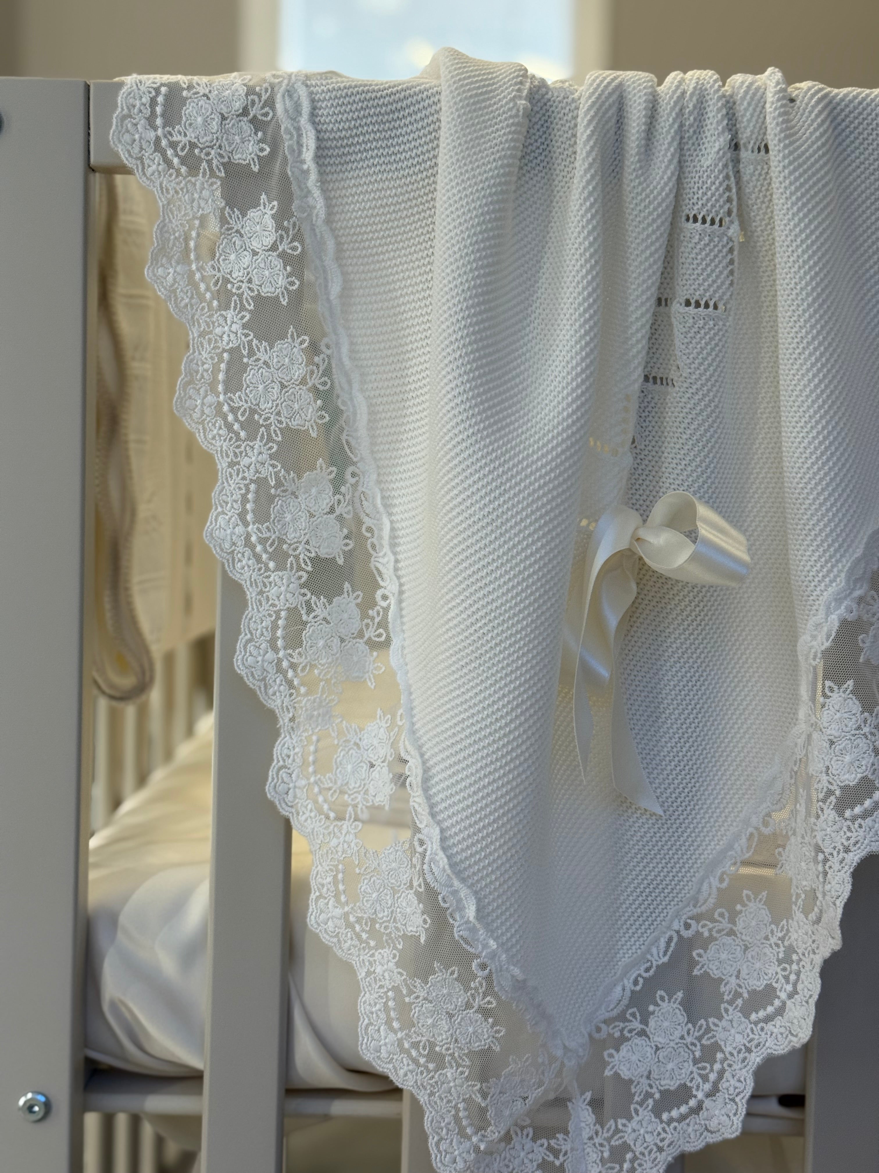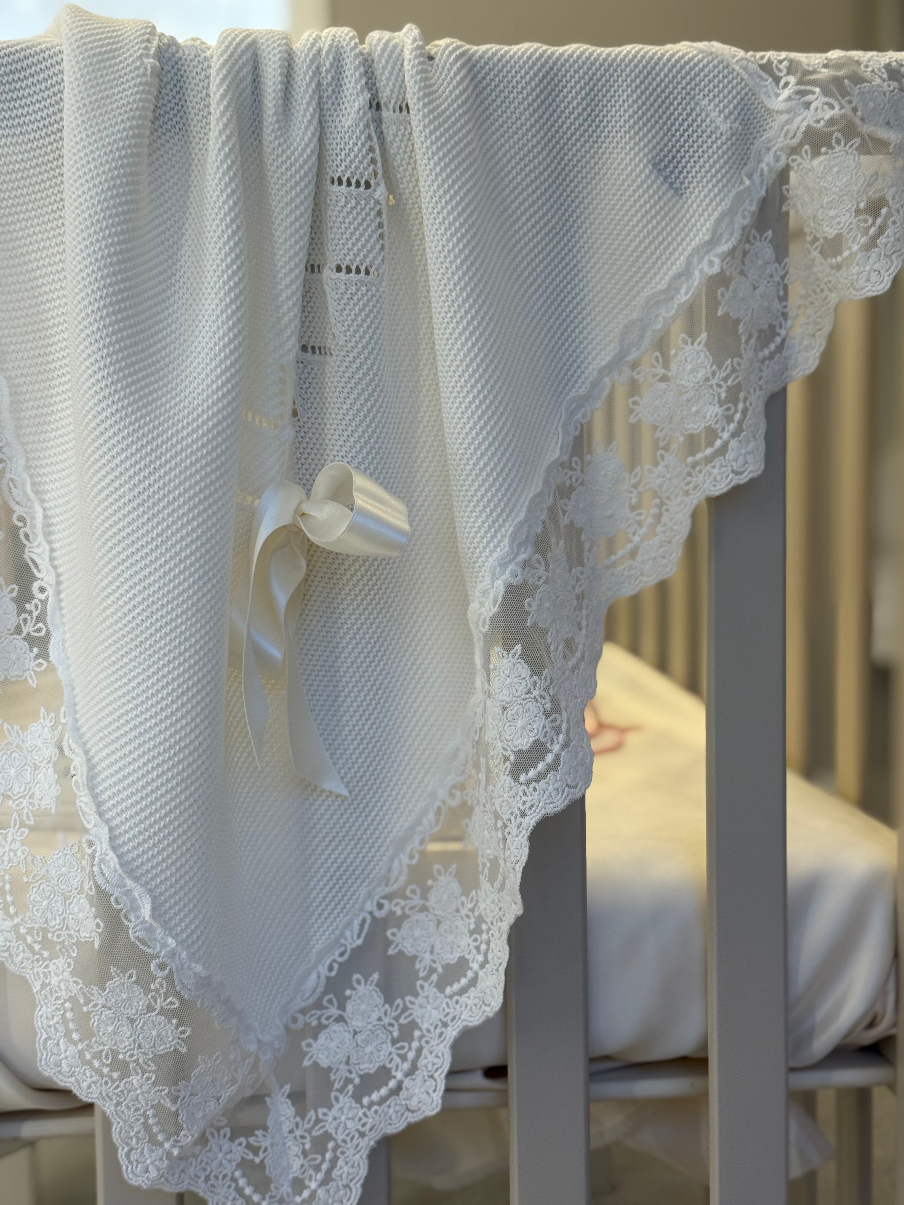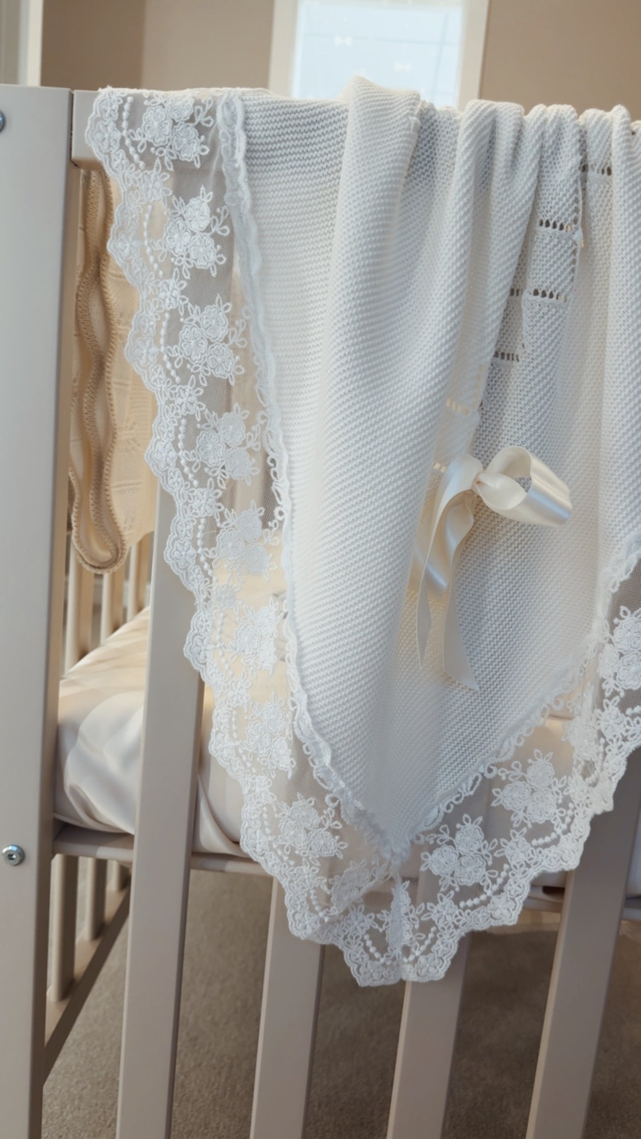Each piece is designed with love and care, creating a gentle touch against baby’s delicate skin. The intricate lace border adds a touch of luxury, making this blanket a beautiful heirloom to treasure for years to come.