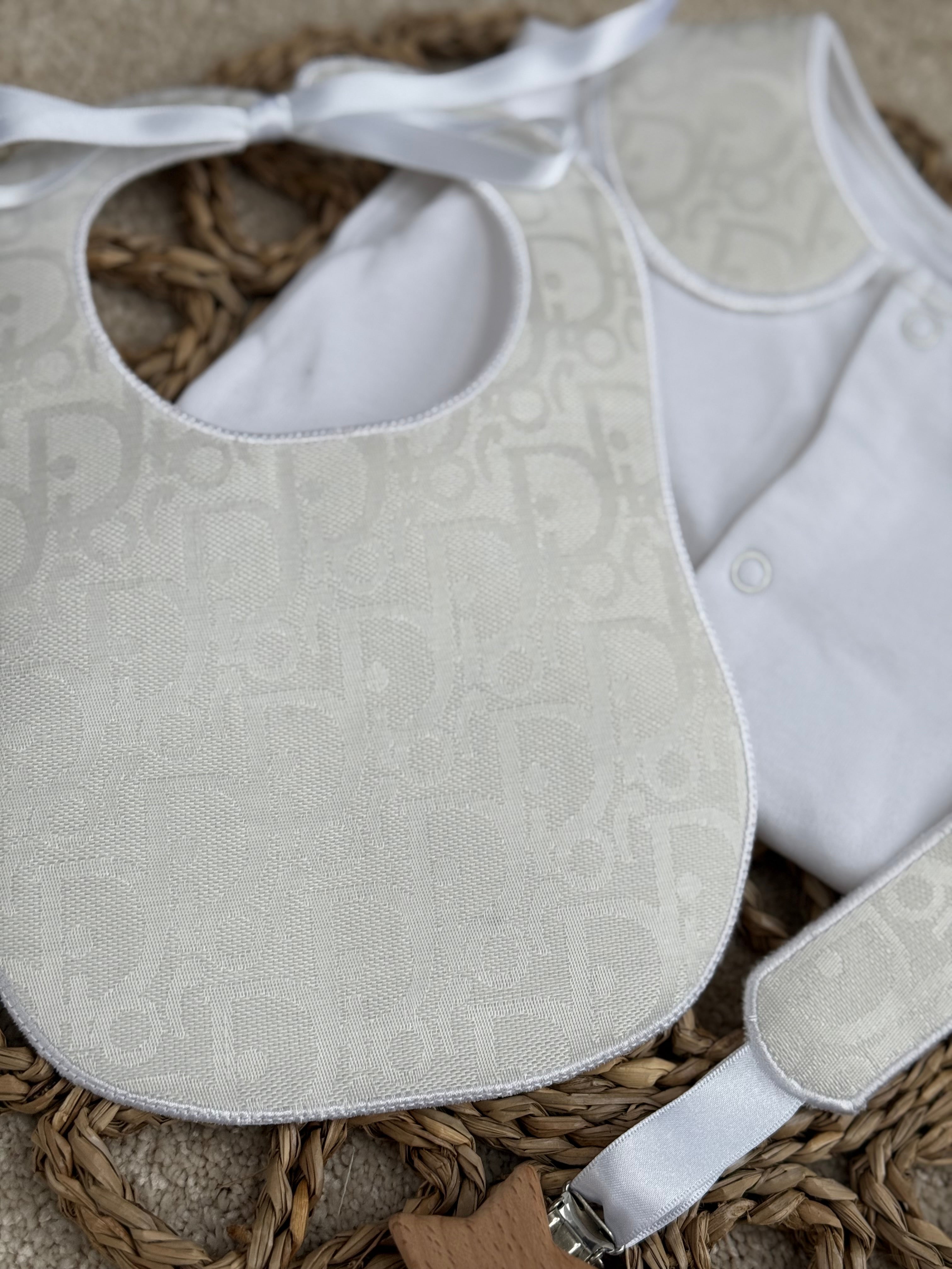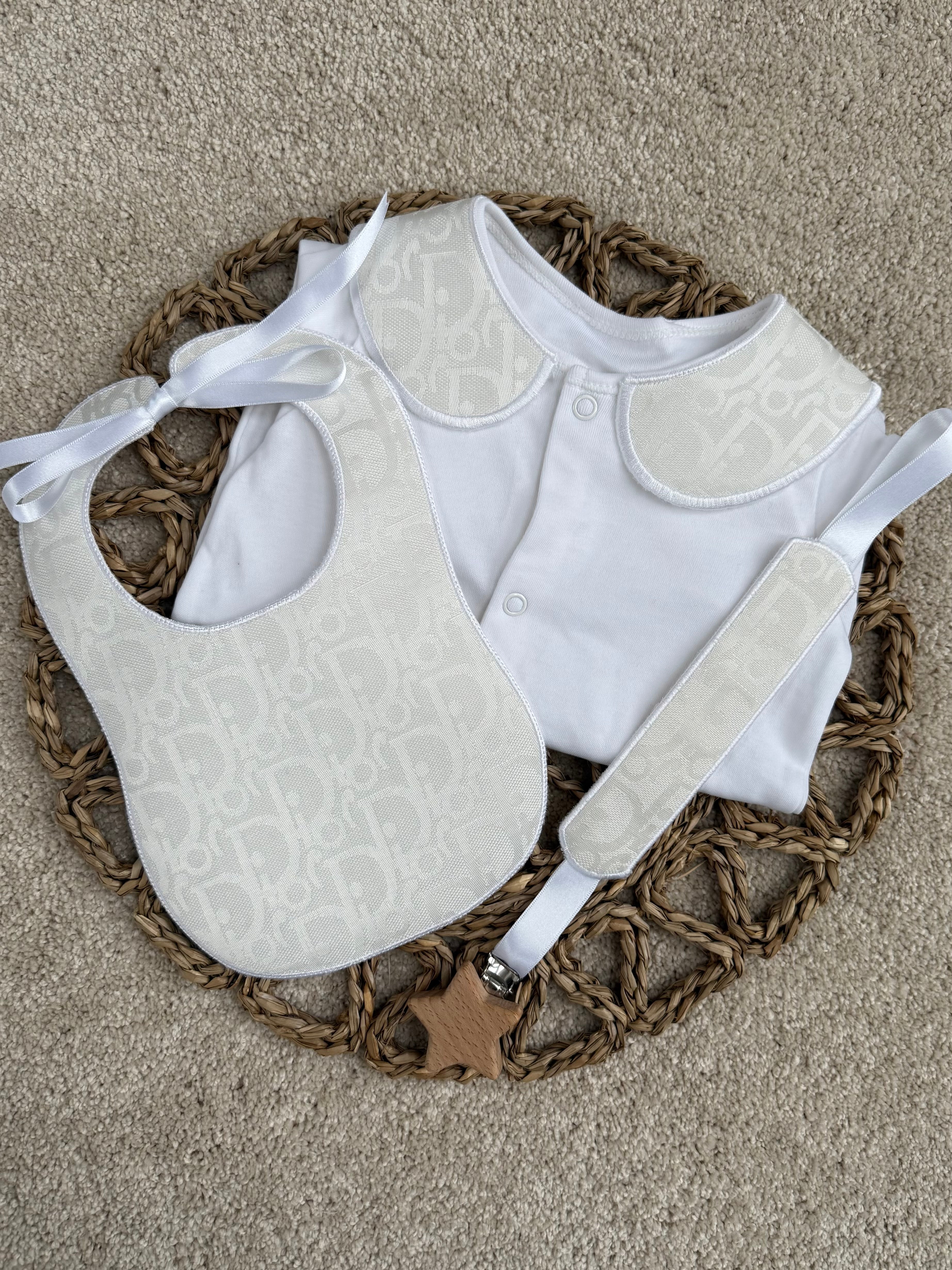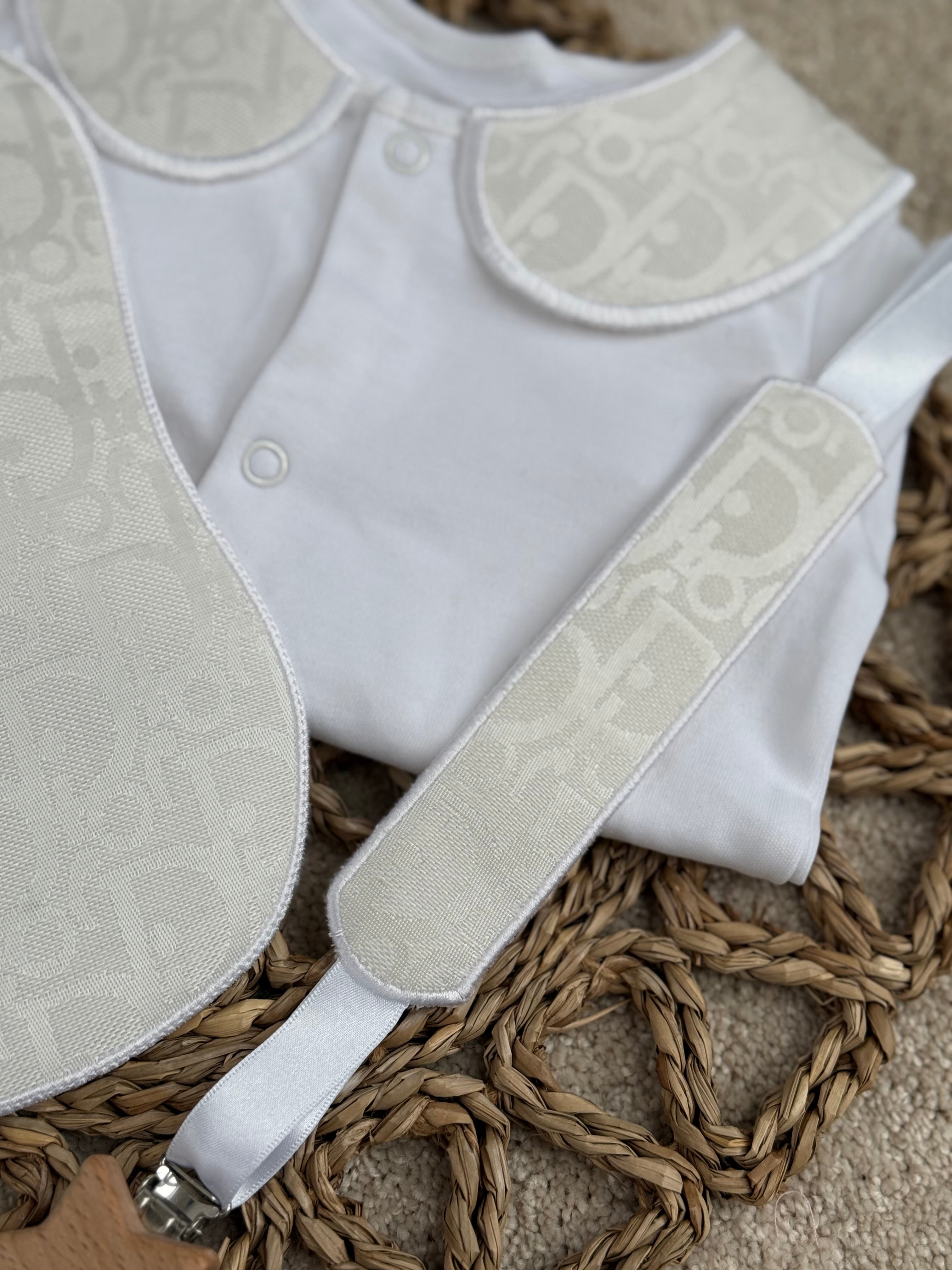Baby’s Unisex Pearl Handmade Sleepsuit, Bib & Dummy Clip Set