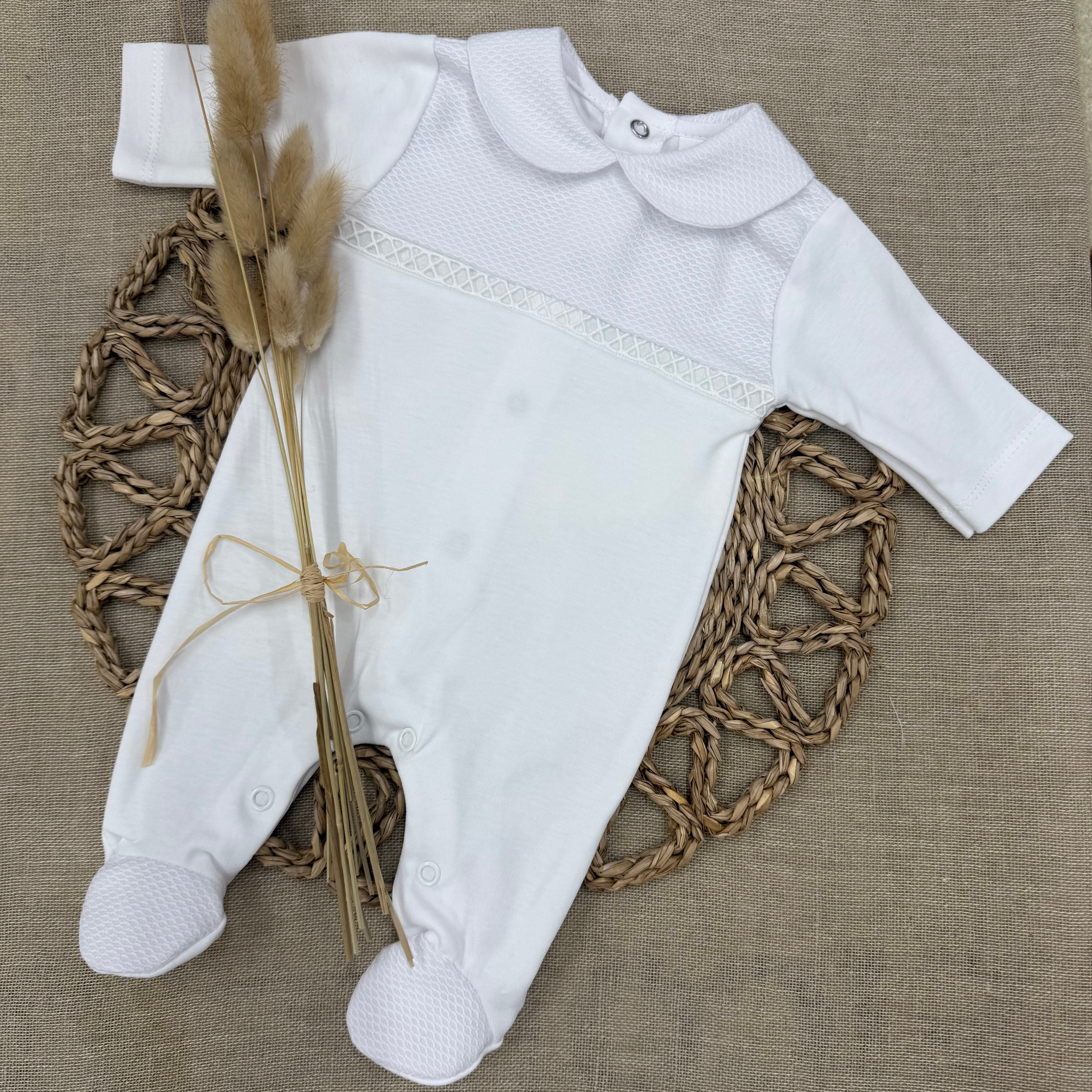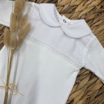 Keep your little one comfortable and stylish with this elegant white cotton sleepsuit. Made from soft, breathable fabric, it features a beautifully embroidered smocked panel on the chest for a traditional touch. The Peter Pan collar, finished with a delicate beige trim, adds classic charm. Designed with built-in feet for extra coziness and practical popper fastenings for easy changing, this sleepsuit is perfect for both everyday wear and special occasions.