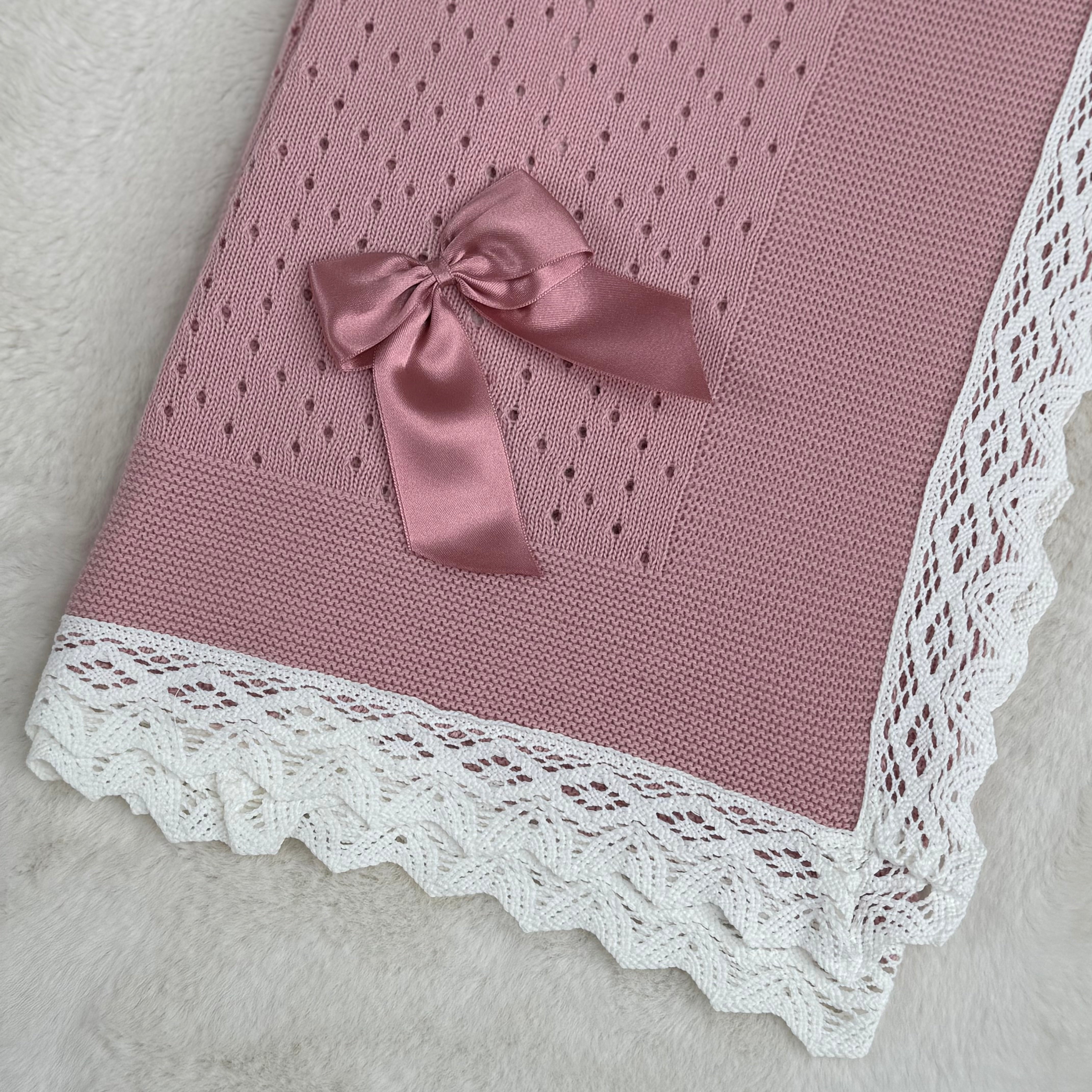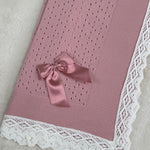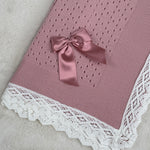 Baby's beautiful knitted Spanish shawl with lace trim and a lace bow, Perfect for a gift for a baby shower, birth or birthday! This luxury shawl is made from acrylic.