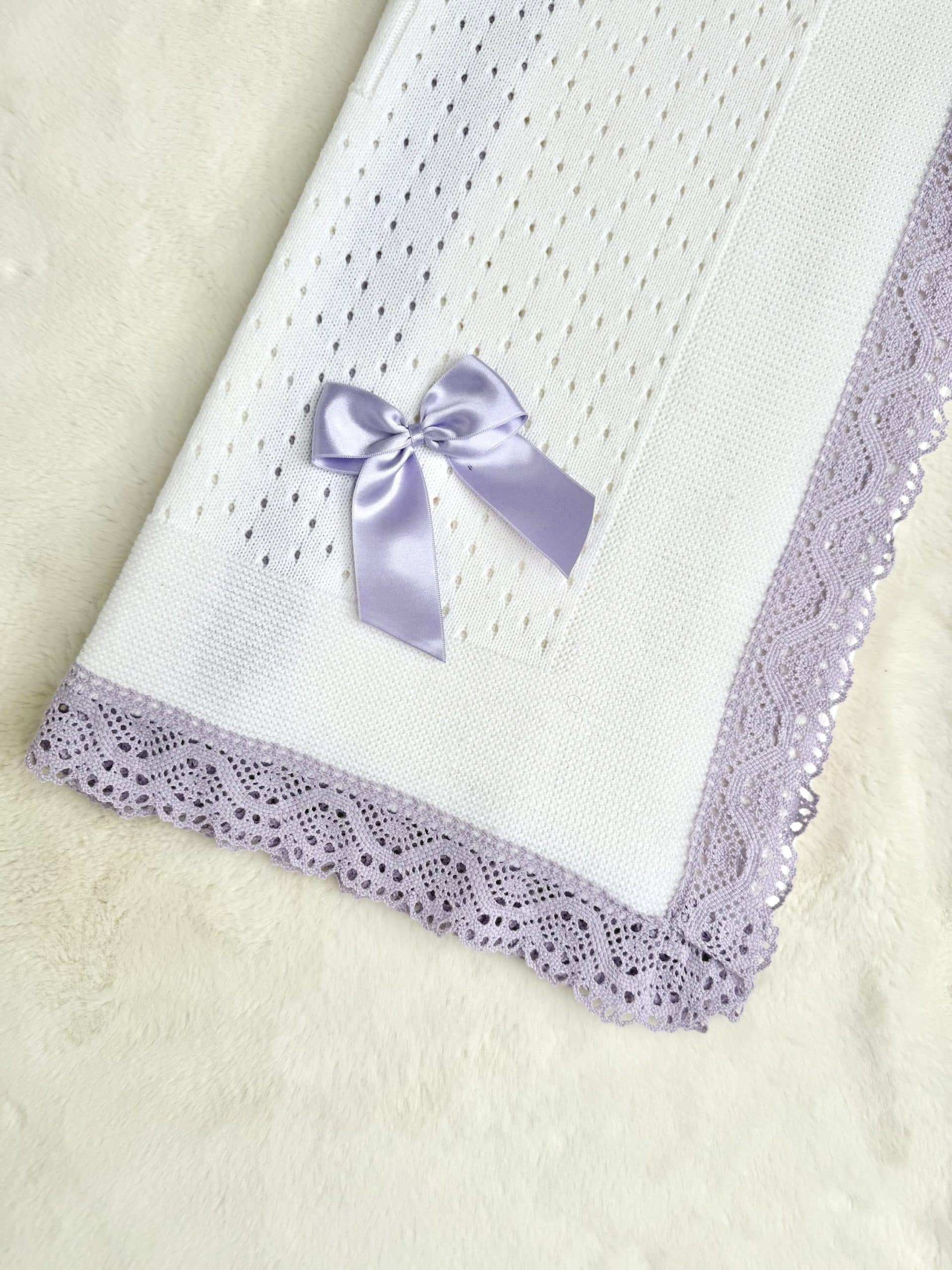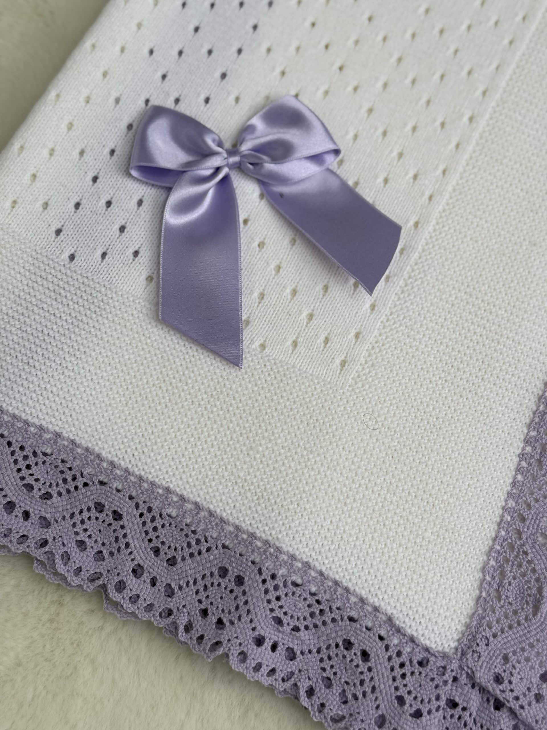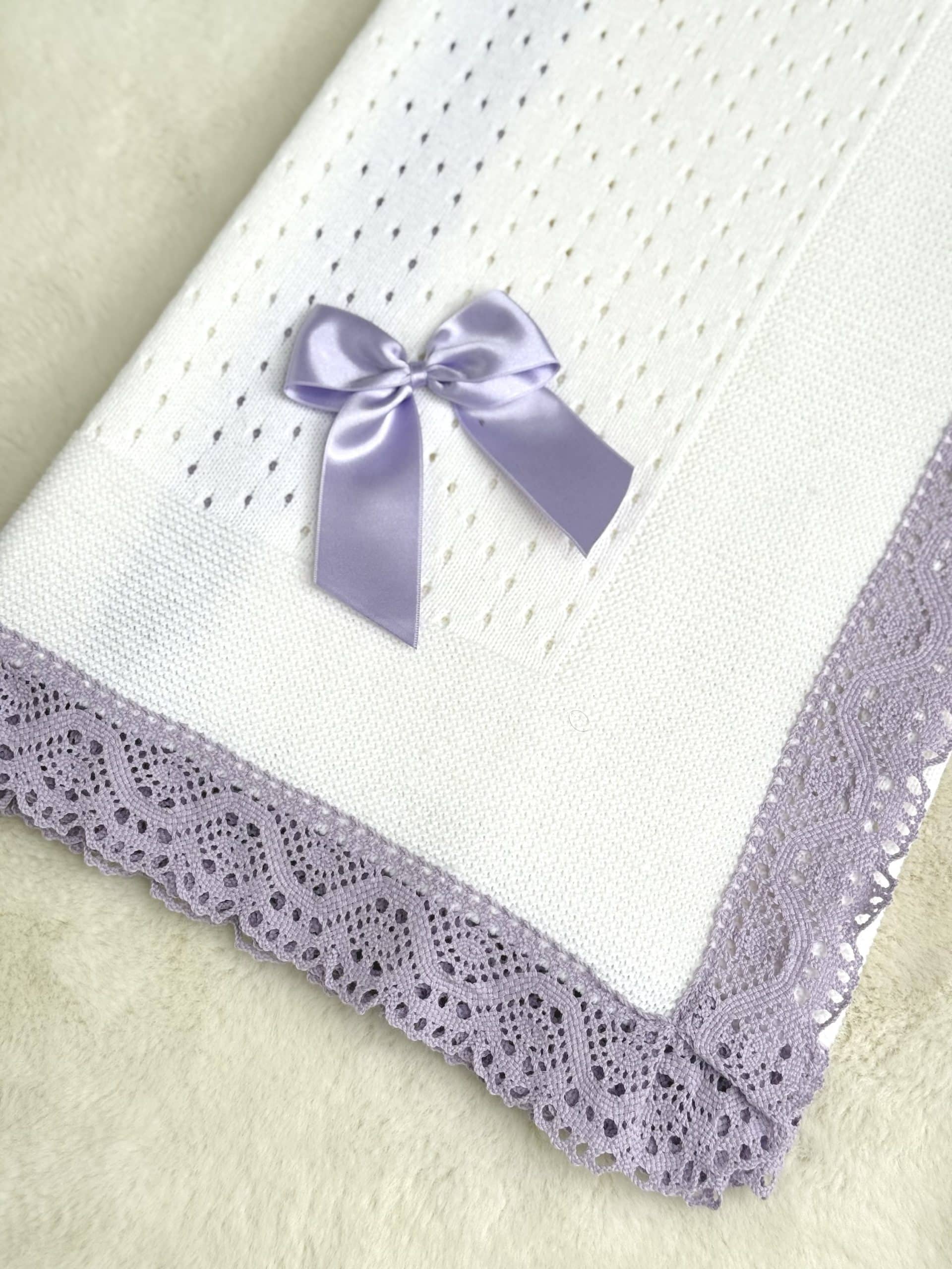 This luxurious baby knitted shawl is the perfect blend of comfort and elegance. Crafted from the softest acrylic, it features a delicate lace trim that adds a touch of vintage charm. A sweet ribbon bow ties it all together, making it an ideal accessory for any special occasion. Lightweight yet warm, this shawl will keep your little one cozy while offering a sophisticated look. Perfect for wrapping up your baby in a cloud of softness and style.