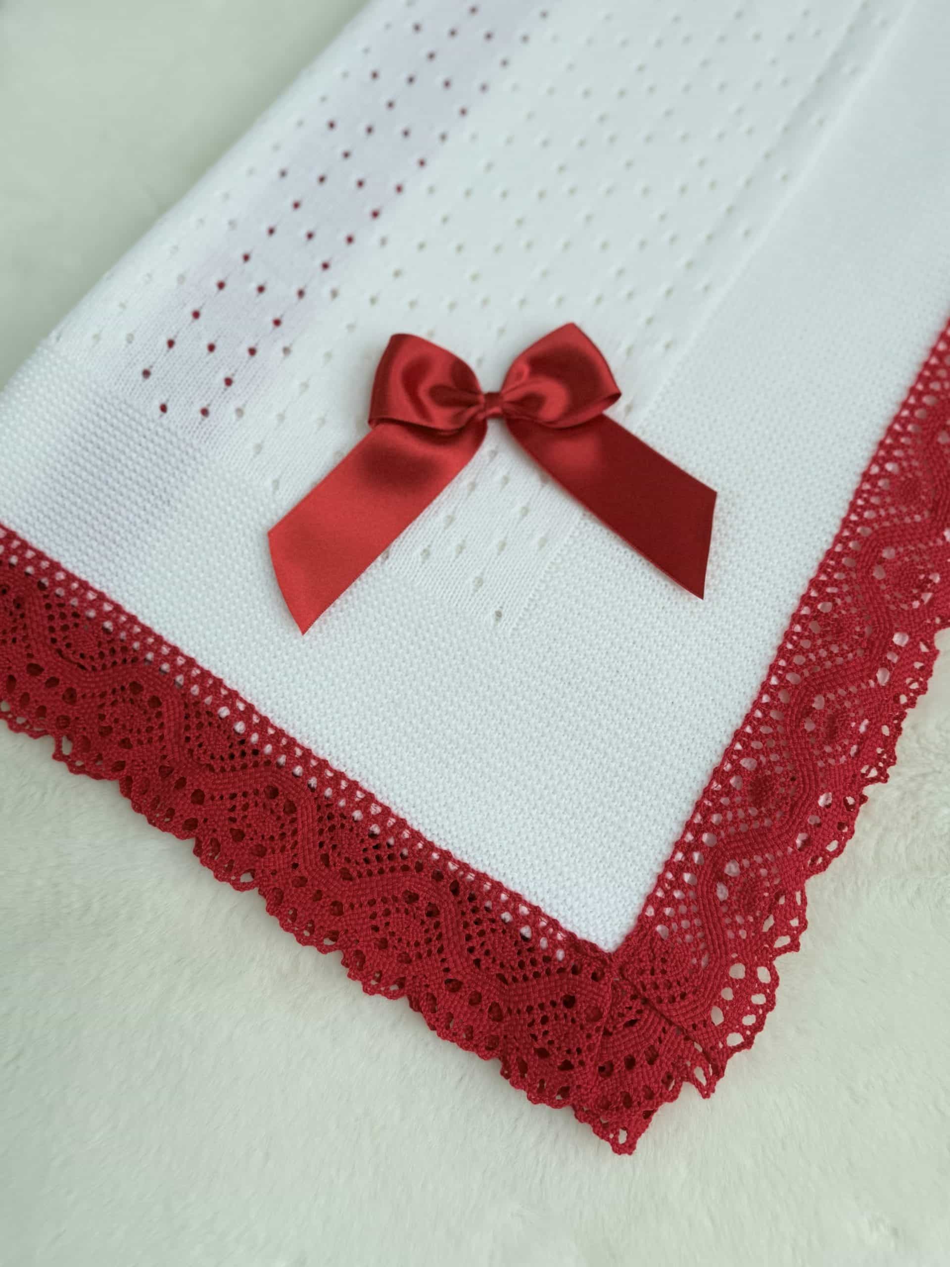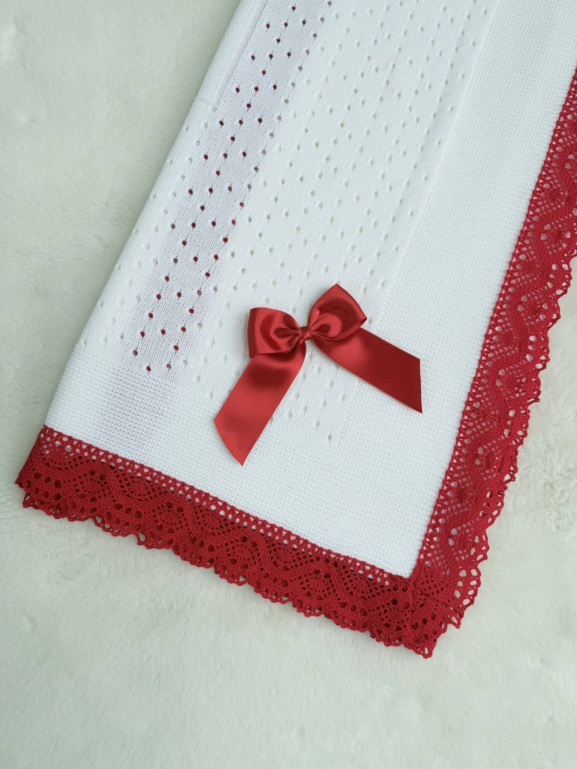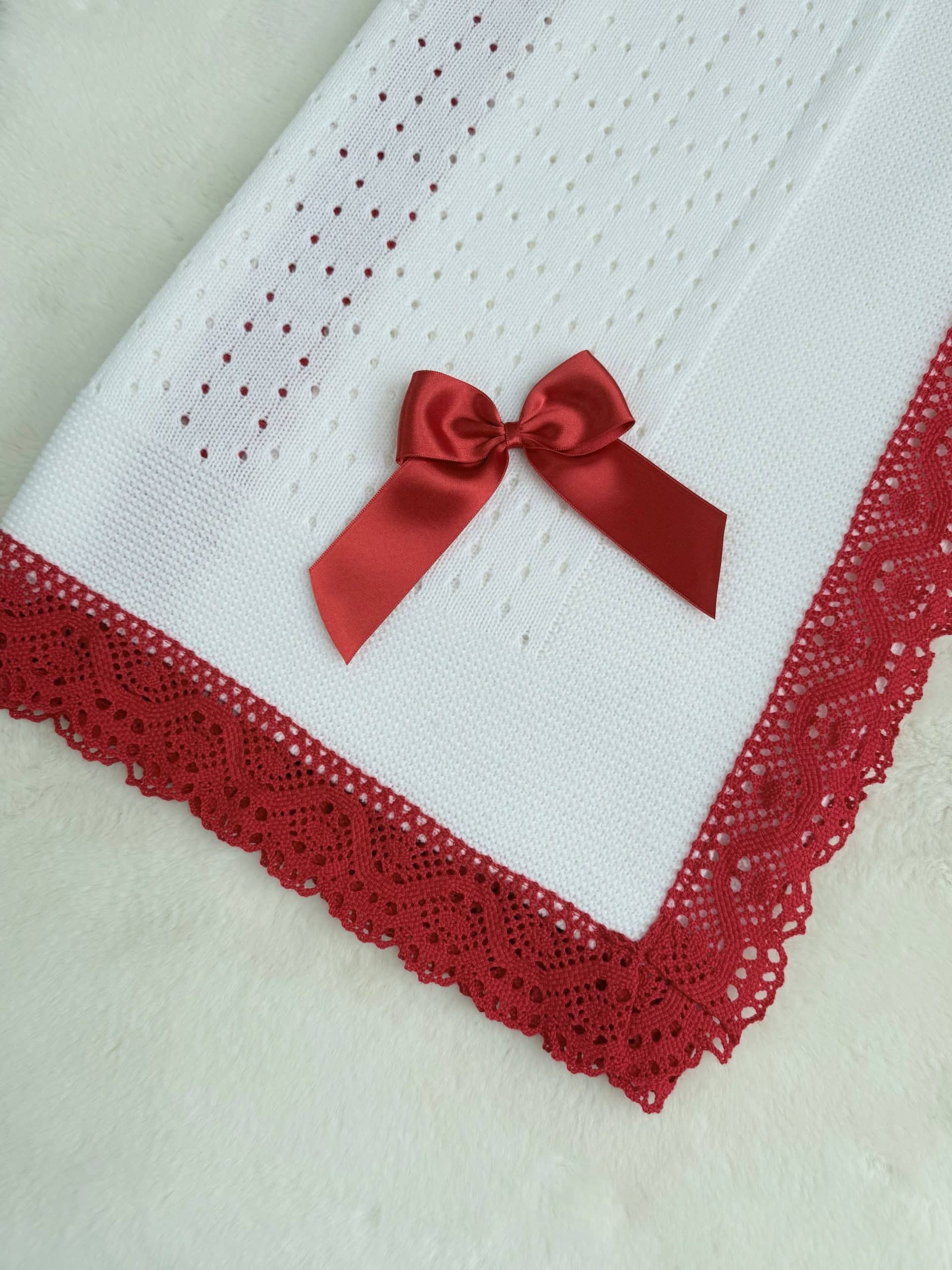 This luxurious baby knitted shawl is the perfect blend of comfort and elegance. Crafted from the softest acrylic, it features a delicate lace trim that adds a touch of vintage charm. A sweet ribbon bow ties it all together, making it an ideal accessory for any special occasion. Lightweight yet warm, this shawl will keep your little one cozy while offering a sophisticated look. Perfect for wrapping up your baby in a cloud of softness and style.