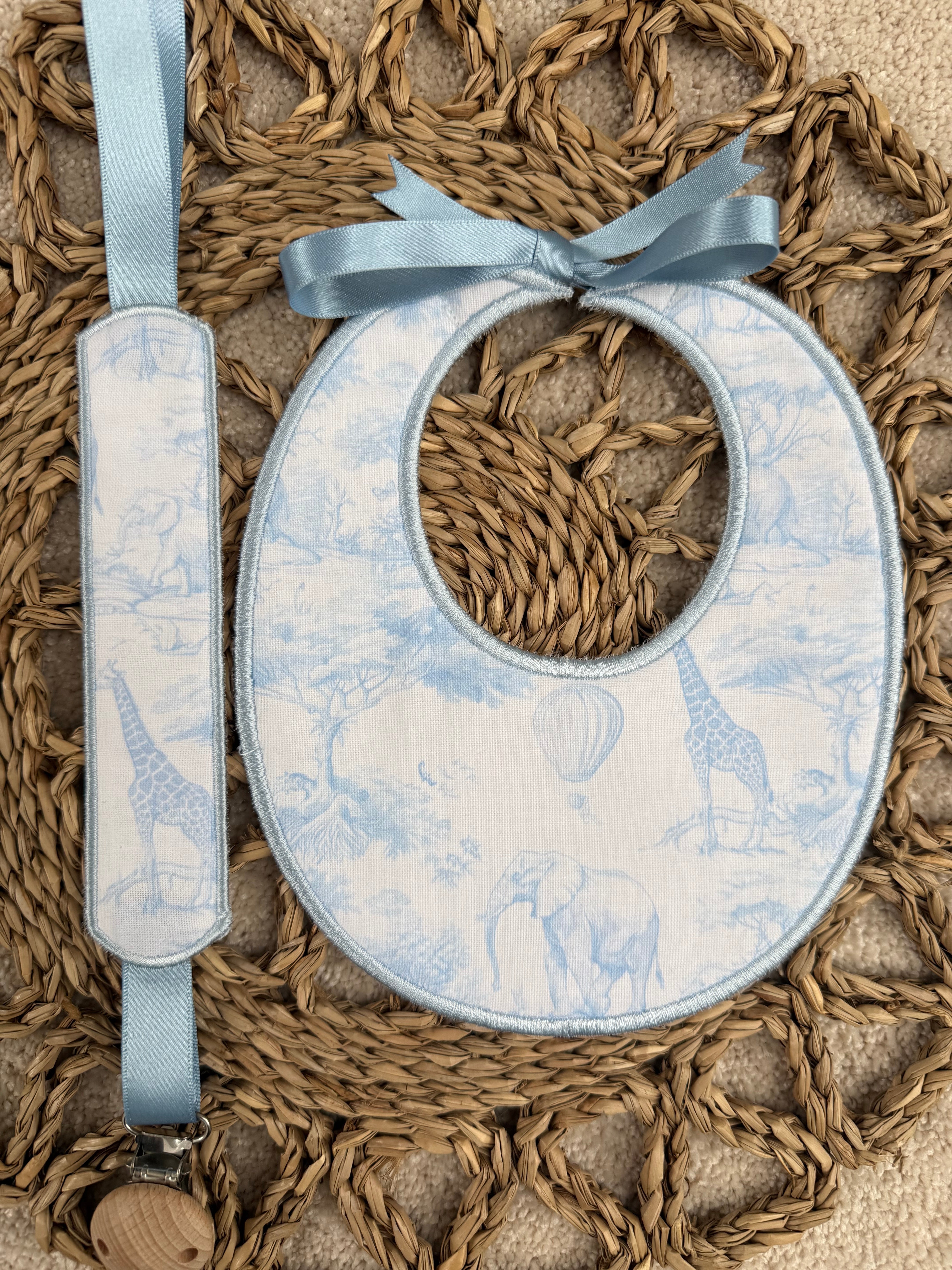 Baby's Safari Blue Round Handmade Bib & Dummy Clip
