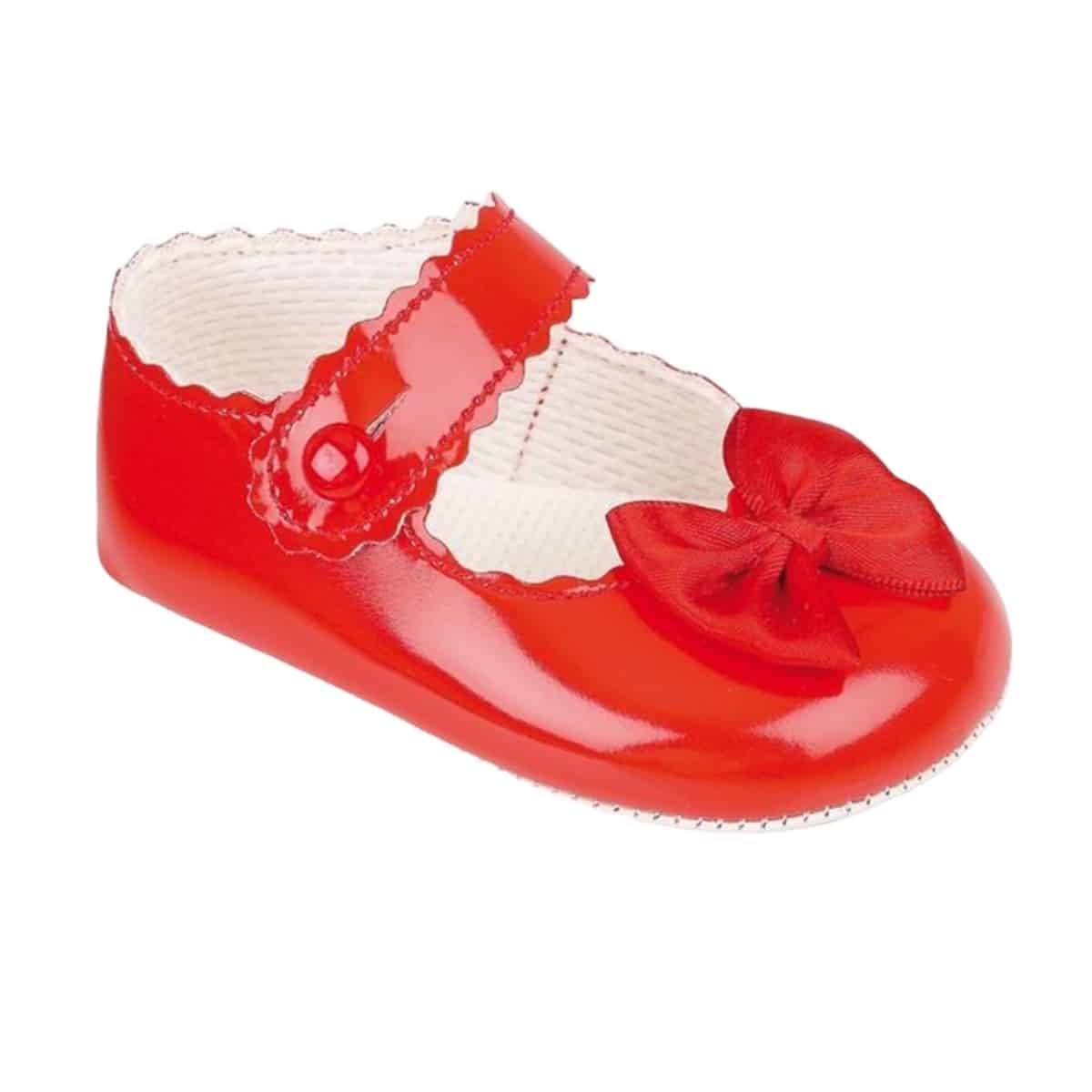 Red pre-walker shoes by Early Days Baypods, made in soft faux patent leather with pretty satin bows on the toes. They have a flexible sole and a comfortable lightly padded insole, with a button fastening strap.
