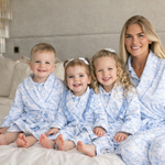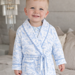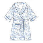 Featuring our signature classic blue toile print, this timeless piece brings a traditional, heirloom feel to everyday lounging. The wrap-style design with a tie waist ensures an adjustable, secure fit, while the soft collar and delicate piping add that premium finish you expect from Perfect Little Thing.