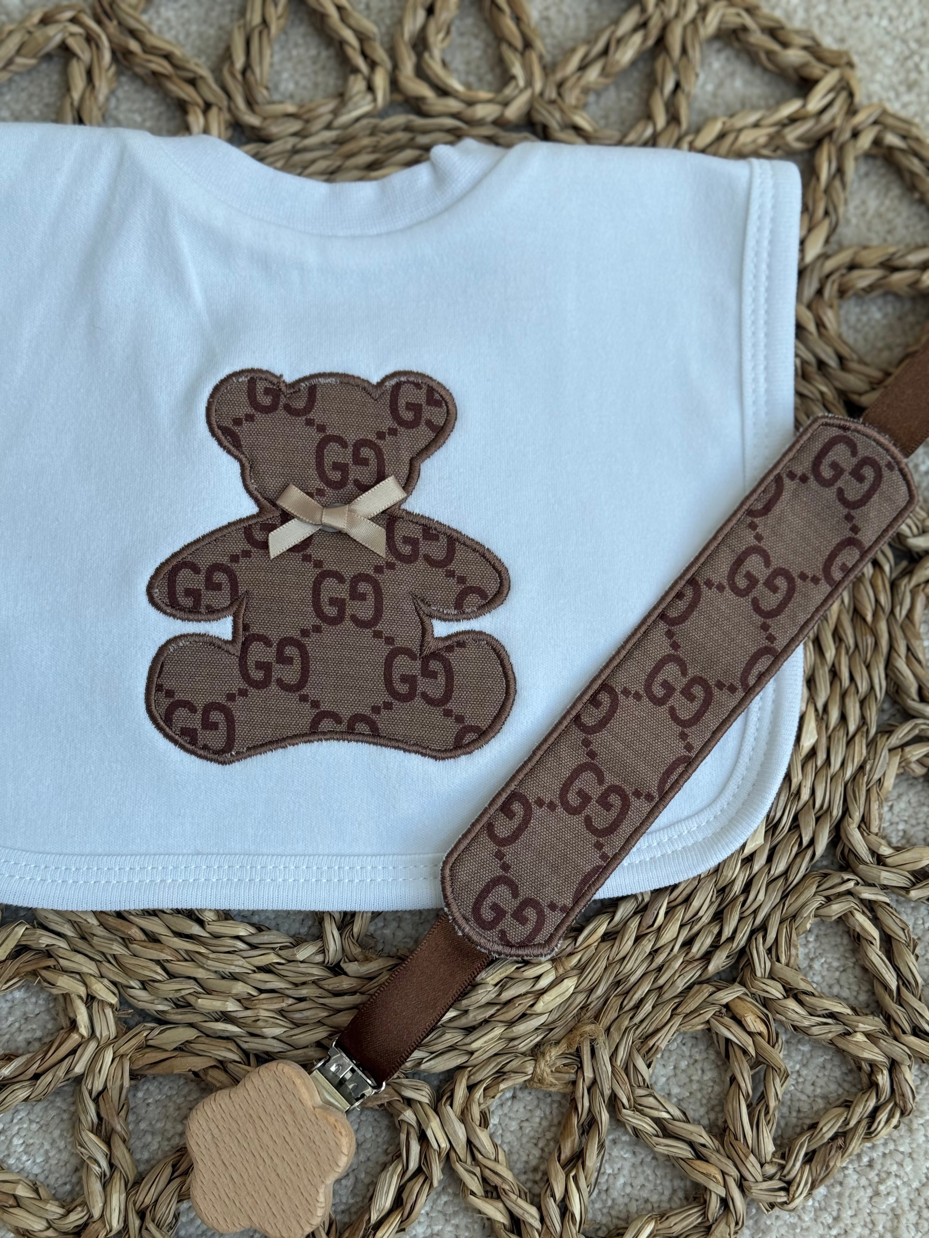 Brown Teddy Appliqué Bib & Handmade Dummy Clip Set