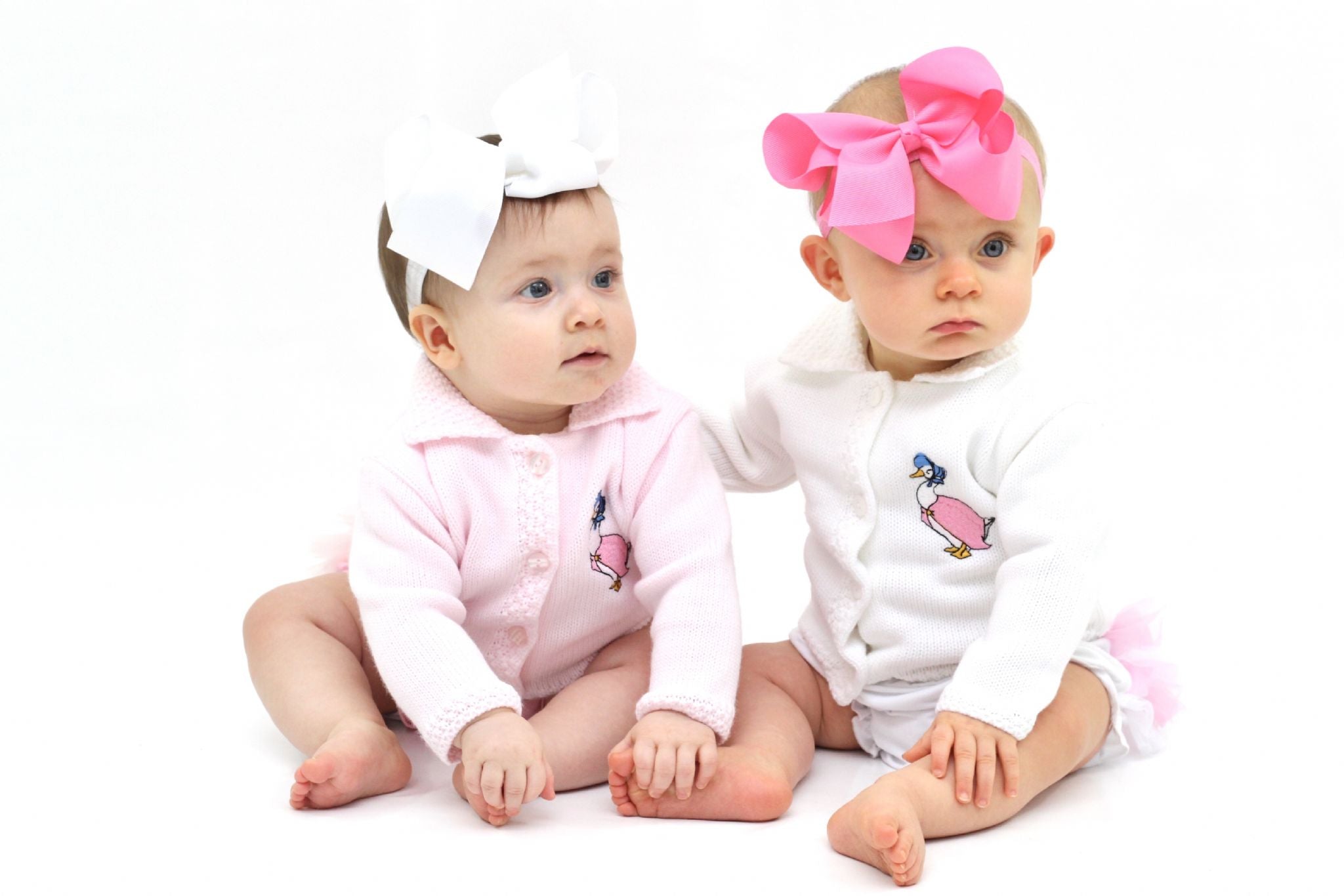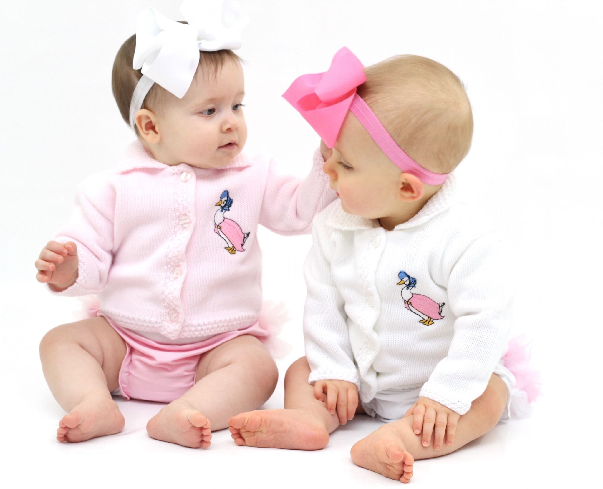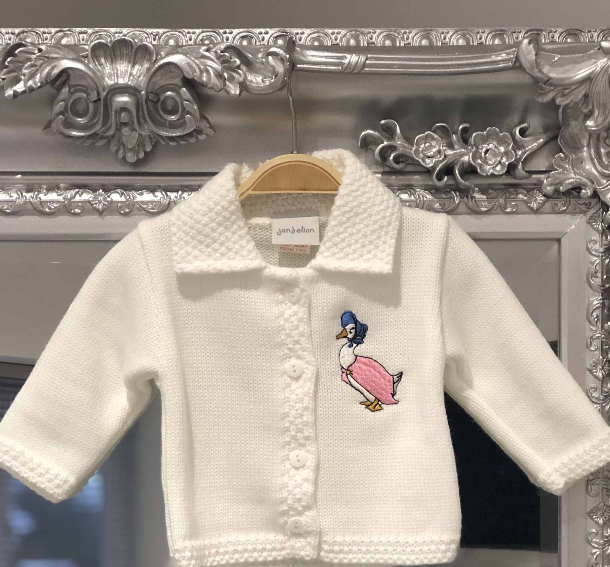 Beautiful quality traditional girls knitted cardigan from Dandelion Knitwear with Jemima Puddle Duck embroidery to chest.