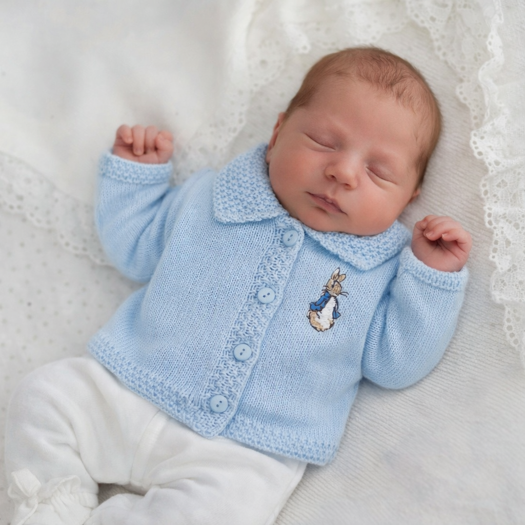 Beautiful quality traditional boys knitted cardigan from Dandelion Knitwear with Peter Rabbit embroidery to chest.