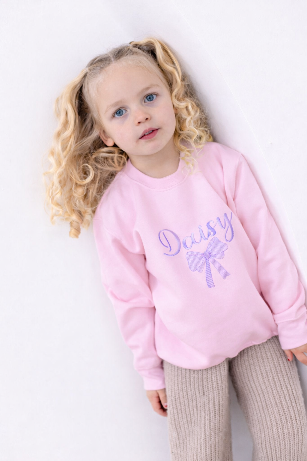 Each jumper is custom embroidered with your child’s name, finished with a delicate bow detail for that extra touch of luxury. The relaxed fit makes it perfect for playdays, outings, and special moments, while still keeping little ones comfy all day long.