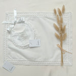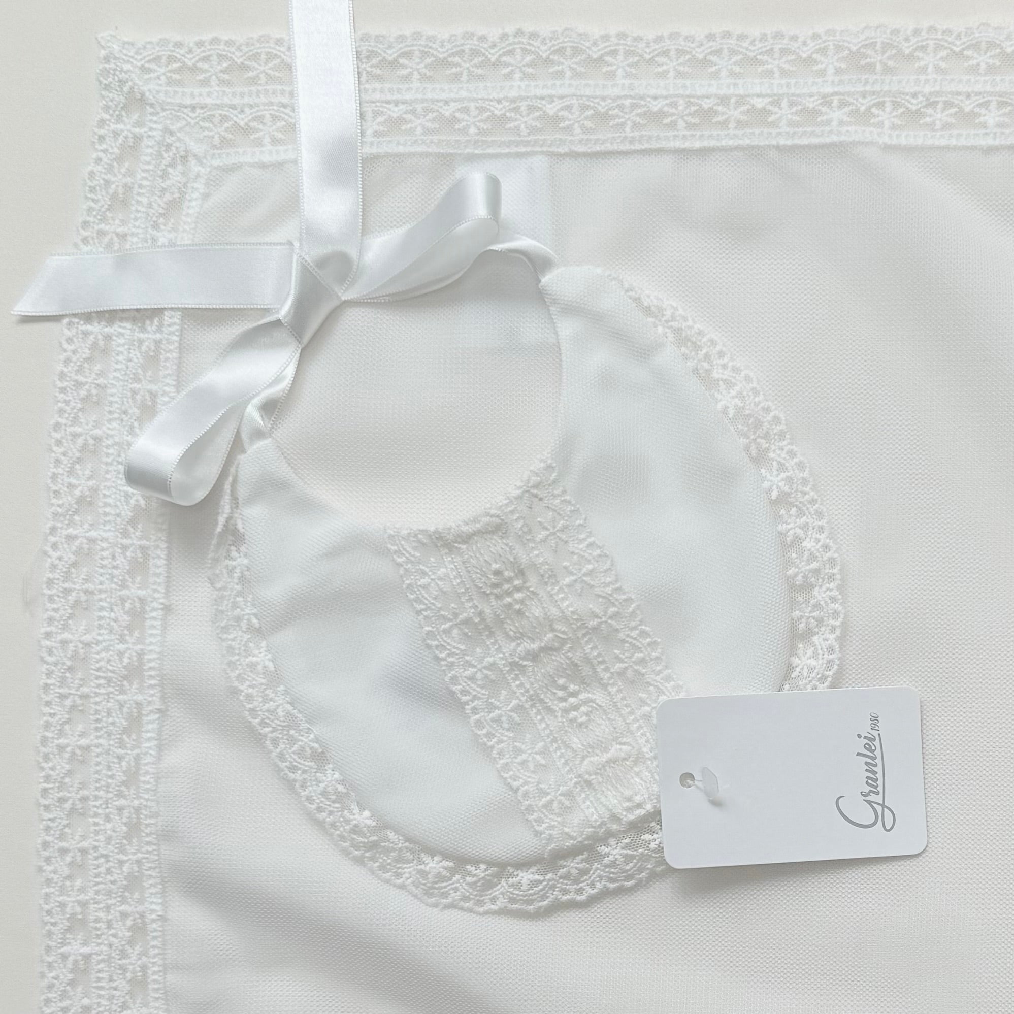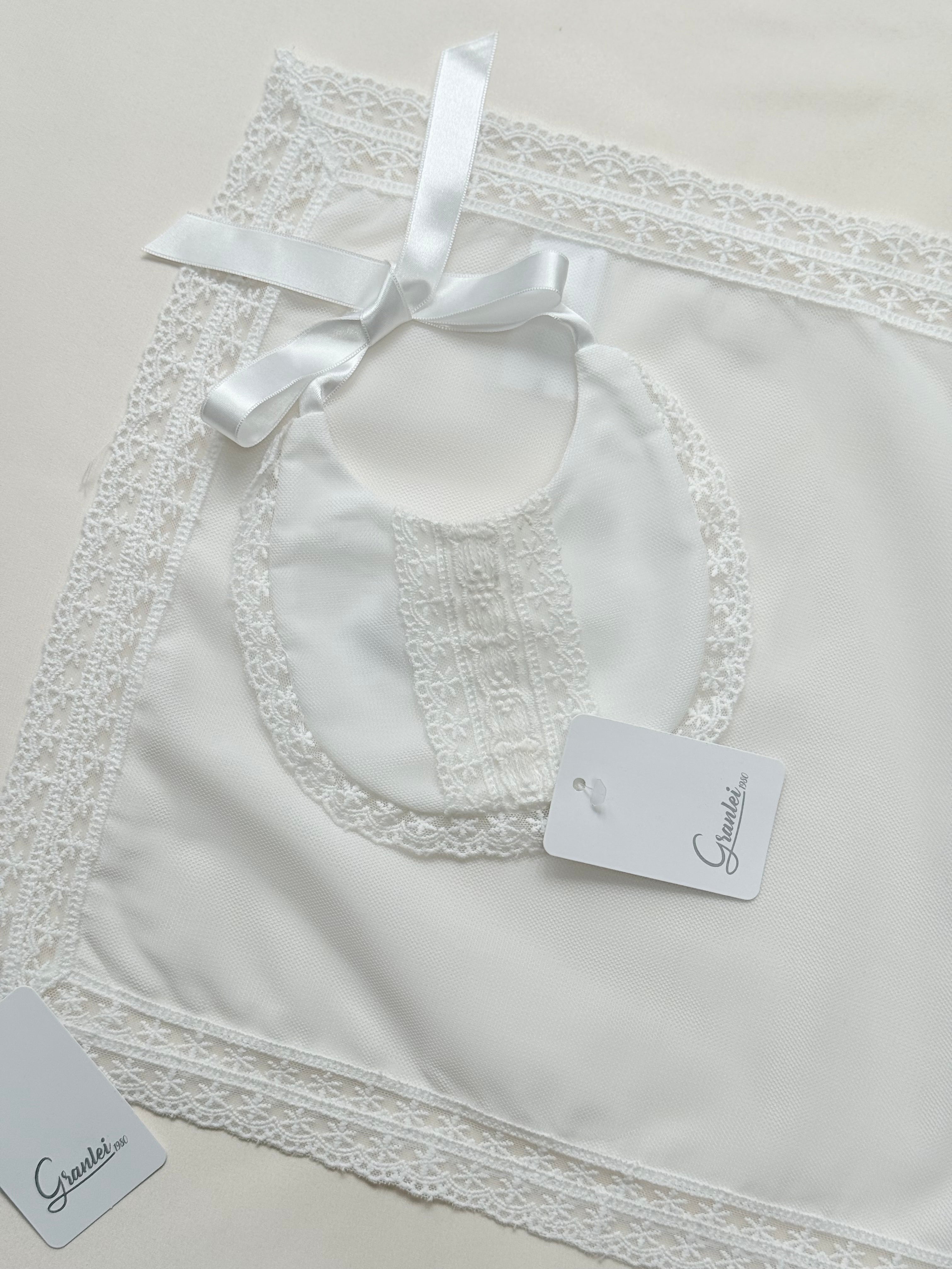 This beautiful Granlei Spanish lace bib and muslin set is the perfect blend of tradition, elegance and timeless luxury. Made in Spain by the renowned brand Granlei, this exquisite set is designed for special moments, christenings, and keepsake gifts.