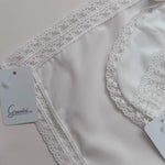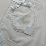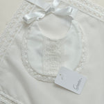 Crafted in a soft ivory tone, the muslin features delicate lace edging, while the matching bib is finished with intricate lace detailing and a classic satin ribbon tie for a truly refined look. A stunning choice for newborns and infants, this set adds a touch of Spanish charm to any baby’s wardrobe.