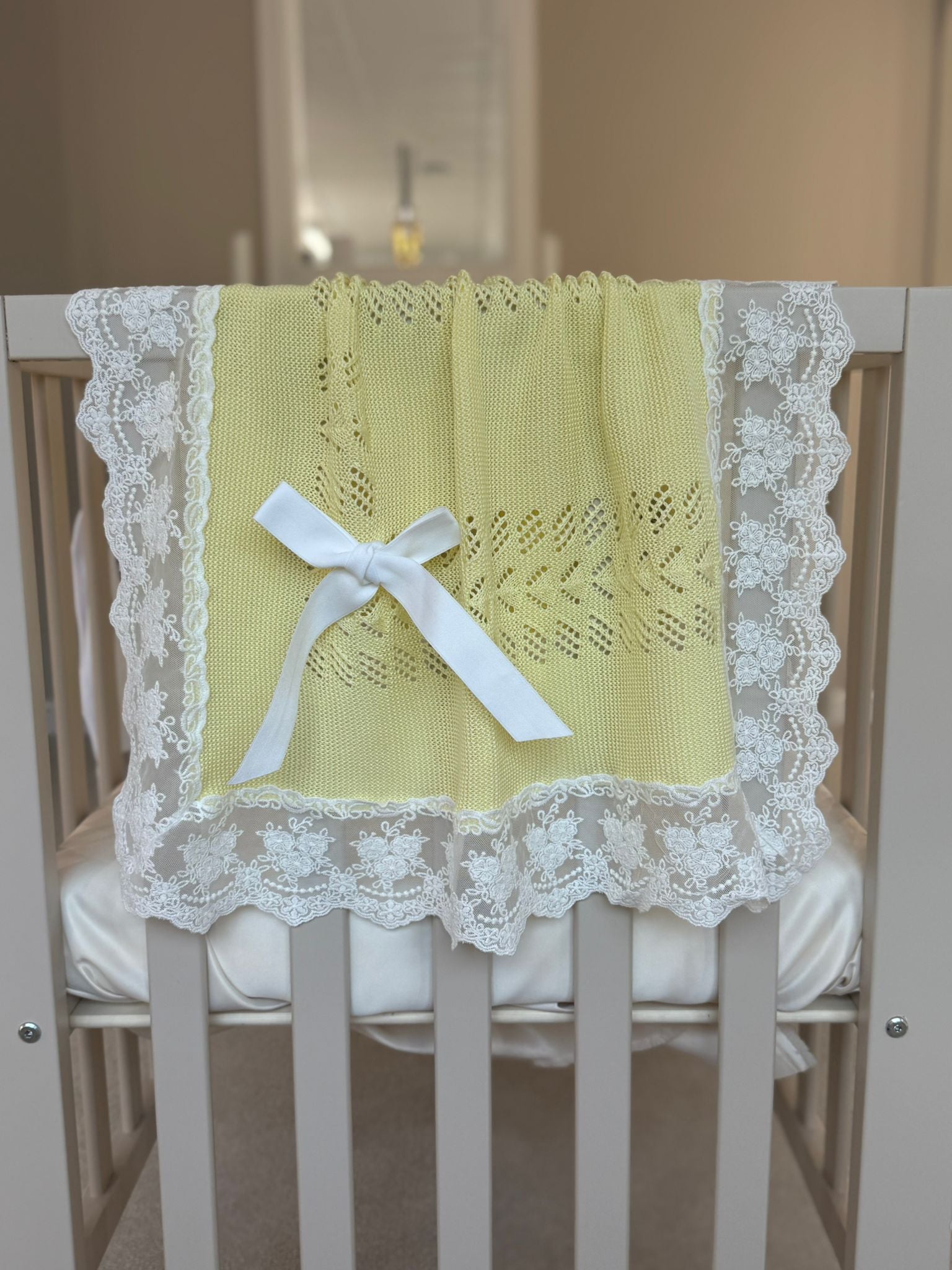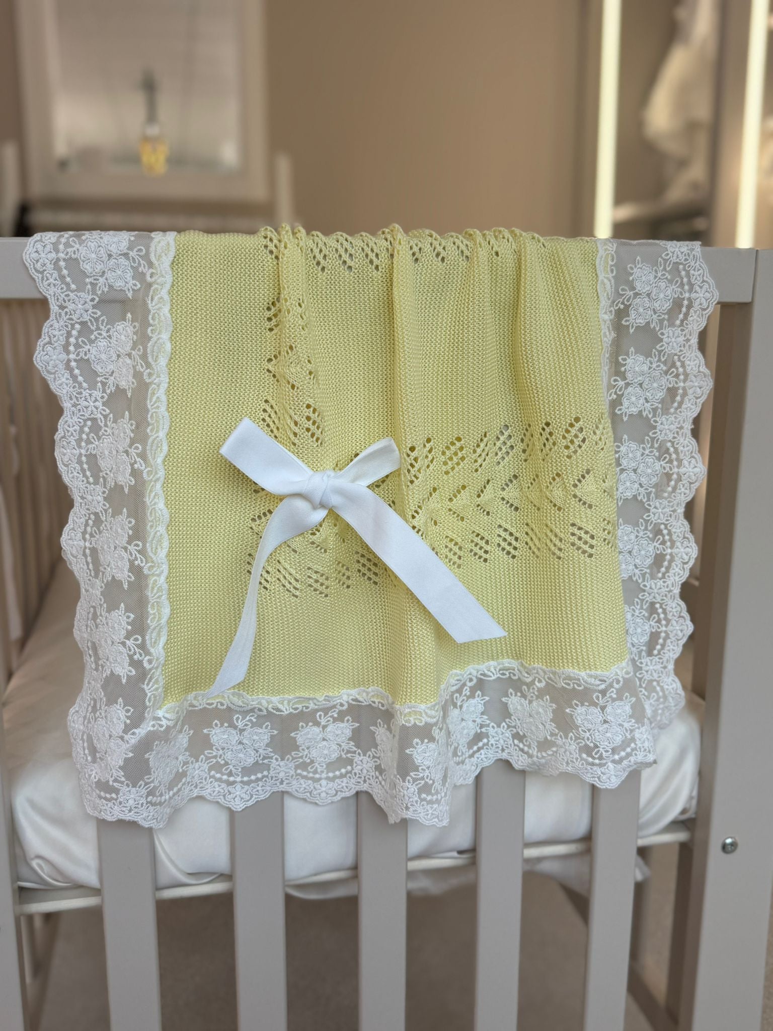 Made from soft, breathable acrylic muslin, this piece is gentle on your baby’s delicate skin and perfect for placing over your shoulder during burping. Finished with intricate lace detailing and delicate knitted accents, it’s designed to be as stylish as it is practical.