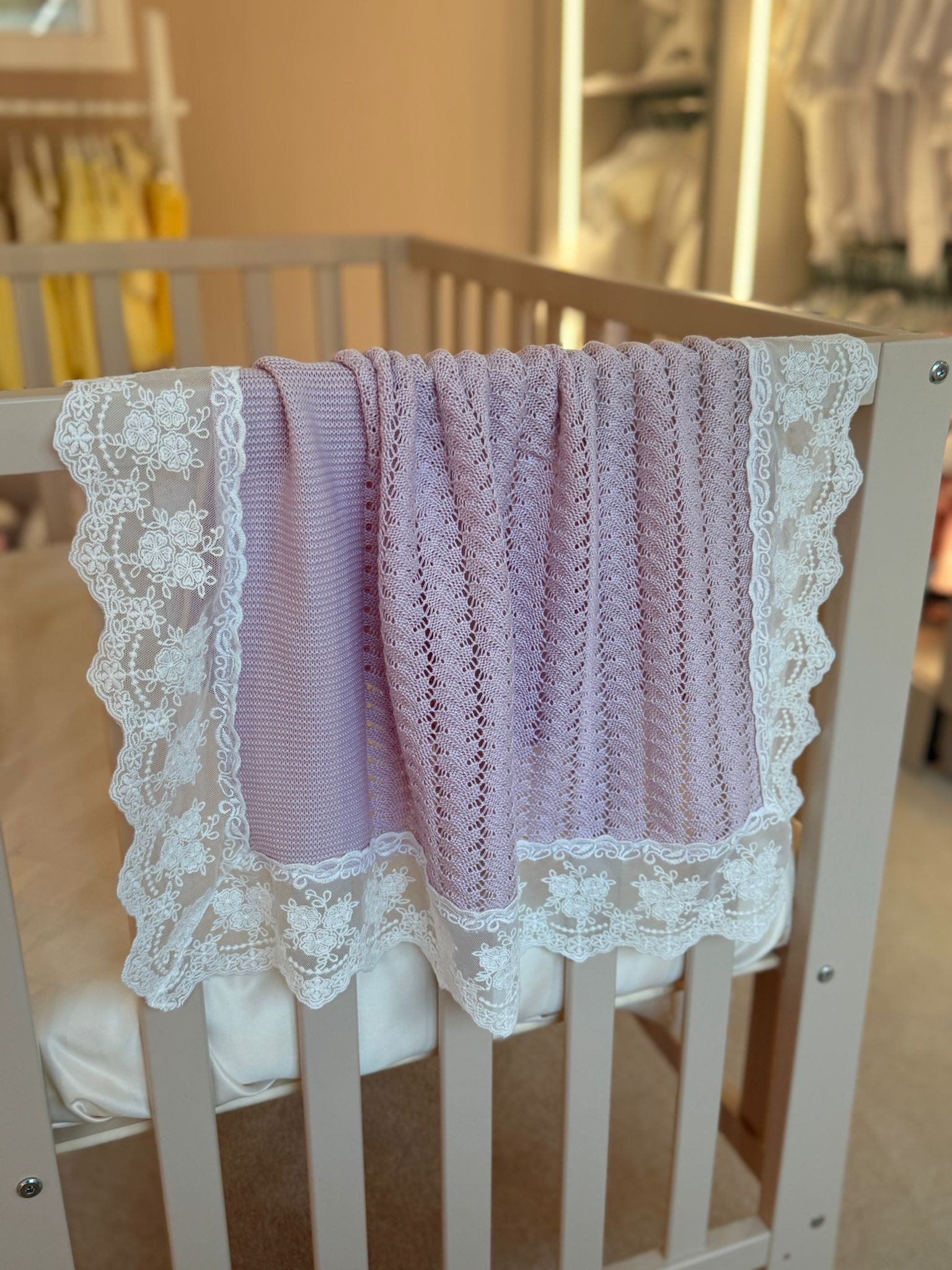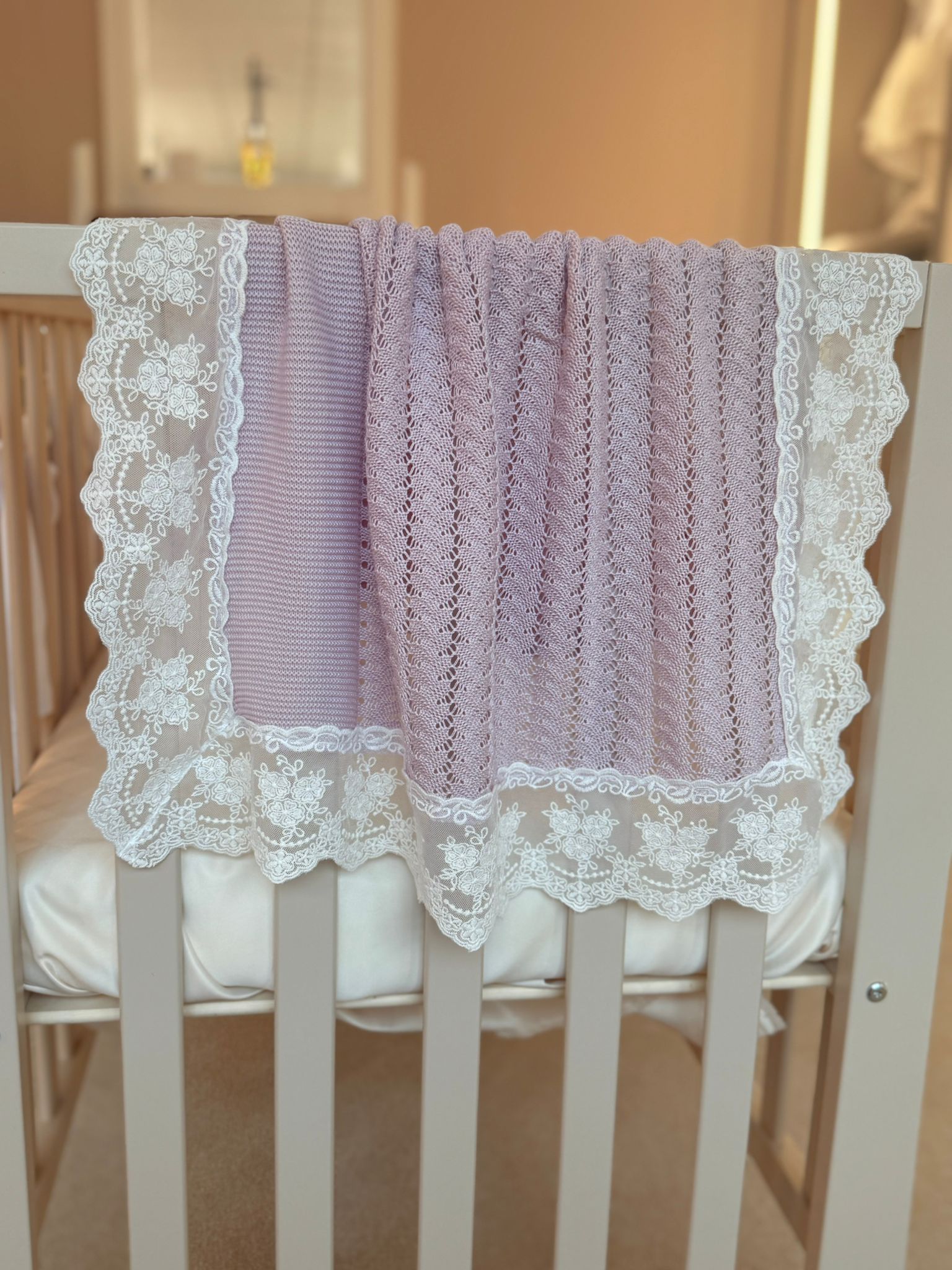 Made from soft, breathable acrylic muslin, this piece is gentle on your baby’s delicate skin and perfect for placing over your shoulder during burping. Finished with intricate lace detailing and delicate knitted accents, it’s designed to be as stylish as it is practical.