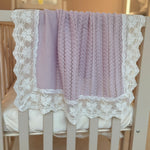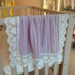 Luxury handmade lilac lace muslin square, perfect for baby burping. Soft breathable acrylic with delicate lace trim. A unique baby essential and beautiful gift.