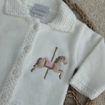 This soft, breathable knit is perfect for layering, keeping your baby cosy while maintaining that traditional, refined look. The standout feature is the charming Horse embroidery, complete with a personalised name banner, making each piece truly special and unique.