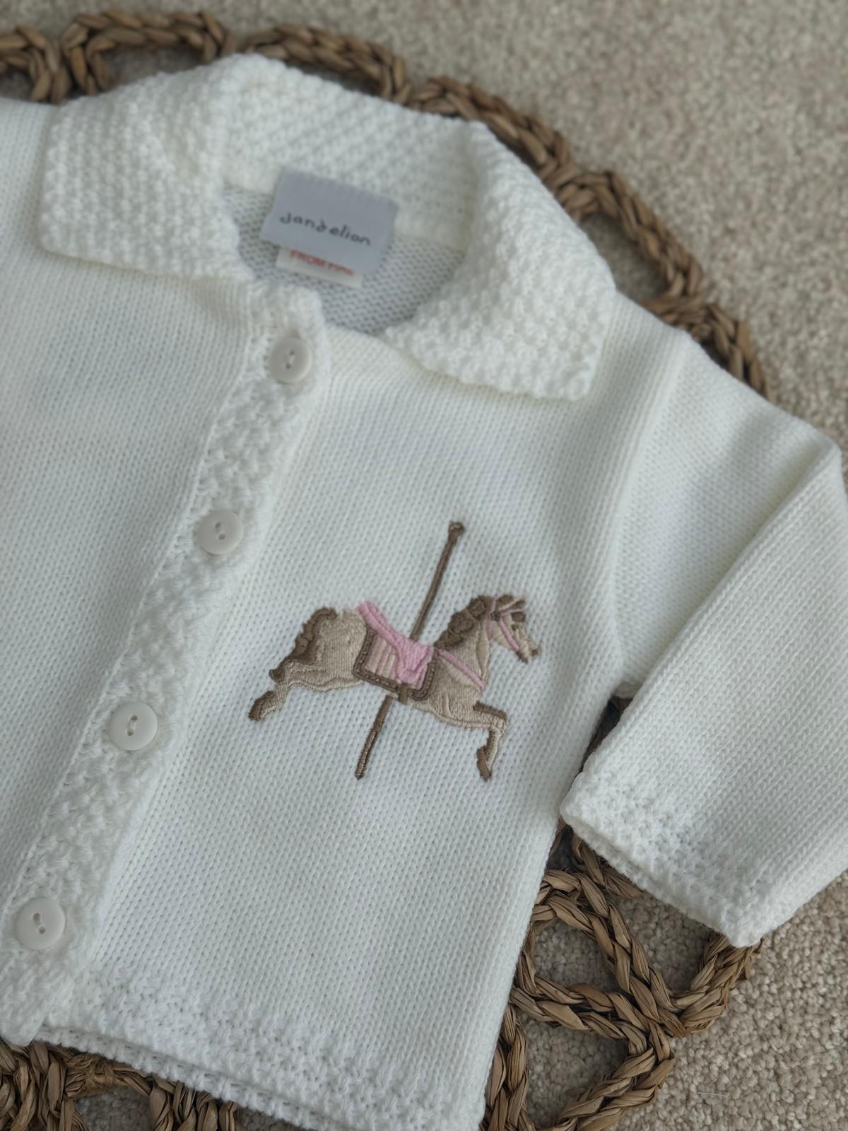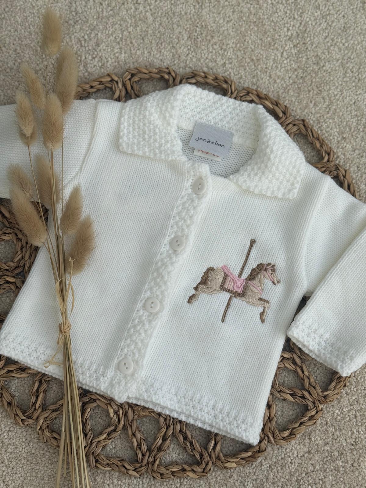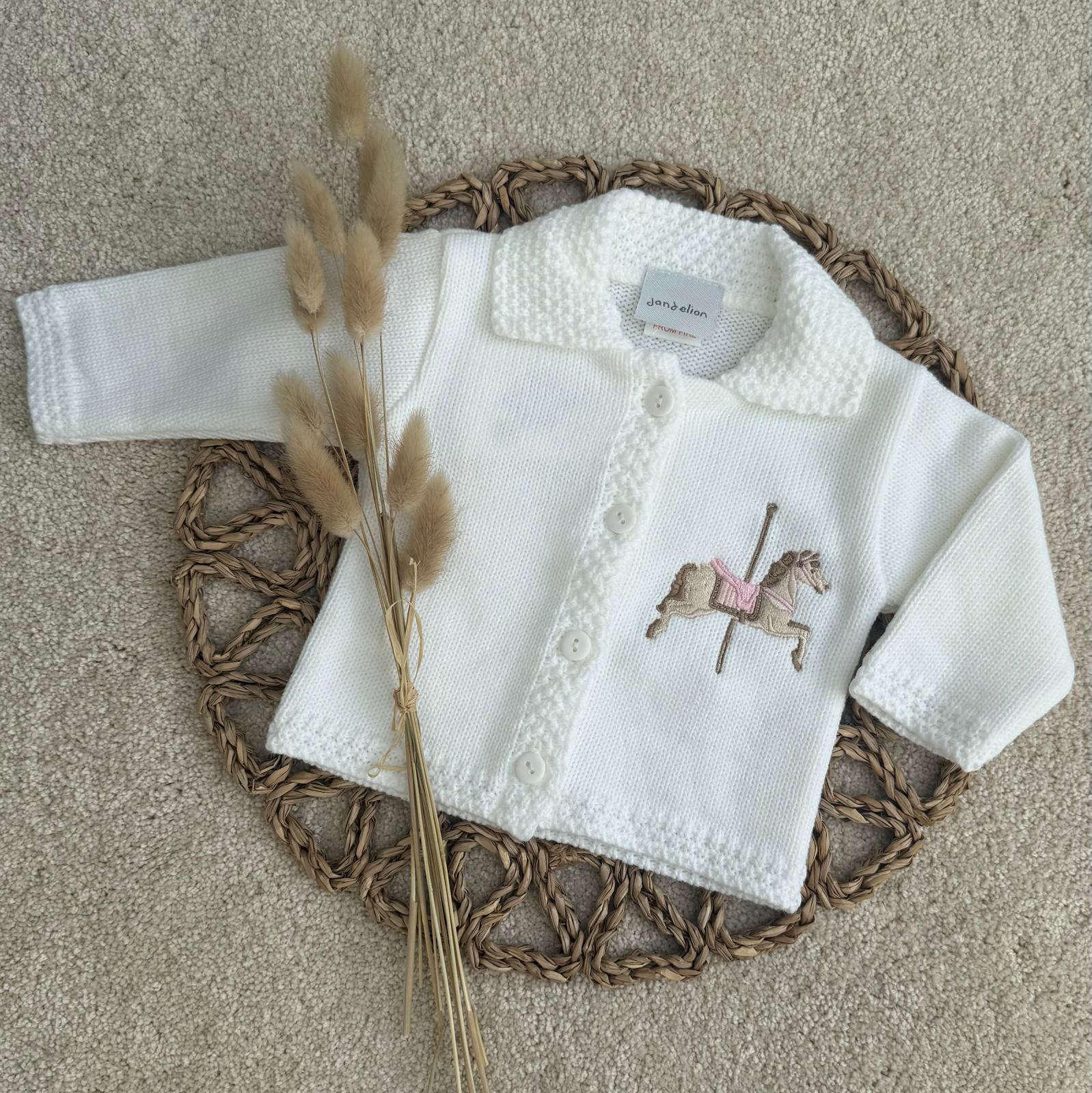 Shop our luxury white knitted baby cardigan with personalised horse embroidery. Soft, traditional baby jacket perfect for gifting & special occasions. UK boutique.
