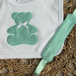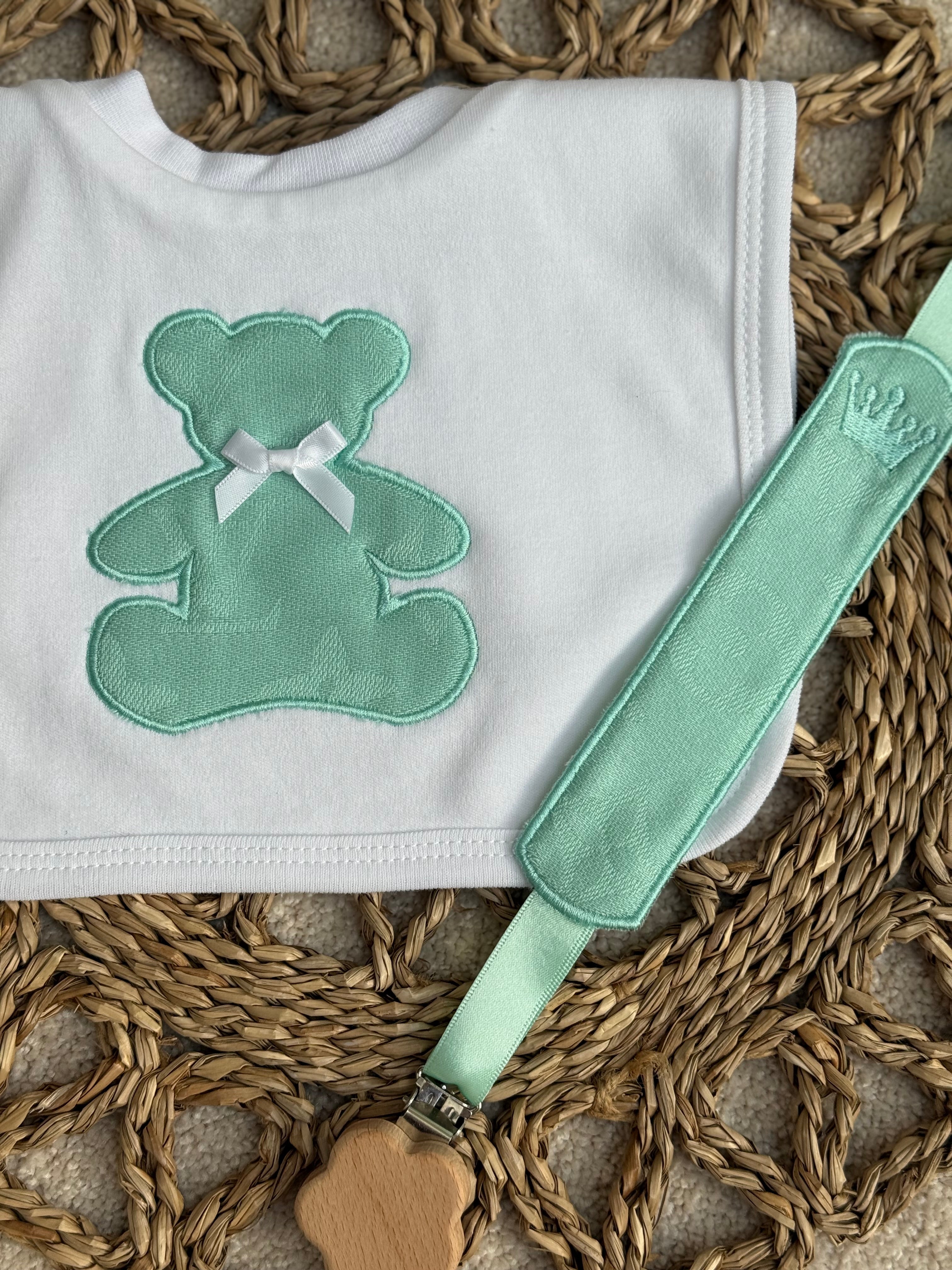 Mint Teddy Appliqué Bib & Handmade Dummy Clip Set