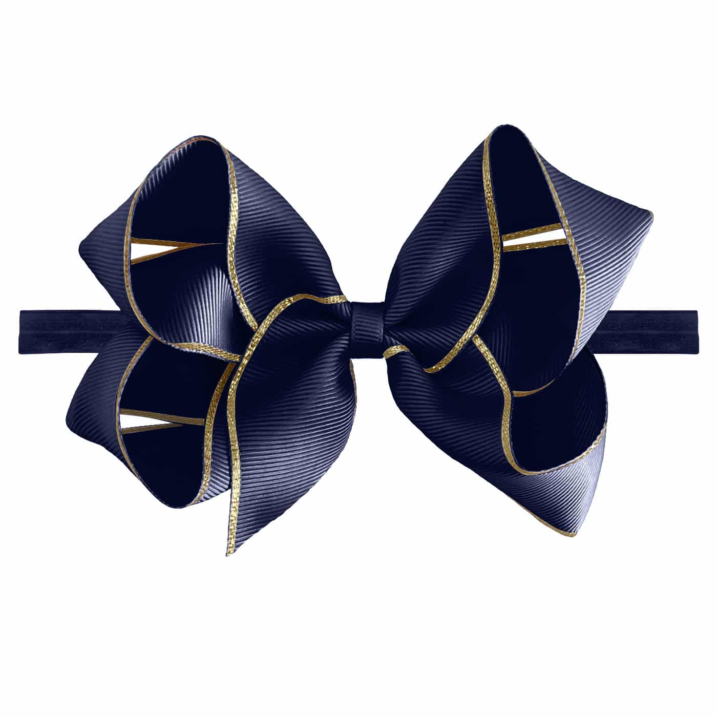 Large grosgrain bow with a gold edge on an elastic hairband.
